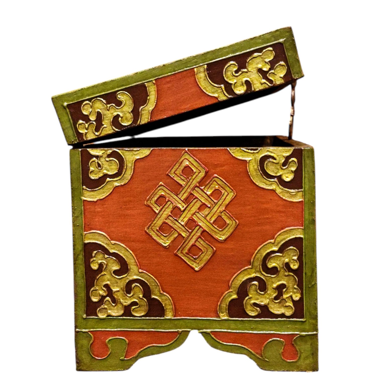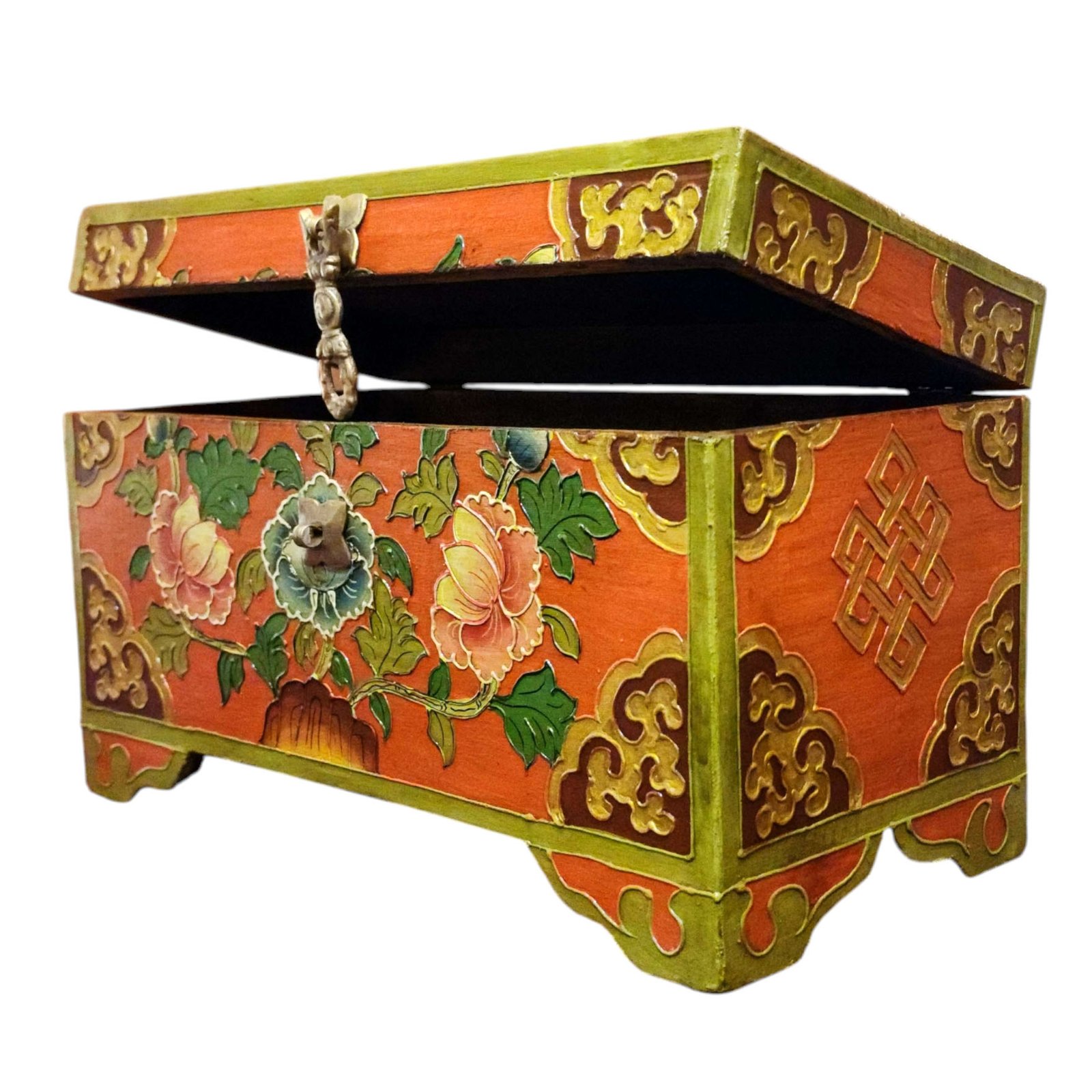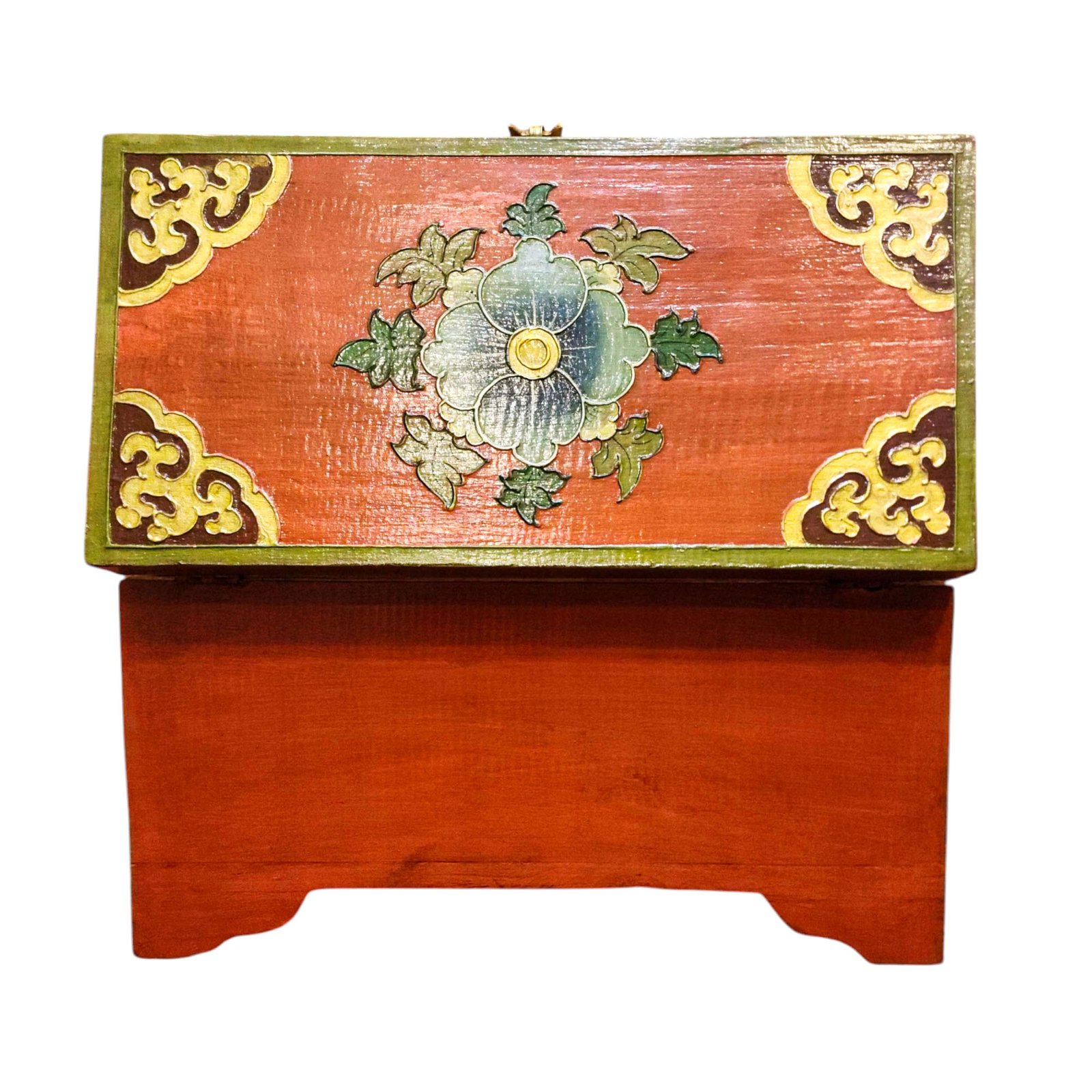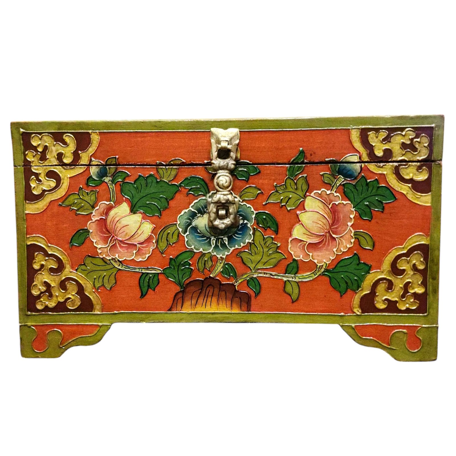 Buddhist Wooden Box with Lotus Design, Tibetan Style with Traditional Colors |
