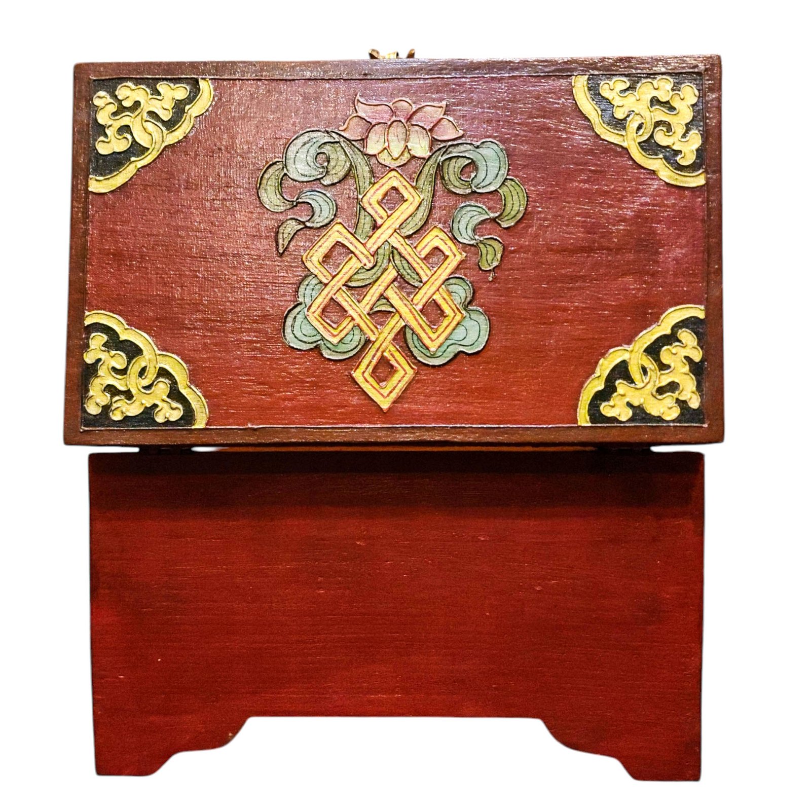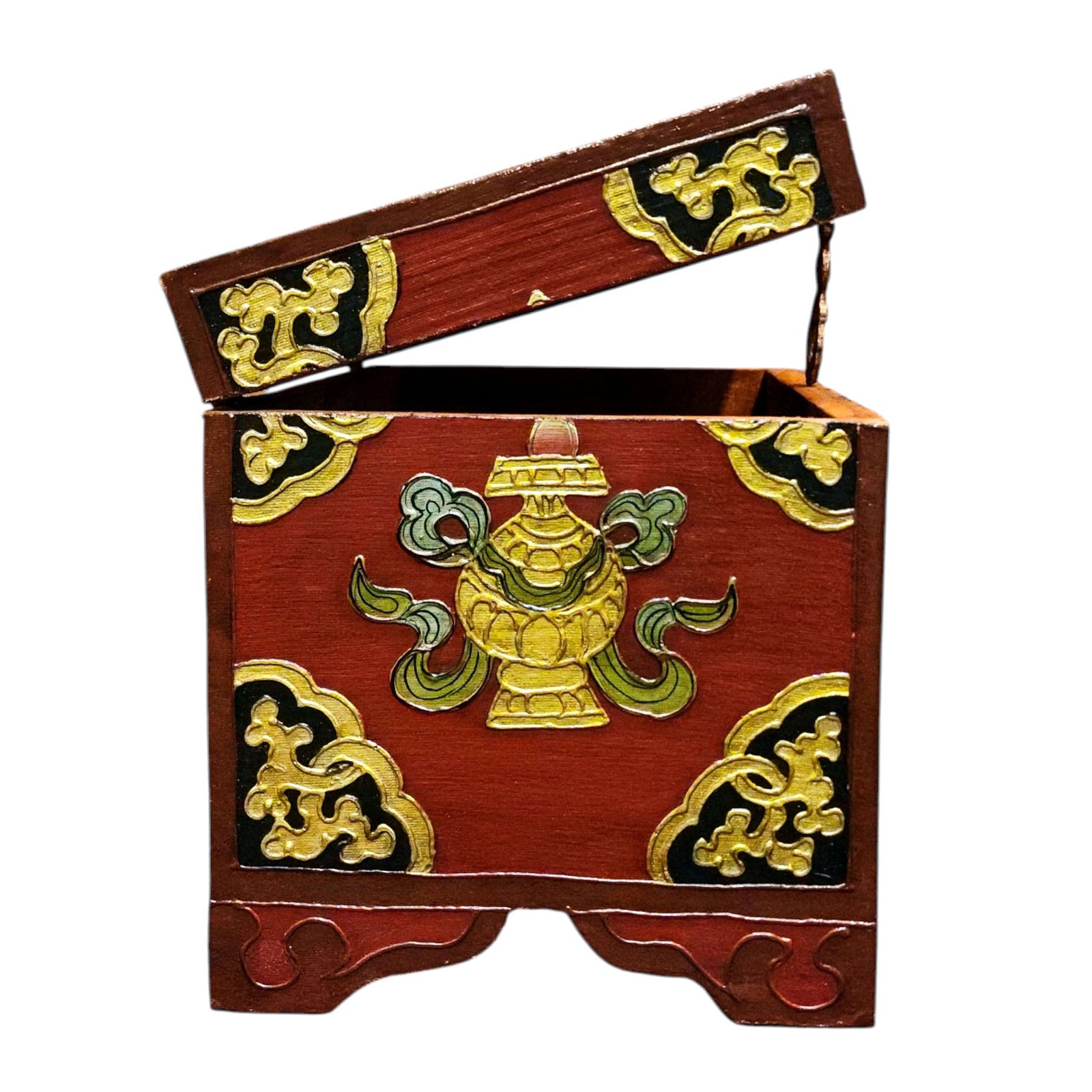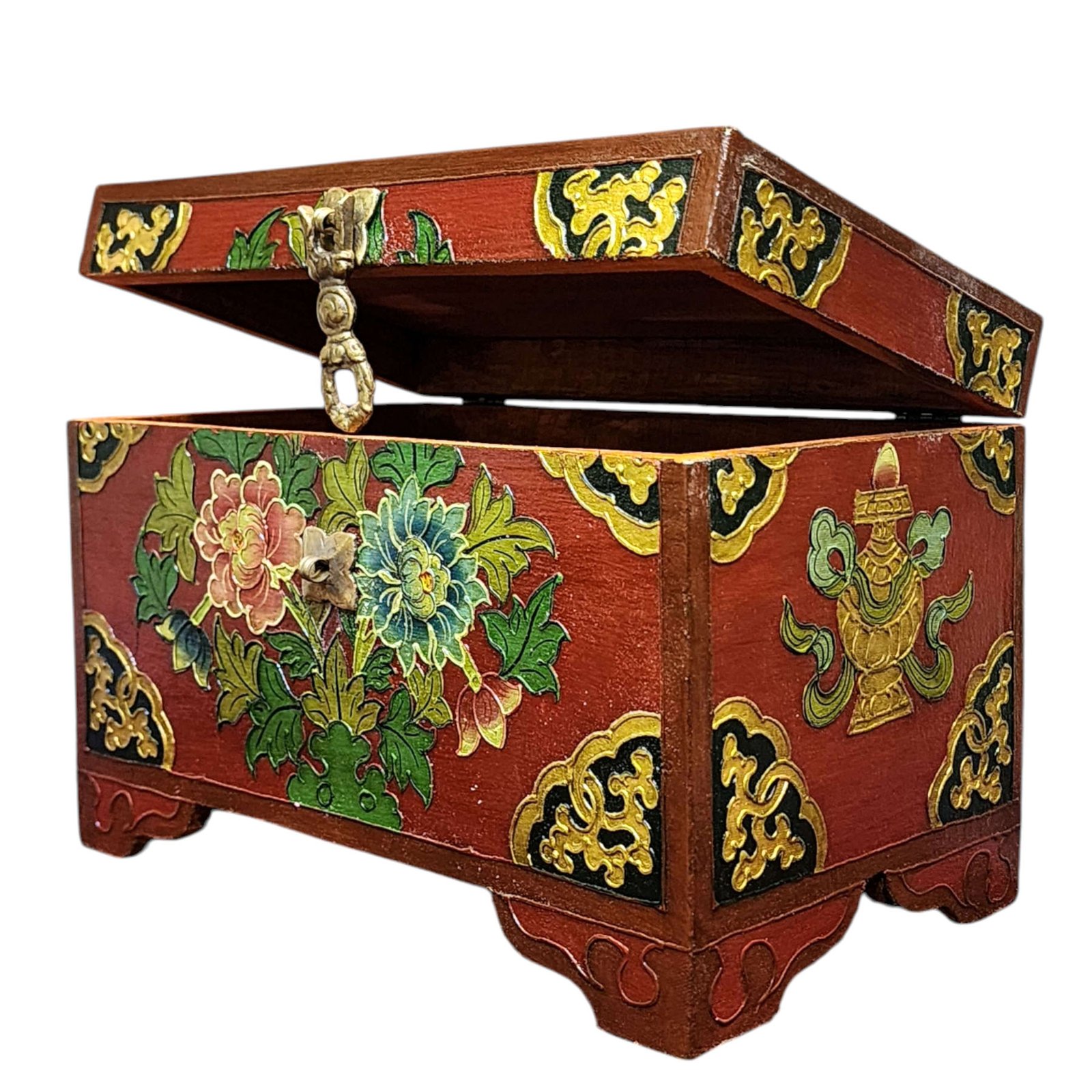 A Tibetan wooden box is a handcrafted storage container made from wood and often adorned with intricate Tibetan motifs and vibrant colors. These boxes are typically crafted by skilled artisans using traditional techniques passed down through generations. The decorations on the box usually include symbols of good fortune, such as lotus flowers, endless knots, dragons, or mythical creatures, and are painted in vivid hues like red, blue, green, and gold. These motifs not only add to the aesthetic appeal but also carry significant cultural and spiritual meanings in Tibetan Buddhism. Read More