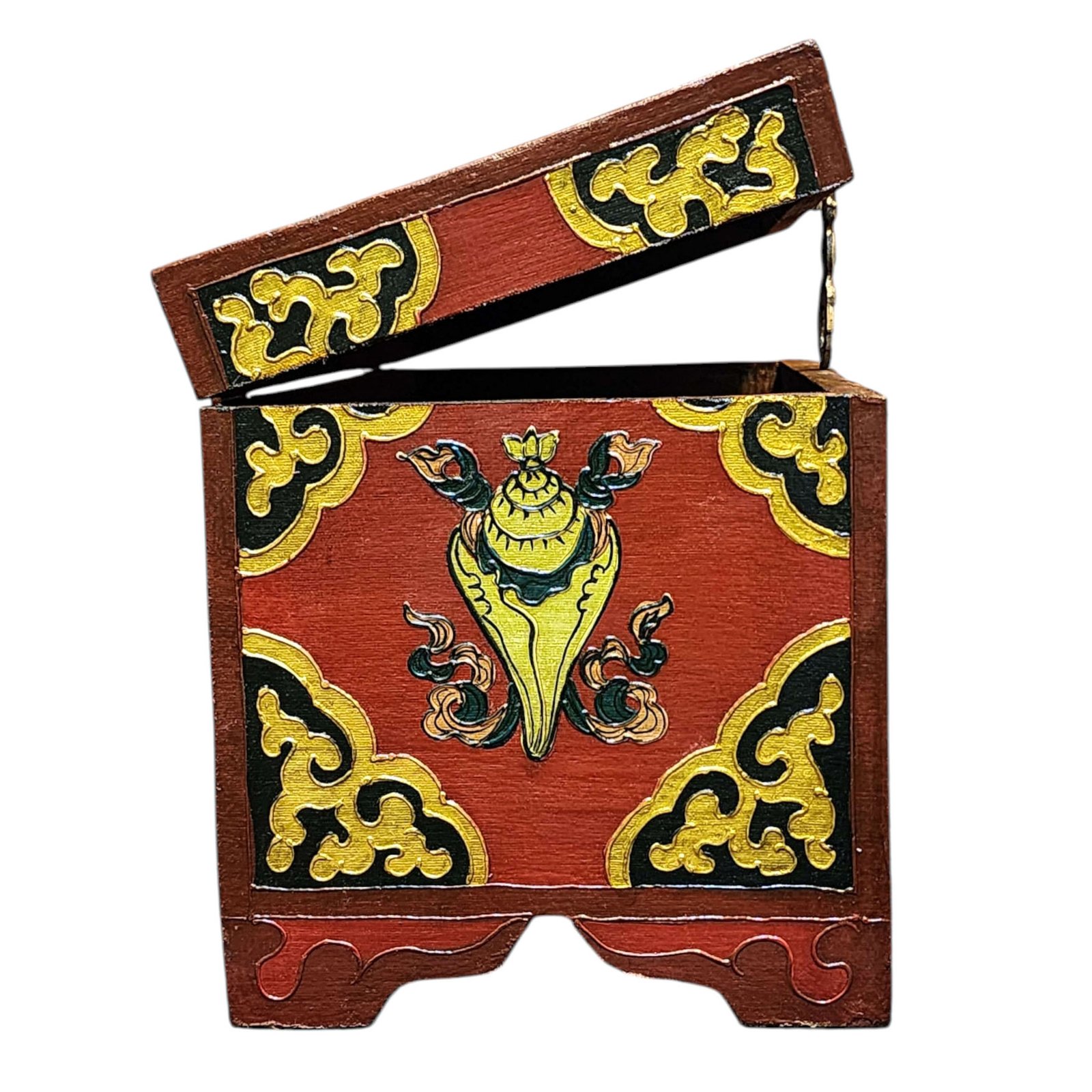 A Tibetan wooden box is a handcrafted storage container made from wood and often adorned with intricate Tibetan motifs and vibrant colors. These boxes are typically crafted by skilled artisans using traditional techniques passed down through generations. The decorations on the box usually include symbols of good fortune, such as lotus flowers, endless knots, dragons, or mythical creatures, and are painted in vivid hues like red, blue, green, and gold. These motifs not only add to the aesthetic appeal but also carry significant cultural and spiritual meanings in Tibetan Buddhism. Read More