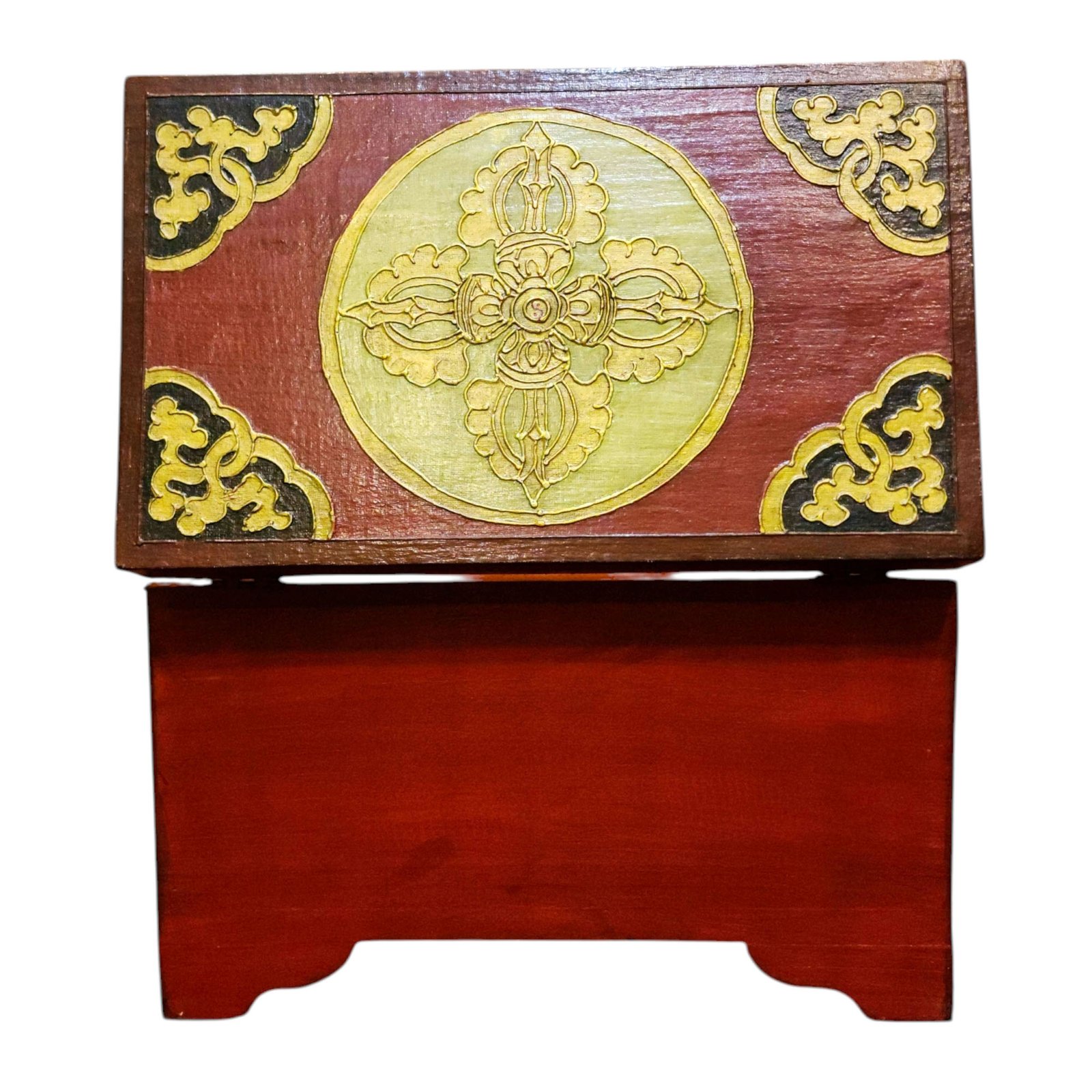 A Tibetan wooden box is a handcrafted storage container made from wood and often adorned with intricate Tibetan motifs and vibrant colors. These boxes are typically crafted by skilled artisans using traditional techniques passed down through generations. The decorations on the box usually include symbols of good fortune, such as lotus flowers, endless knots, dragons, or mythical creatures, and are painted in vivid hues like red, blue, green, and gold. These motifs not only add to the aesthetic appeal but also carry significant cultural and spiritual meanings in Tibetan Buddhism. Read More