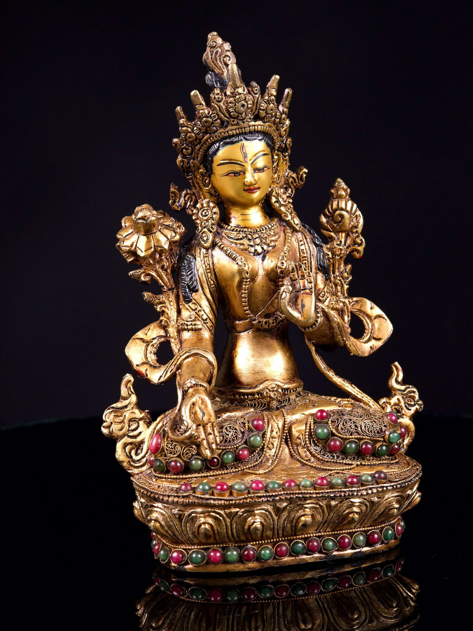 White Tara, Buddhist Handmade Statue with Siku Design, Full Gold Plated, Stone Setting, Face Painted , Goddess of longevity, healing, and serene compassion