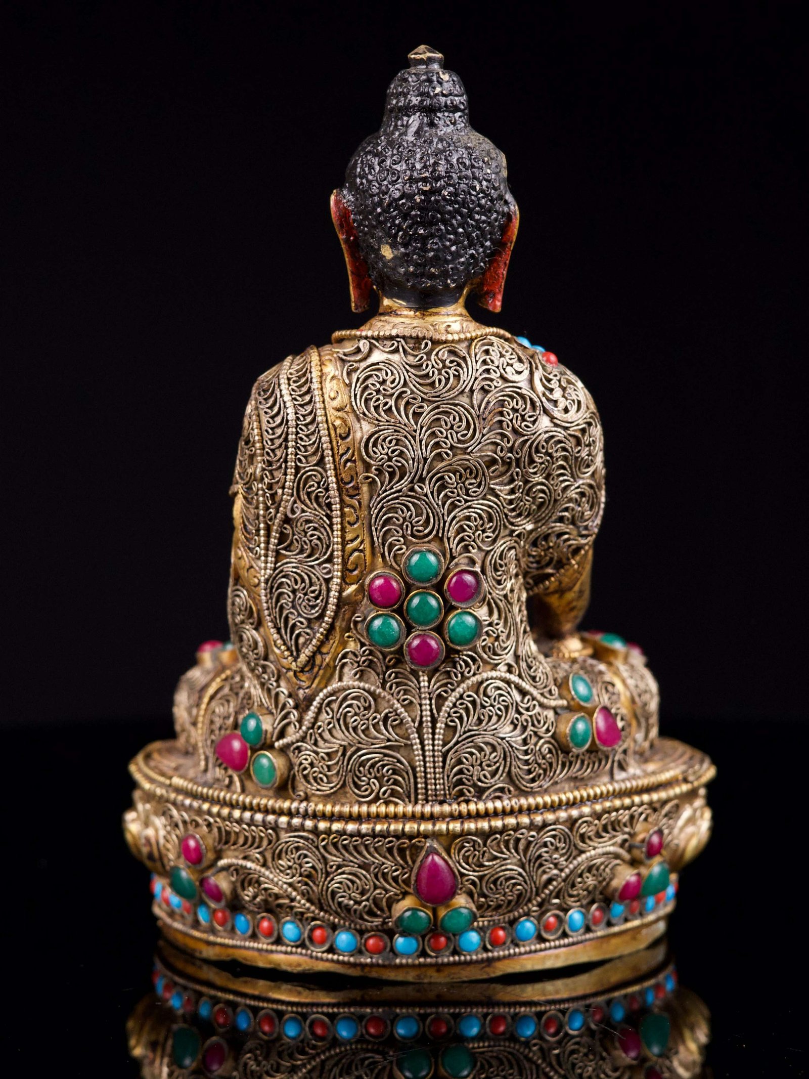 This Shakyamuni Buddha siku detailing, Siku is a process of putting patterns in the product by wielding copper, silver, or other metal wires, Creating various eye-catchy designs. this type of craftsmanship is unique to Nepali culture. and is made by very skillful artists of Nepal