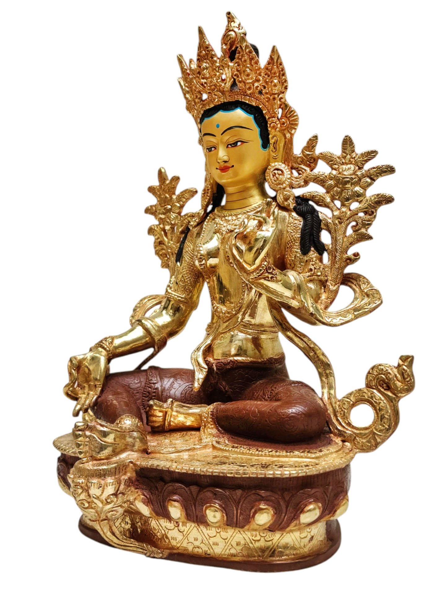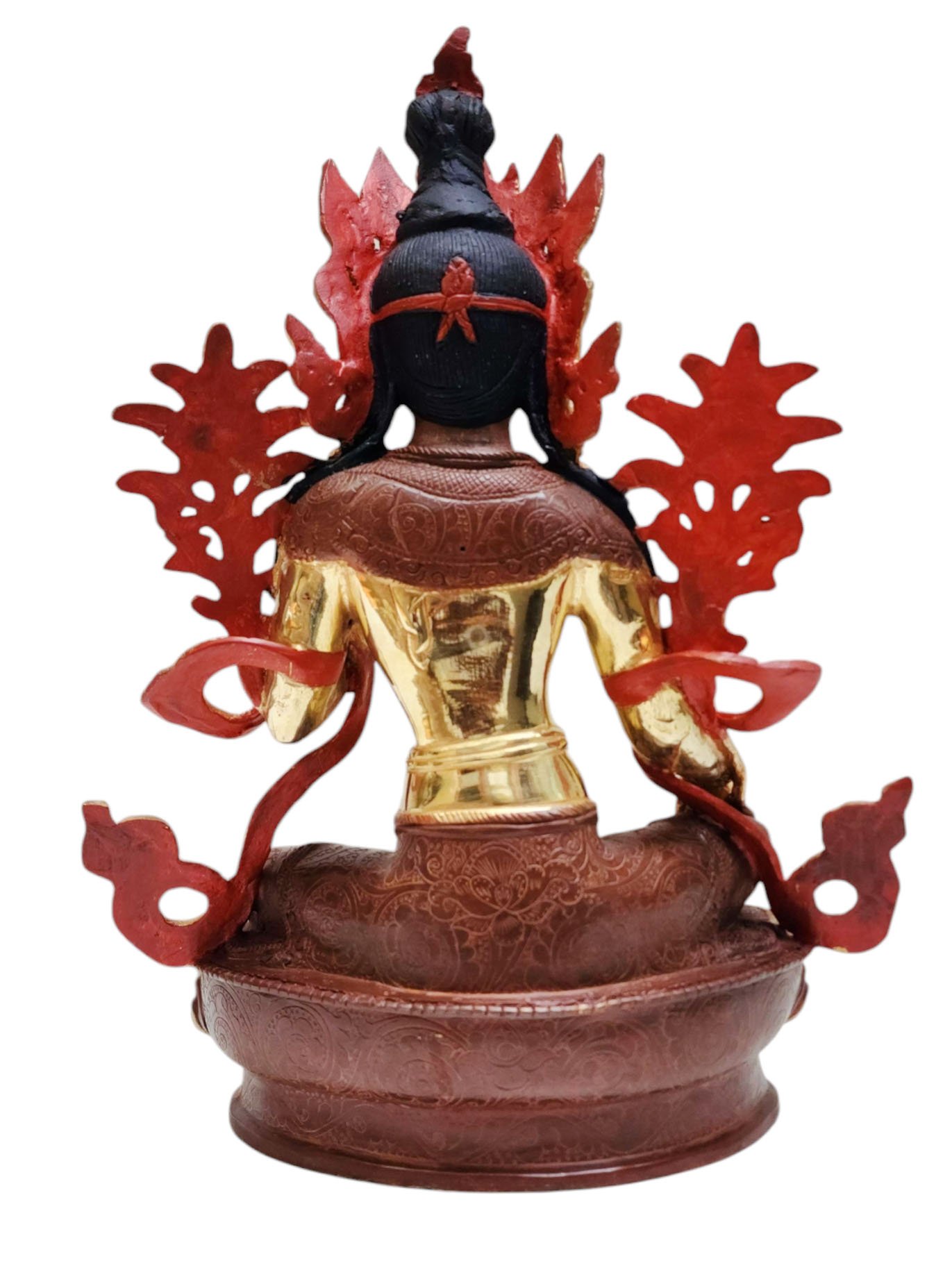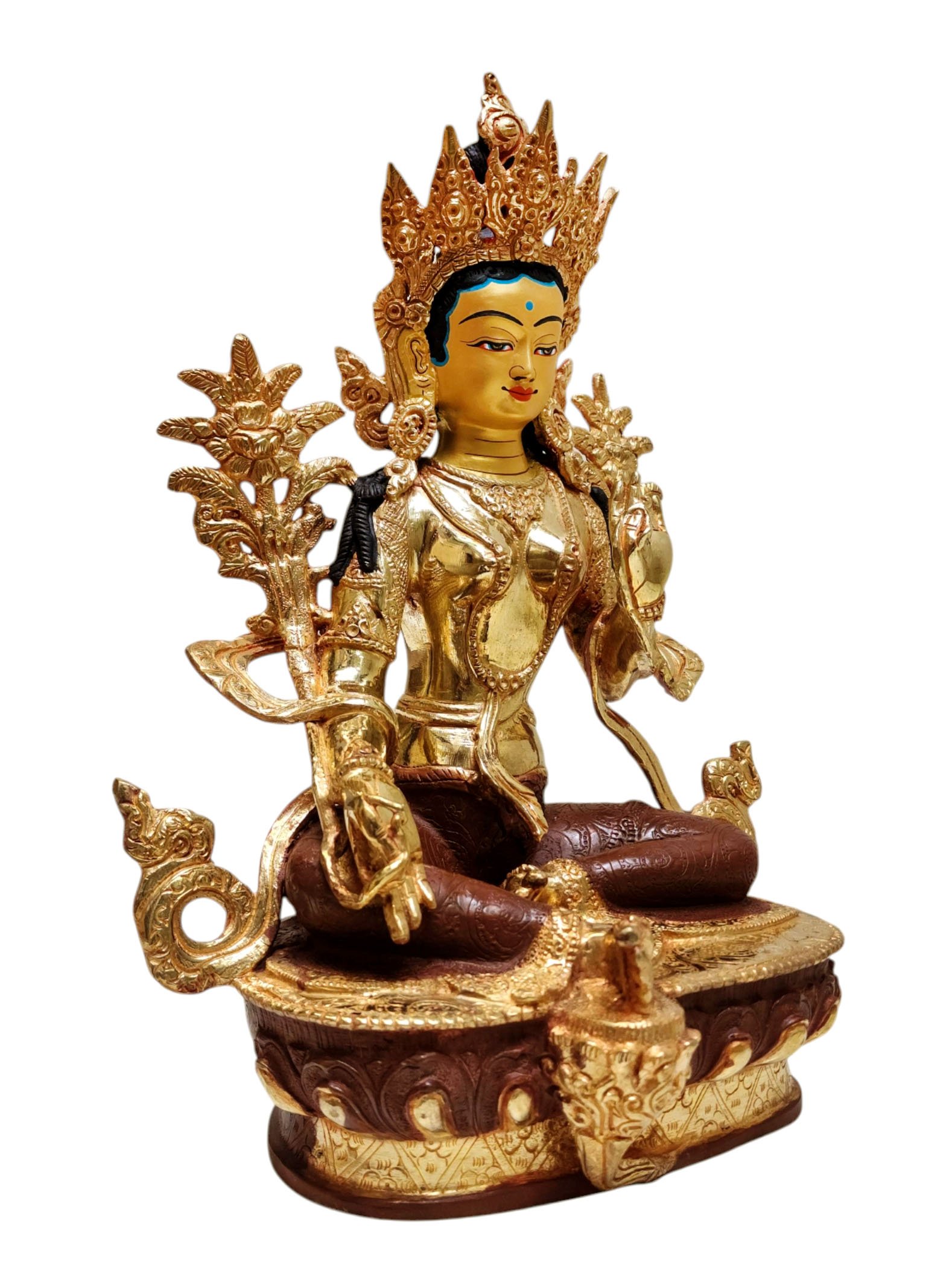 This Green Tara has a Partly gold-plated finish. Partly fire gold gilding, a common practice in Nepali handicrafts. This technique is skillfully employed by artisans to create intricate designs on various metal objects, including statues, jewelry, and decorative items. Through a process, a mask or resist is applied to safeguard specific areas from the gold plating. The object is then subjected to high temperatures, allowing the gold to beautifully adhere to exposed surfaces using a combination of heat and pressure.