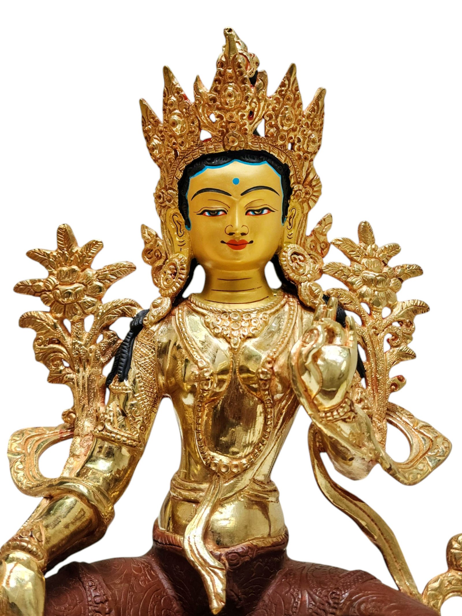 The face of Green Tara is painted with gold to enhance its significant features, particularly the eyes, and lips. This detailed painting is essential as it brings forth the crucial attributes of the expression of eyes and lips that metal carving alone cannot capture.