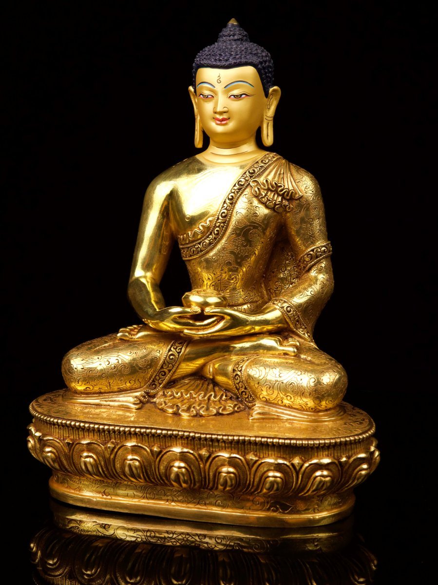 This Amitabha Buddha is finished with full gold plating. also known as mercury gold plating or fire gold plating. This traditional technique involves the application of a genuine layer of gold onto the Amitabha Buddha. Referred to as mercury gold plating, it is considered the correct and authentic form of gold plating in Nepal. Despite being more expensive than electroplating, this traditional mercury gold plating is gaining popularity again in Nepal. People are drawn to its authenticity, longevity, and the unmatched beauty it brings to the Amitabha Buddha. The resurgence of interest in this traditional form of gold plating reflects a growing appreciation for the craftsmanship and cultural heritage of Nepal Read More
