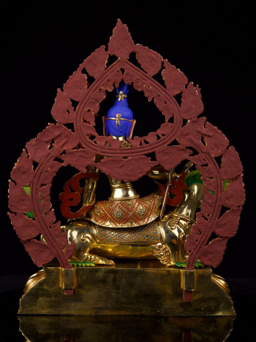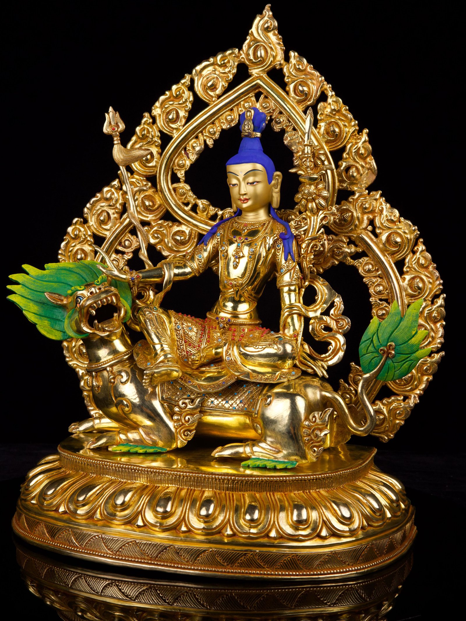 13 cm Simhanada Lokeshvara, Buddhist Miniature Statue, Full Gold Plated Finish, Stone Setting, Lapis Inlay