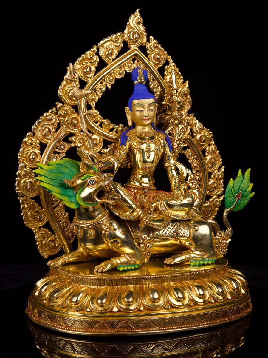 He is usually depicted with eight arms and three eyes, seated majestically upon a lion throne, surrounded by a radiant halo of flames that represent the burning away of negative karma and suffering. His primary hands hold a vajra and a lotus, while others hold sacred objects such as a trident, bow, arrow, rosary, and water pot, each representing skillful means and spiritual power.