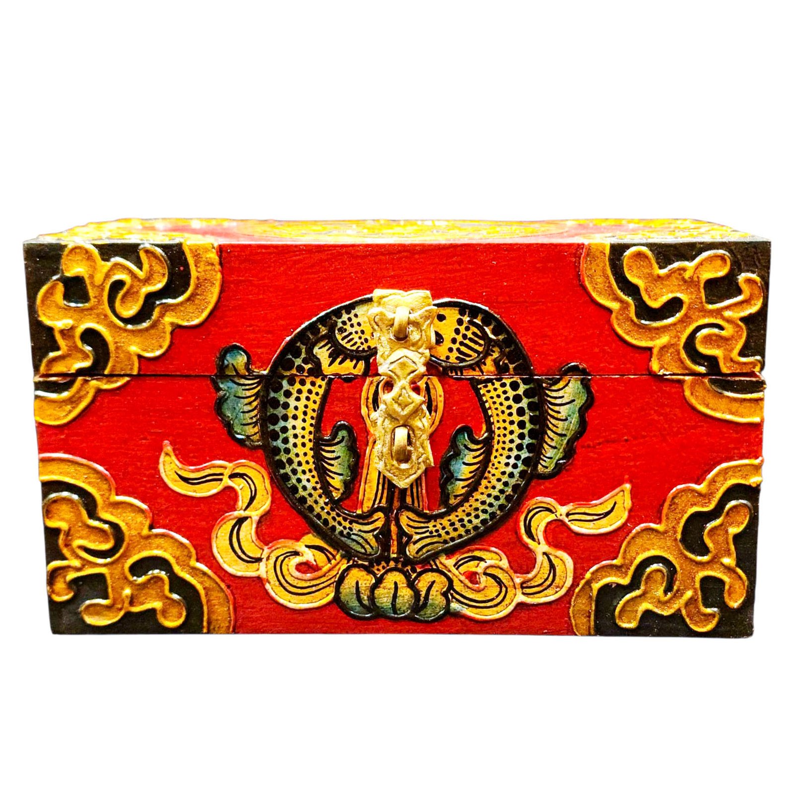 A Tibetan wooden box is a handcrafted storage container made from wood and often adorned with intricate Tibetan motifs and vibrant colors. These boxes are typically crafted by skilled artisans using traditional techniques passed down through generations. The decorations on the box usually include symbols of good fortune, such as lotus flowers, endless knots, dragons, or mythical creatures, and are painted in vivid hues like red, blue, green, and gold. These motifs not only add to the aesthetic appeal but also carry significant cultural and spiritual meanings in Tibetan Buddhism. Read More