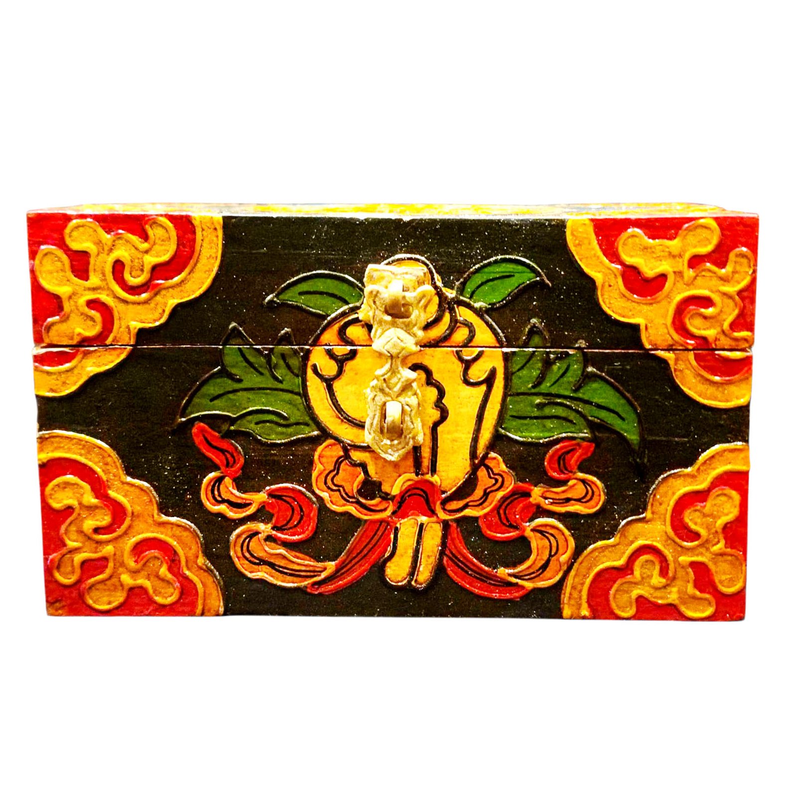 Buddhist Wooden Box with Conch Shell Design, Tibetan Style with Traditional Colors |