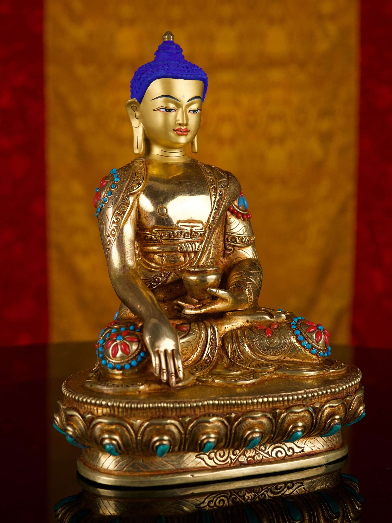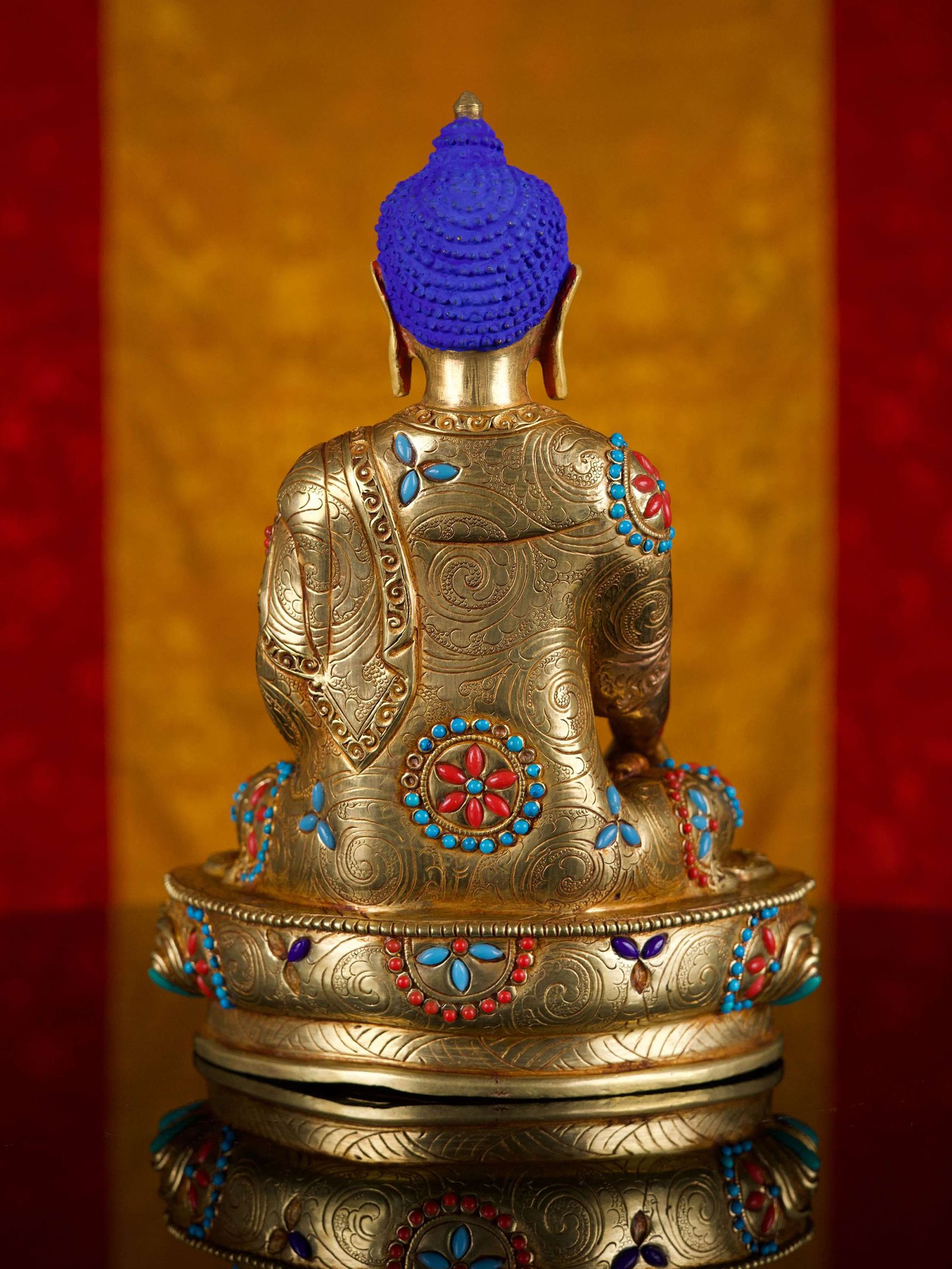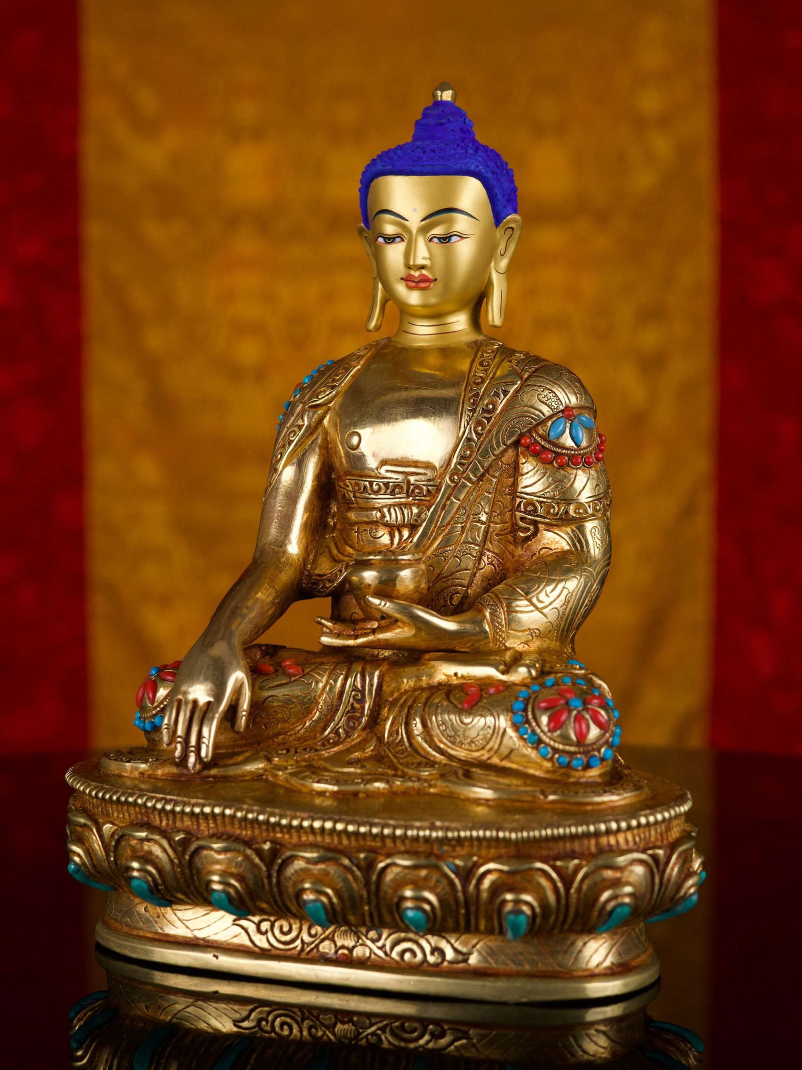 The SHAKYAMUNI BUDDHA is adorned with an exquisite array of semi-precious stones, including turquoise, coral, and lapis lazuli. These stones are carefully selected and meticulously placed on the SHAKYAMUNI BUDDHA's surface, adding a touch of opulence and enhancing its overall beauty. Each stone is thoughtfully positioned using a high-quality adhesive, ensuring secure and long-lasting attachment. The vibrant colors and unique patterns of the stones create a captivating contrast against the backdrop of the SHAKYAMUNI BUDDHA, elevating its visual appeal and making it truly eye-catching. Read More