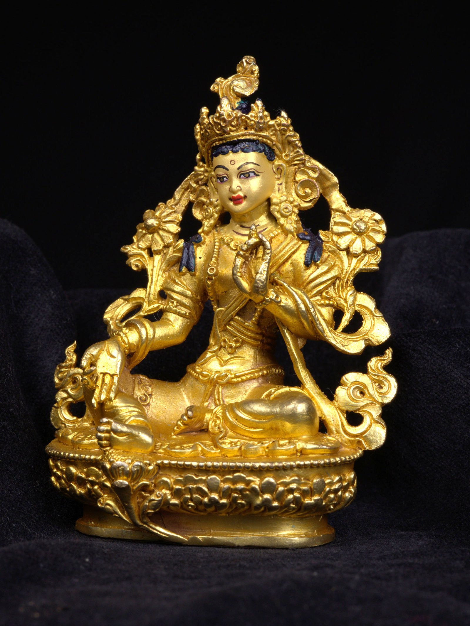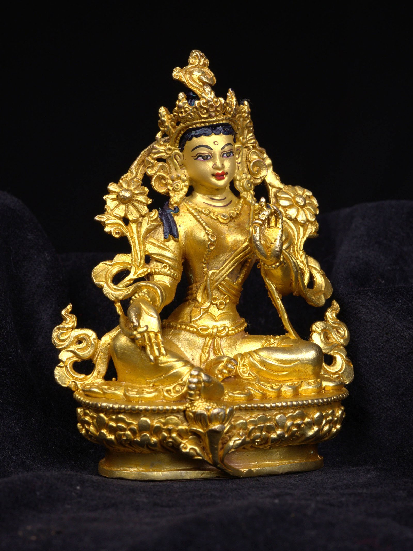 Green Tara, Buddhist Miniature Statue, Full Gold Plated, Face Painted , Goddess of Compassion, Protection, and Swift Action