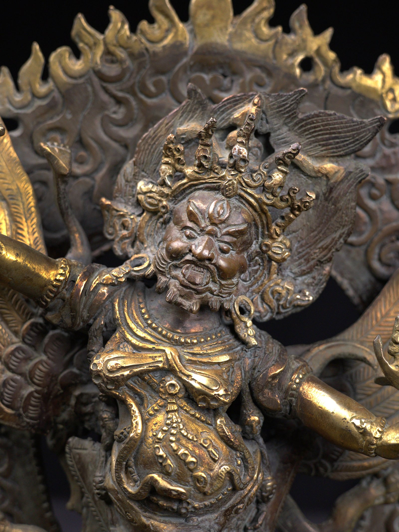 Vajrakila's two top left hands both hold Vajra sceptres. The upper nine pronged [often open pronged] sceptre signifies his wrathful aspect, the smaller lower sceptre his peaceful nature. Vajrakila's top right hand is in threatening Tarjani hand gesture [Skt. mudra] with the index finger raised releasing a blaze of wisdom fire. His middle right-hand brandishes a trident [Skt. trisula] with three severed & impaled heads in deteriorating stages of decay. [The top having become a skull]. The blue head represents hatred, the redhead greed & the white skull the overriding cause of human suffering, delusion. His middle right-hand brandishes a small khartvanga trident. The staff is traditionally made of red sandalwood. The flame issuing from the middle prong [wisdom fire] symbolises the transmutation of the three principal causes of suffering into enlightened awareness. The white silk scarf depicts a funeral shroud that represents victory over the power of suffering death. He has two outstretched Garuda wings which represent his supremacy over the primordial underlying energy of the earth and her water. This subterranean energy is represented by naga serpents which the Garuda is held to have authority over. His association with primordial energy is also depicted in his horse neck, face whiskers, symbolic mane & similarity to Garuda-winged deity Hayagriva.