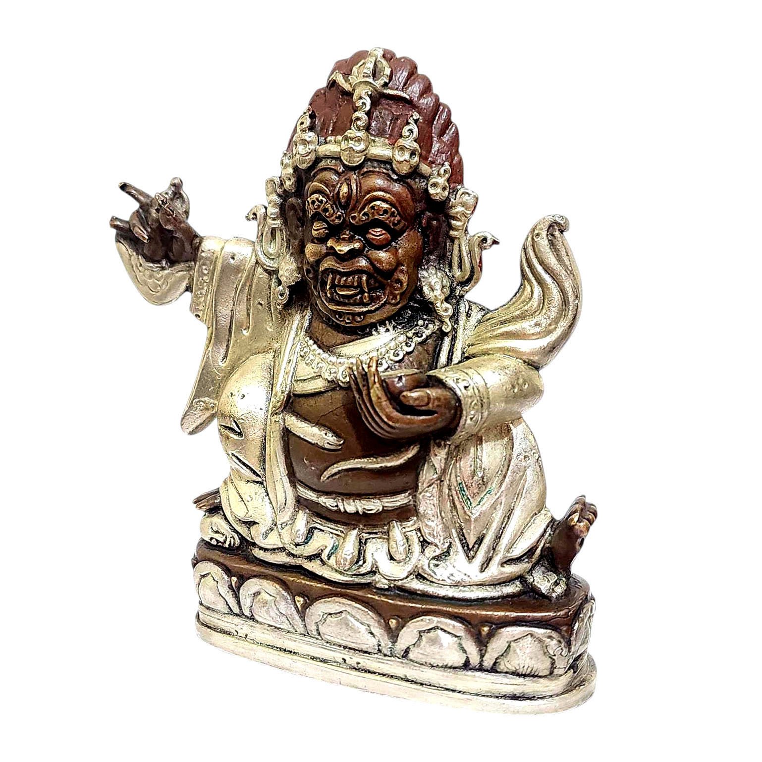 Buddhist Miniature Statue of Mahakala Panjaranatha, Kajupa Mahakala, Silver and Chocolate Oxidized , The Lord of the Tent, fierce protector of sacred spaces and teachings