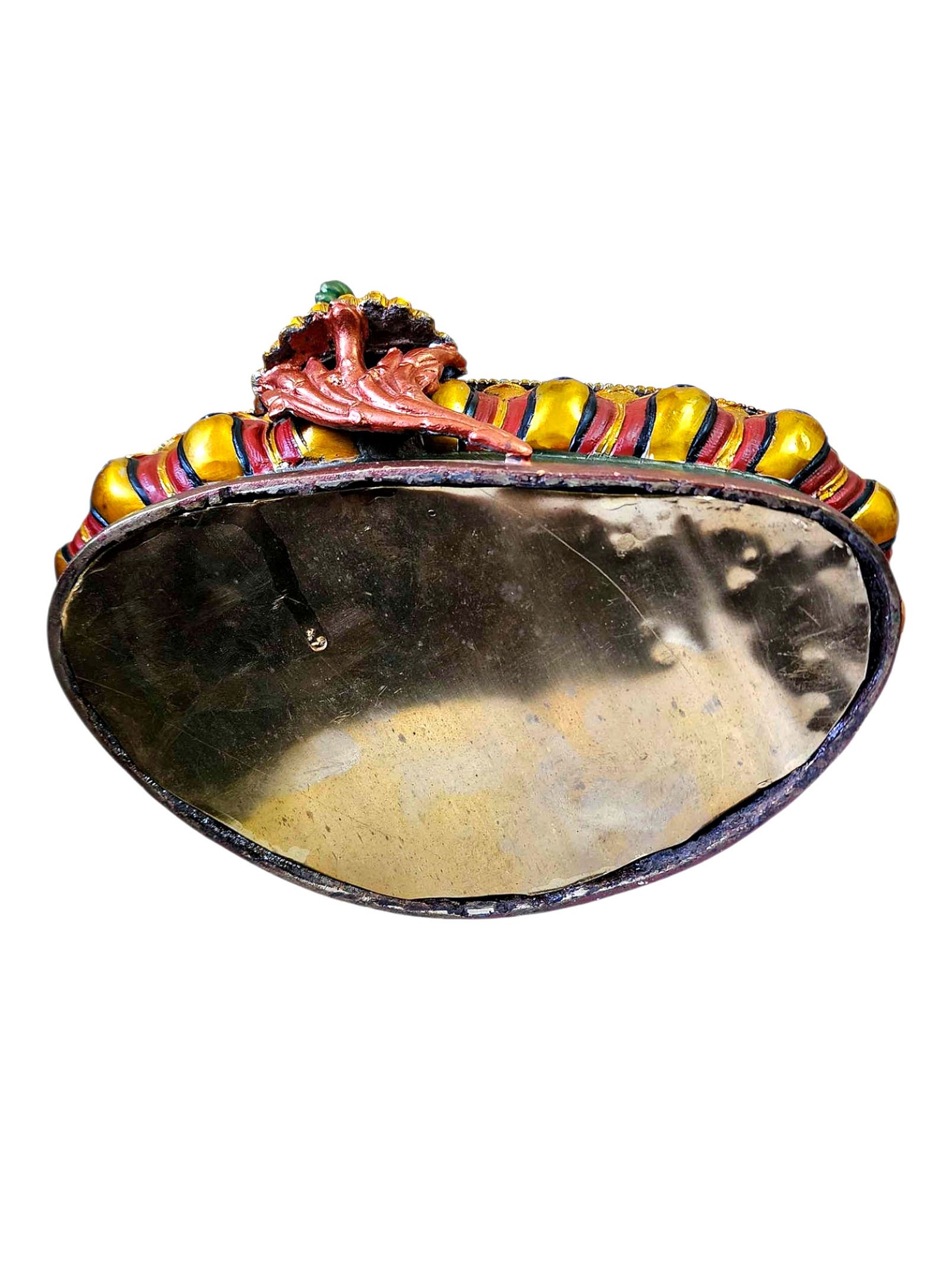 The face of Green Tara is painted with gold to enhance its significant features, particularly the eyes, and lips. This detailed painting is essential as it brings forth the crucial attributes of the expression of eyes and lips that metal carving alone cannot capture.