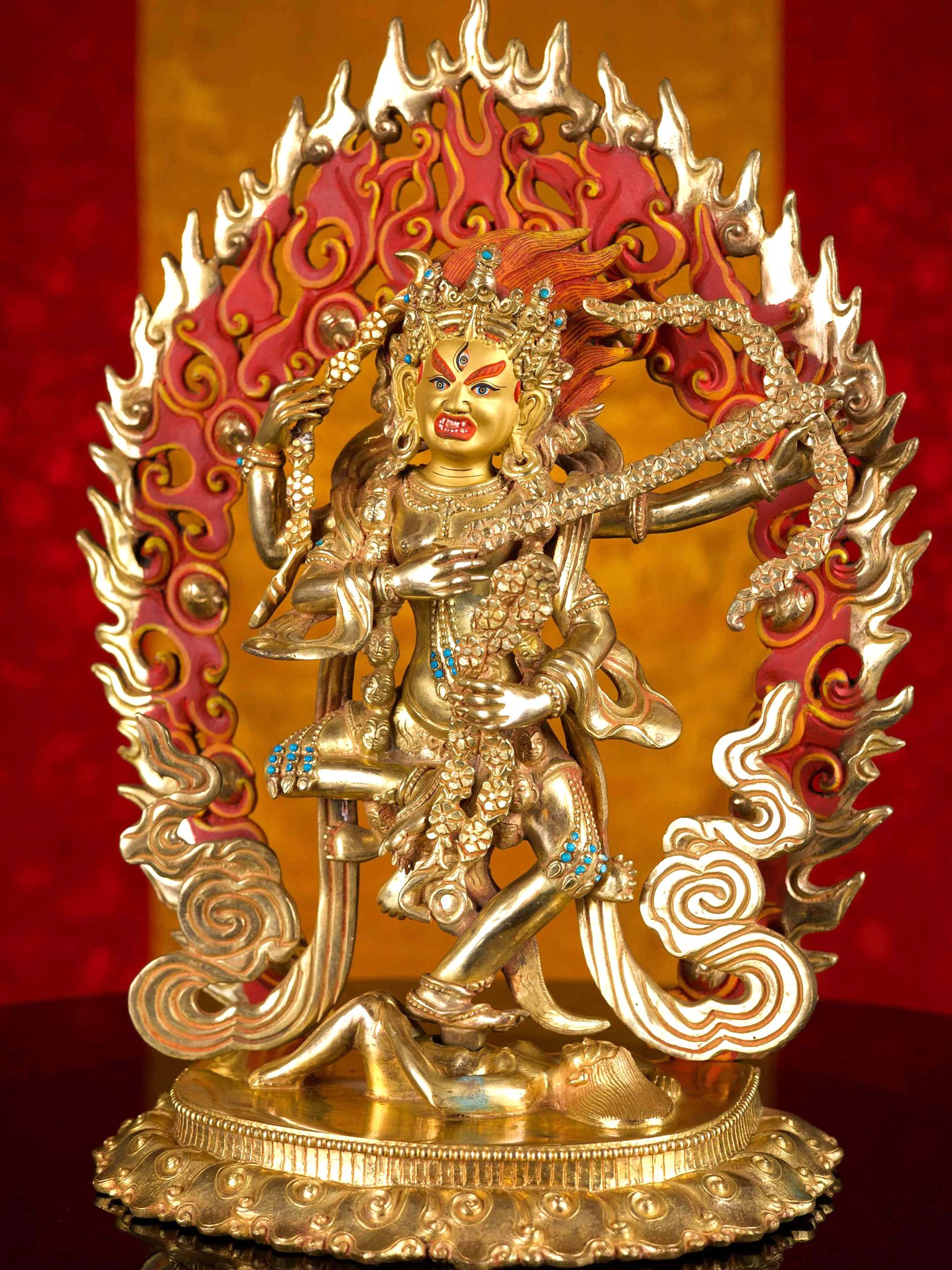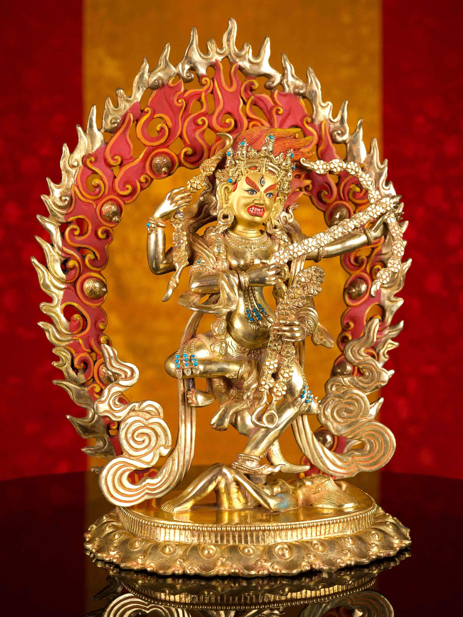 This Kurukulla is finished with full gold plating. also known as mercury gold plating or fire gold plating. This traditional technique involves the application of a genuine layer of gold onto the Kurukulla. Referred to as mercury gold plating, it is considered the correct and authentic form of gold plating in Nepal. Despite being more expensive than electroplating, this traditional mercury gold plating is gaining popularity again in Nepal. People are drawn to its authenticity, longevity, and the unmatched beauty it brings to the Kurukulla. The resurgence of interest in this traditional form of gold plating reflects a growing appreciation for the craftsmanship and cultural heritage of Nepal Read More