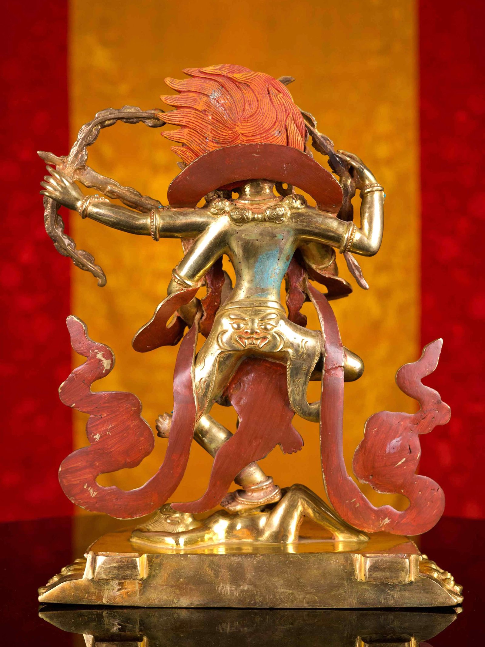 The face of Kurukulla is painted with gold to enhance its significant features, particularly the eyes, and lips. This detailed painting is essential as it brings forth the crucial attributes of the expression of eyes and lips that metal carving alone cannot capture.