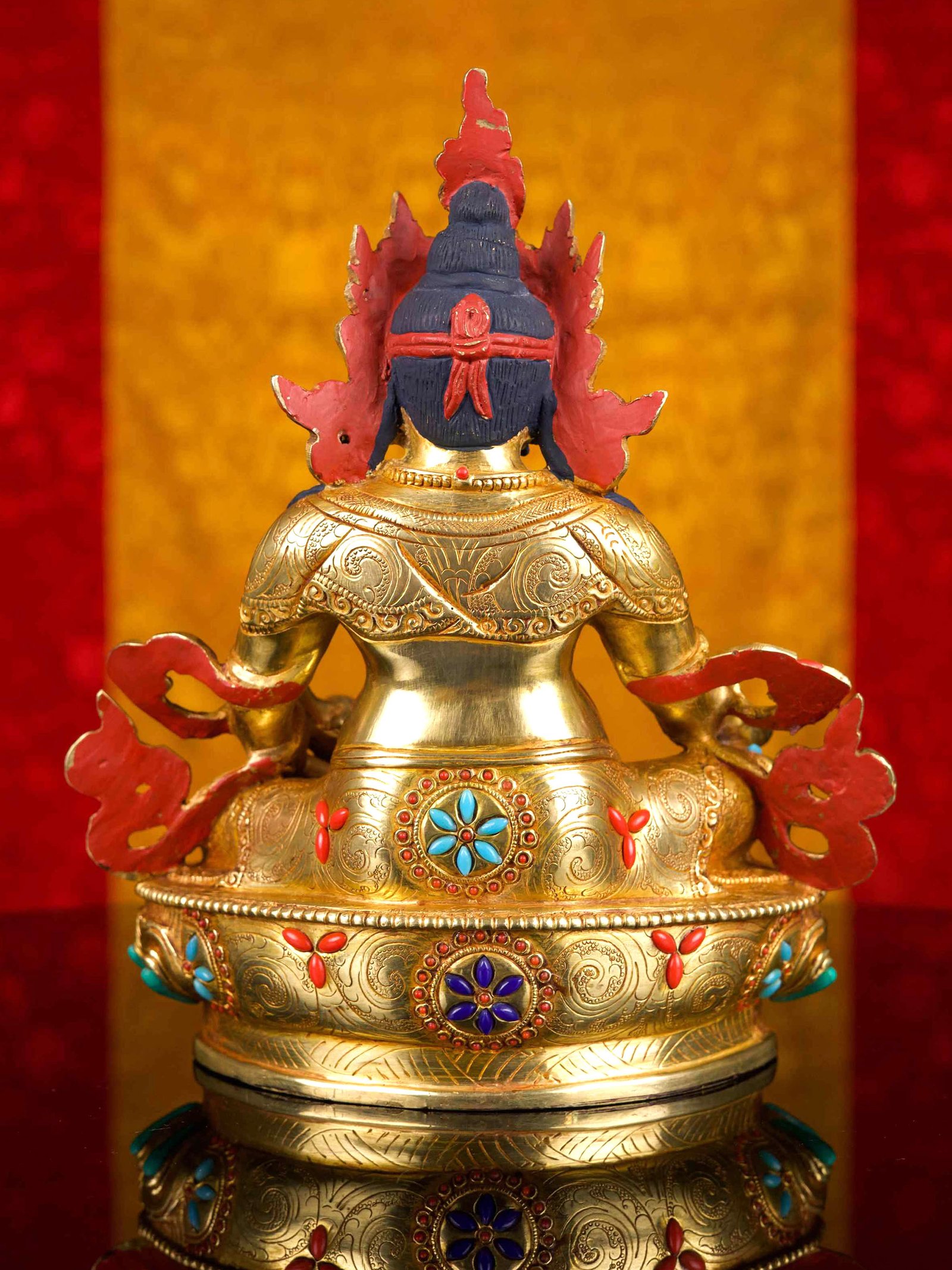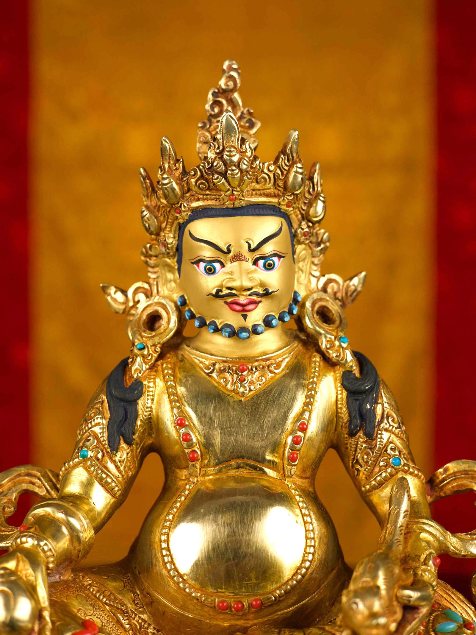 The face of Yellow Jambhala is painted with gold to enhance its significant features, particularly the eyes, and lips. This detailed painting is essential as it brings forth the crucial attributes of the expression of eyes and lips that metal carving alone cannot capture.