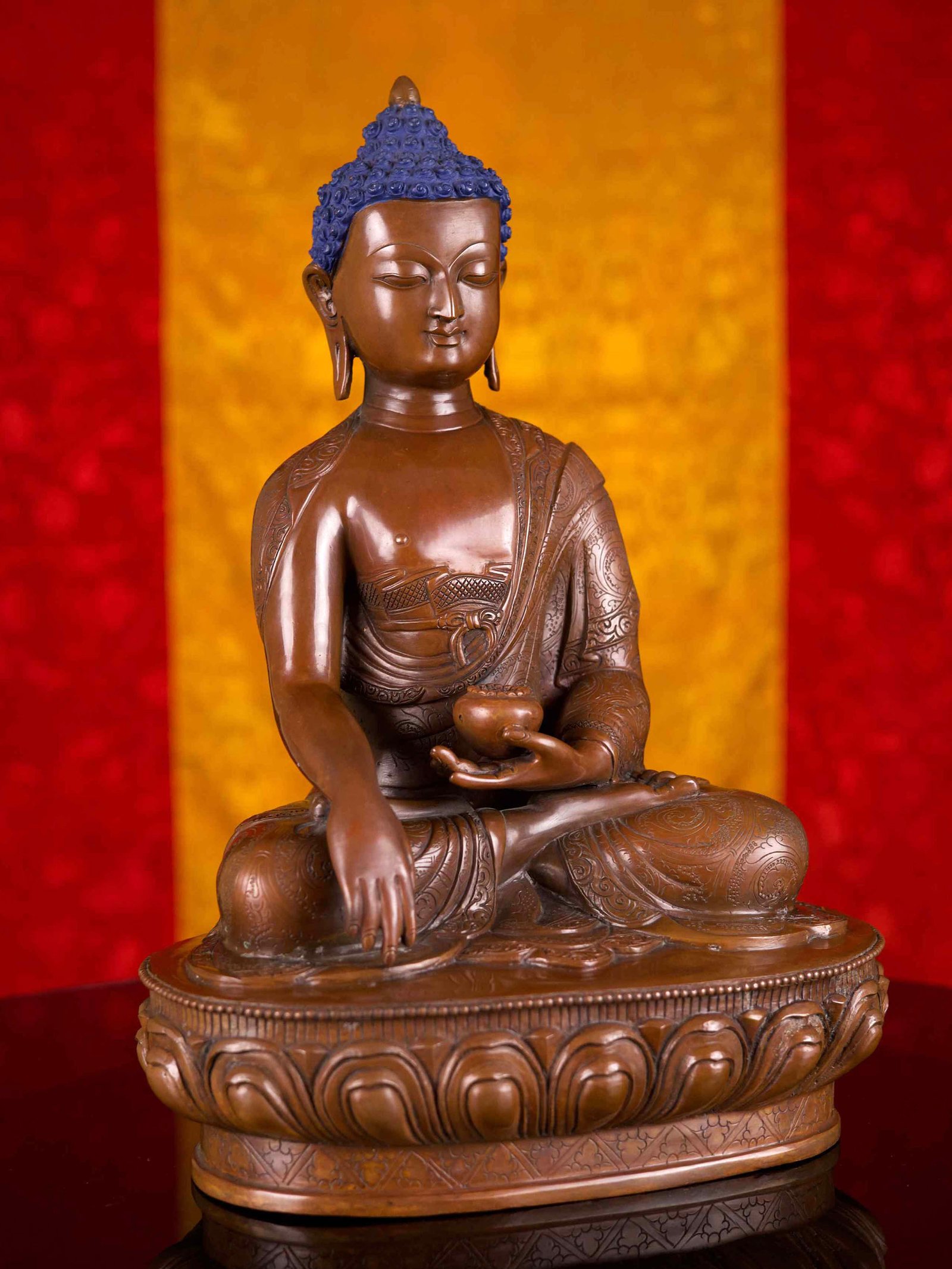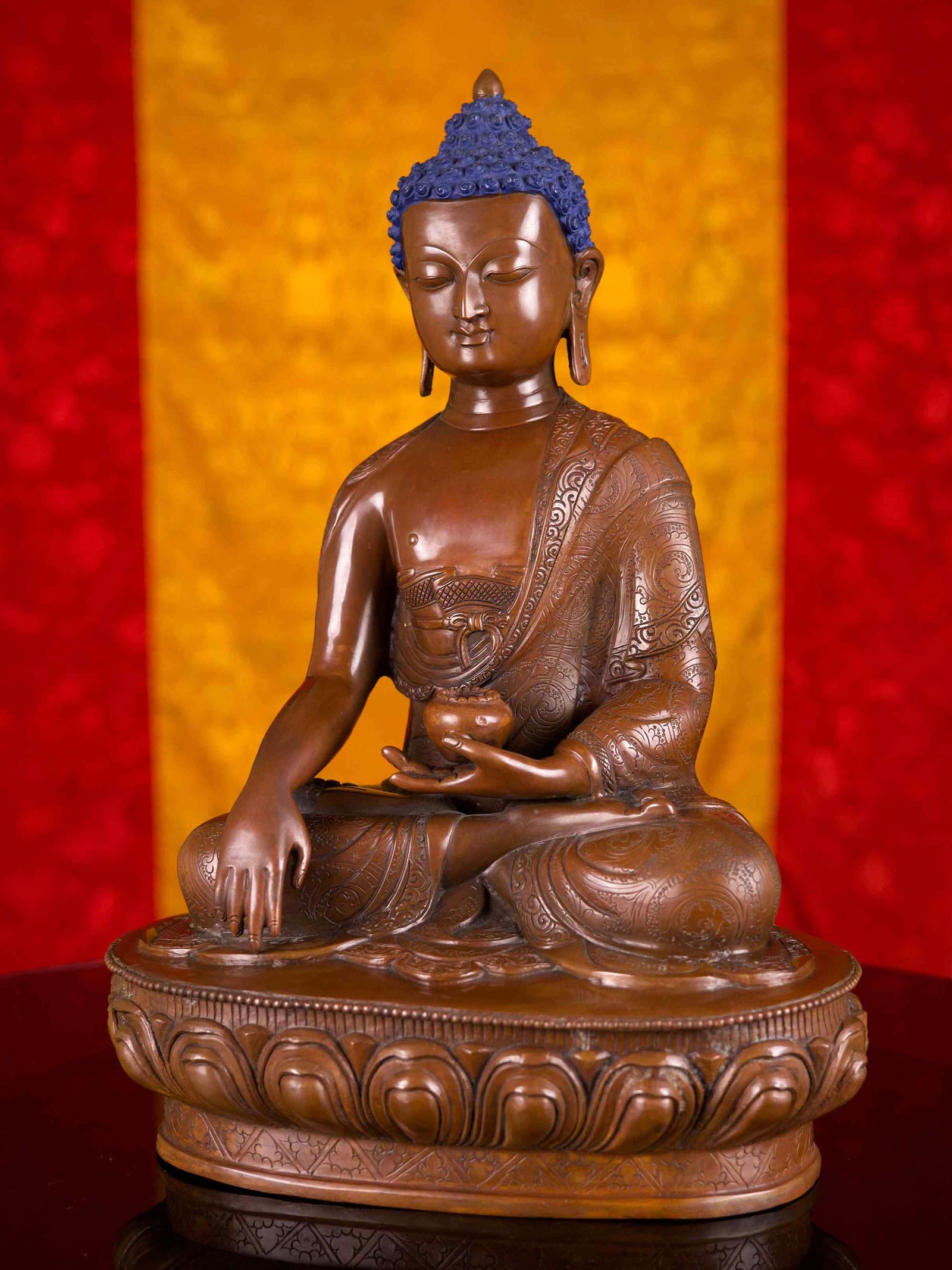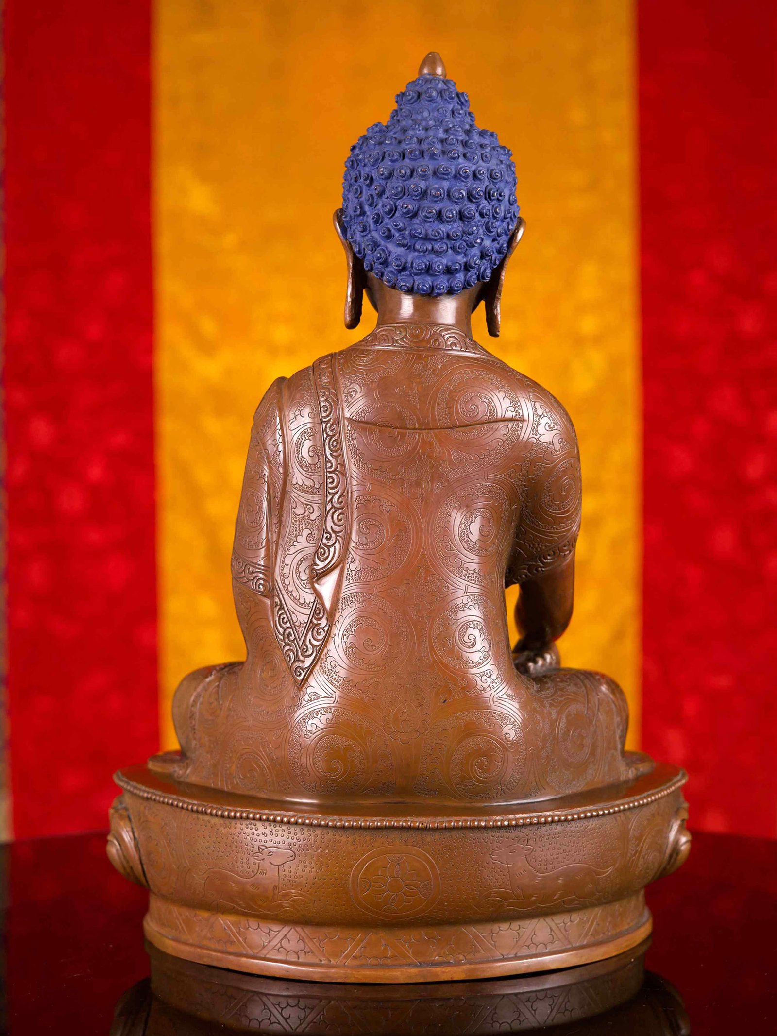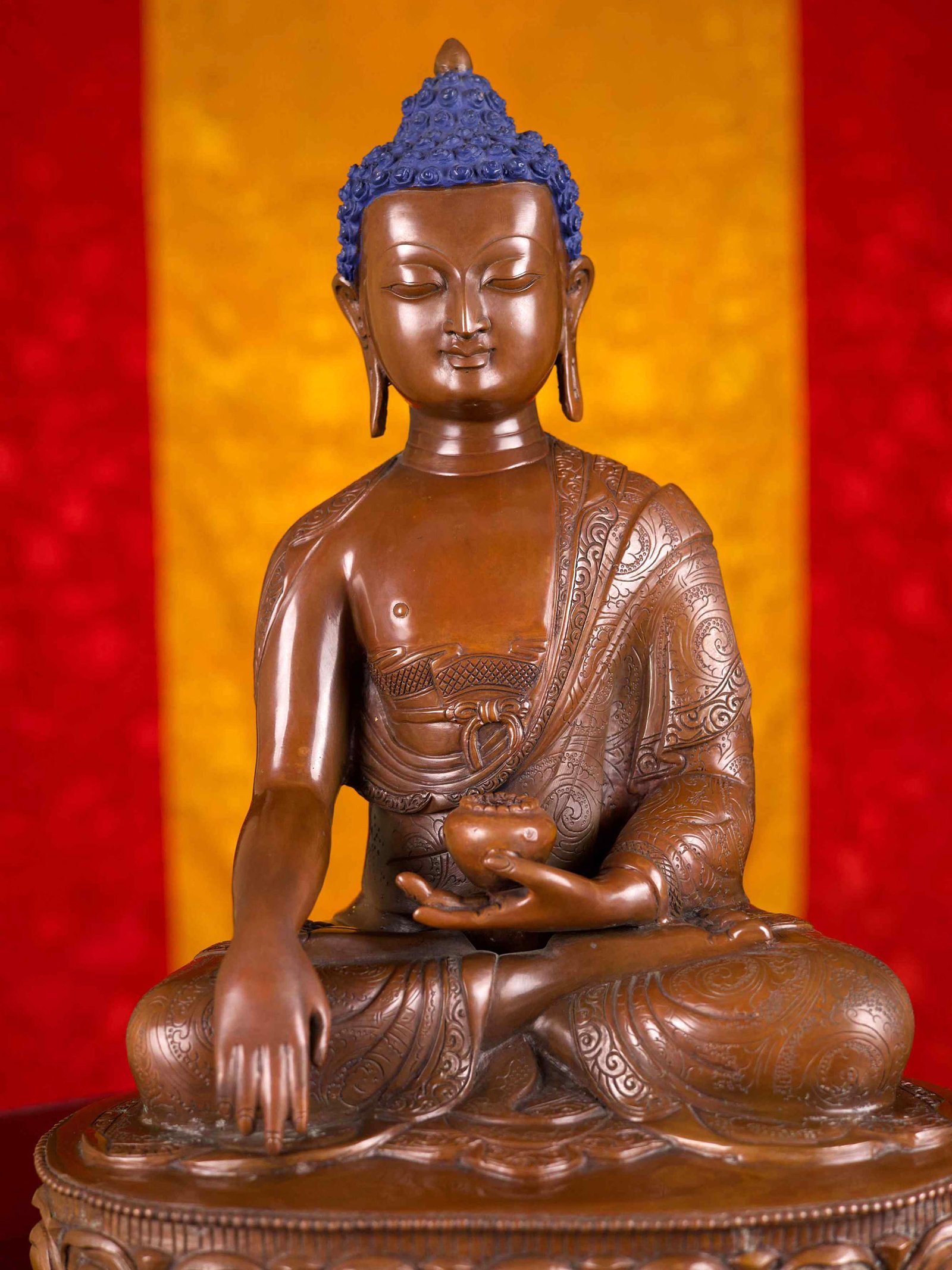 This Shakyamuni Buddha has been meticulously treated with a chocolate color antique patina. The intention behind this patina is to replicate the appearance of a copper statue that has gracefully aged over a century. Unlike a simple coat of paint, this patina is not applied superficially and is designed to endure. It undergoes an artificial oxidation process that adds depth and character, while also serving as a protective layer against natural oxidation.