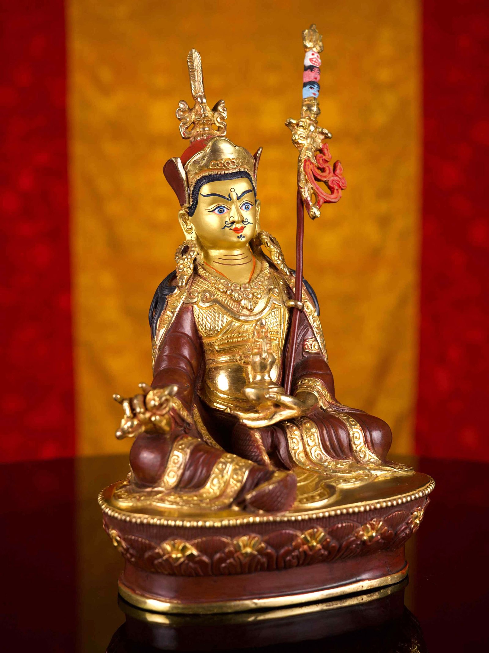 This Padmasambhava has a Partly gold-plated finish. Partly fire gold gilding, a common practice in Nepali handicrafts. This technique is skillfully employed by artisans to create intricate designs on various metal objects, including statues, jewelry, and decorative items. Through a process, a mask or resist is applied to safeguard specific areas from the gold plating. The object is then subjected to high temperatures, allowing the gold to beautifully adhere to exposed surfaces using a combination of heat and pressure.