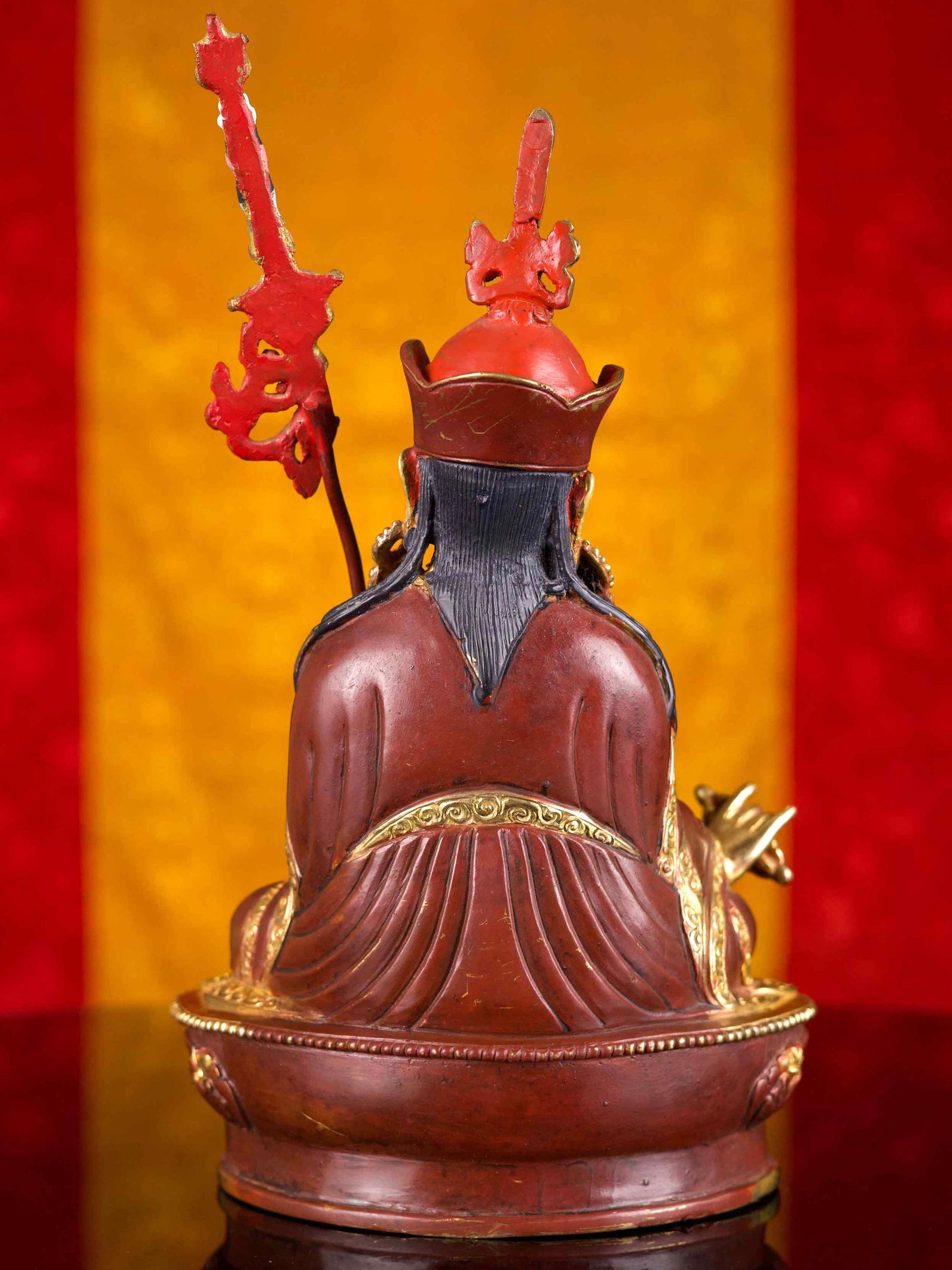The face of Padmasambhava is painted with gold to enhance its significant features, particularly the eyes, and lips. This detailed painting is essential as it brings forth the crucial attributes of the expression of eyes and lips that metal carving alone cannot capture.
