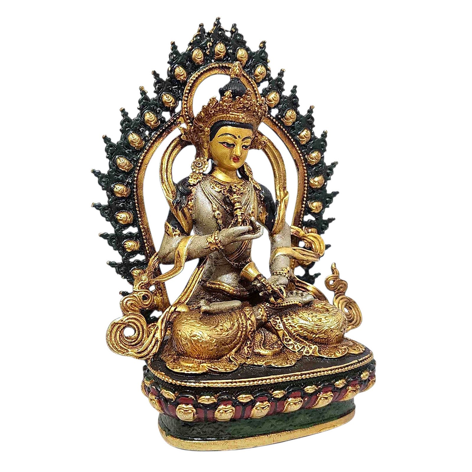 The Vajrasattva has been crafted using the Ceramic mold casting process, a modern approach that provides an alternative to traditional methods such as the lost-wax system or rubber molding. Also referred to as ceramic molding, this technique involves the creation of a ceramic mold to cast the statue. The process begins by making a precise and detailed wax model of the desired sculpture. The wax model is then coated with layers of ceramic material, creating a sturdy mold. Once the mold is complete, it is fired in a kiln, causing the wax to melt and escape, leaving behind a cavity that perfectly replicates the original sculpture. Molten metal is then poured into the mold, allowing it to fill the cavity and take on the desired form. Once cooled and solidified, the ceramic mold is carefully broken away, revealing the final metal statue. Read More