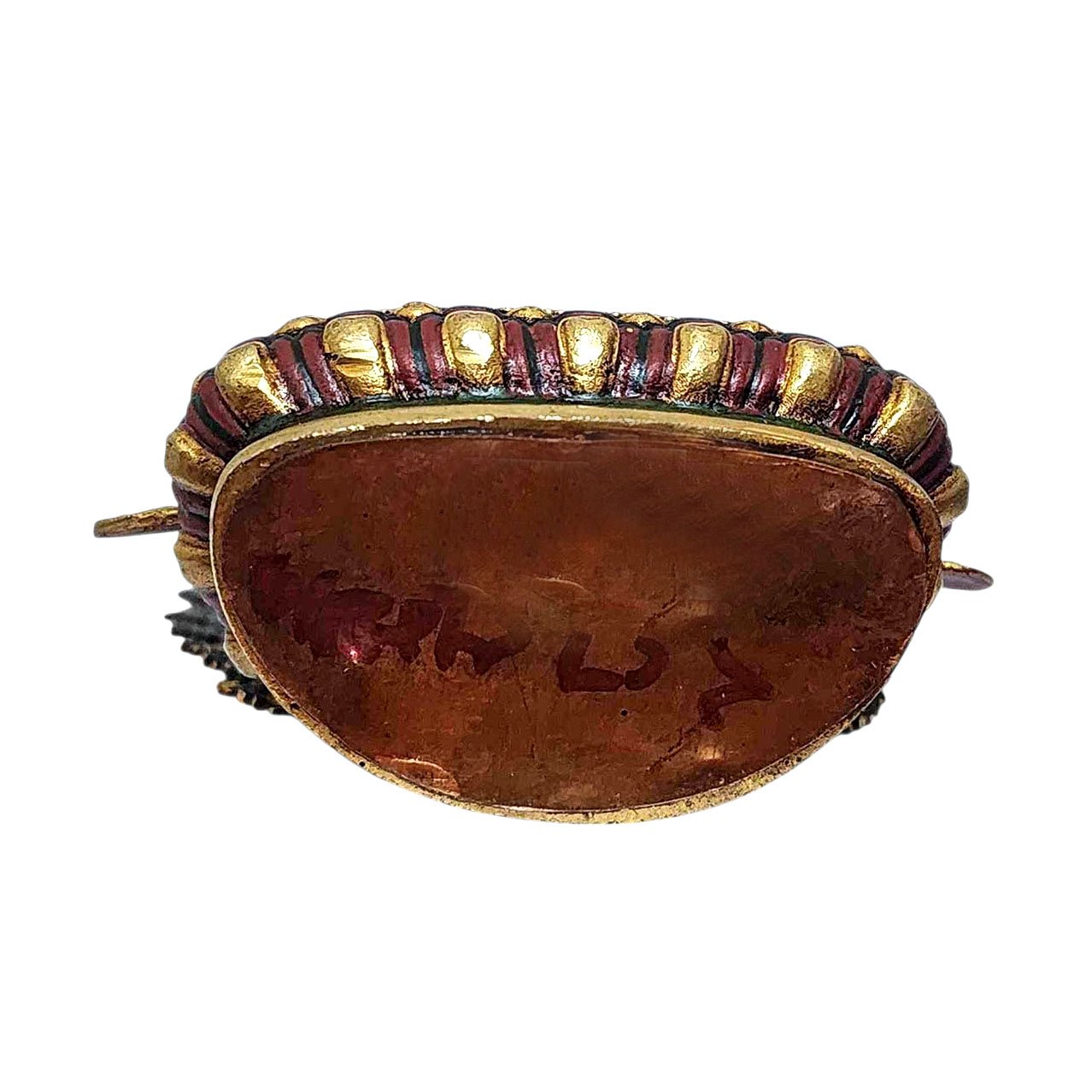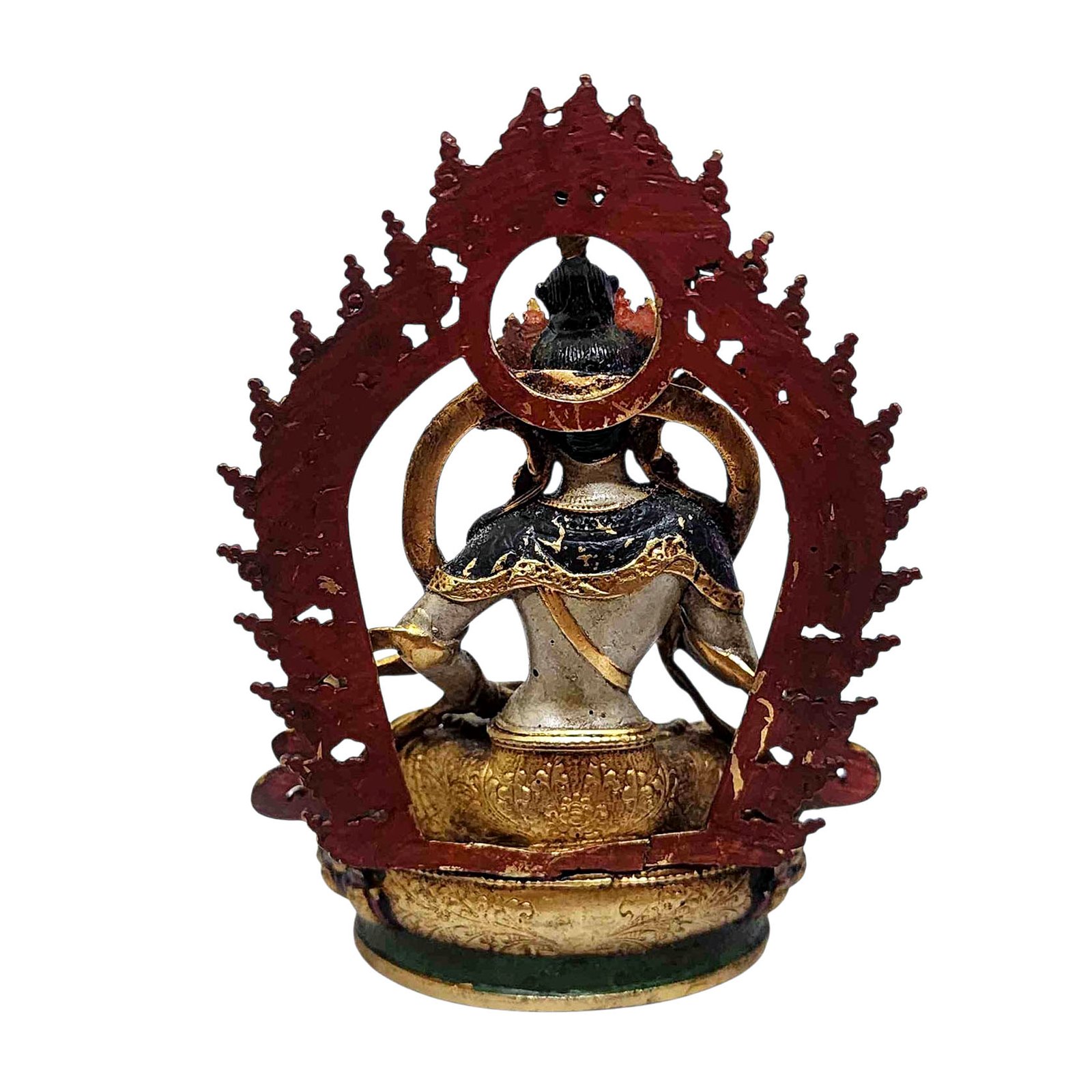 The face of Vajrasattva is painted with gold to enhance its significant features, particularly the eyes, and lips. This detailed painting is essential as it brings forth the crucial attributes of the expression of eyes and lips that metal carving alone cannot capture.