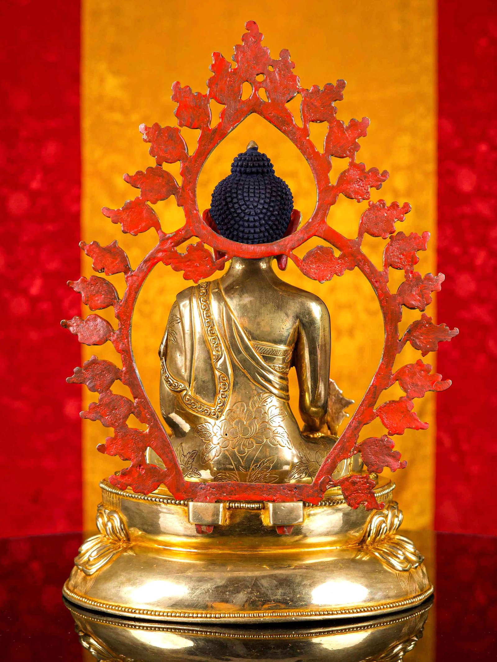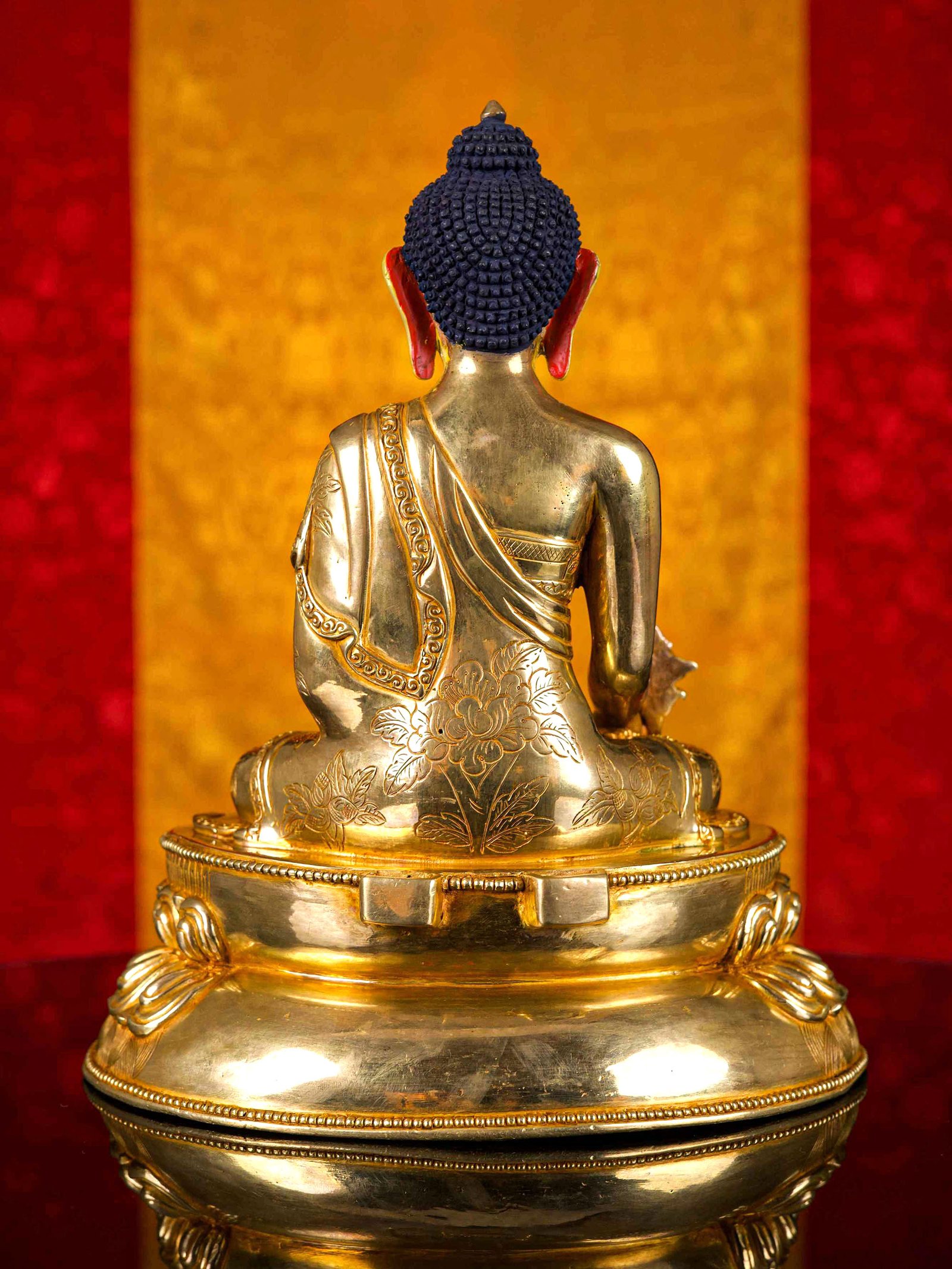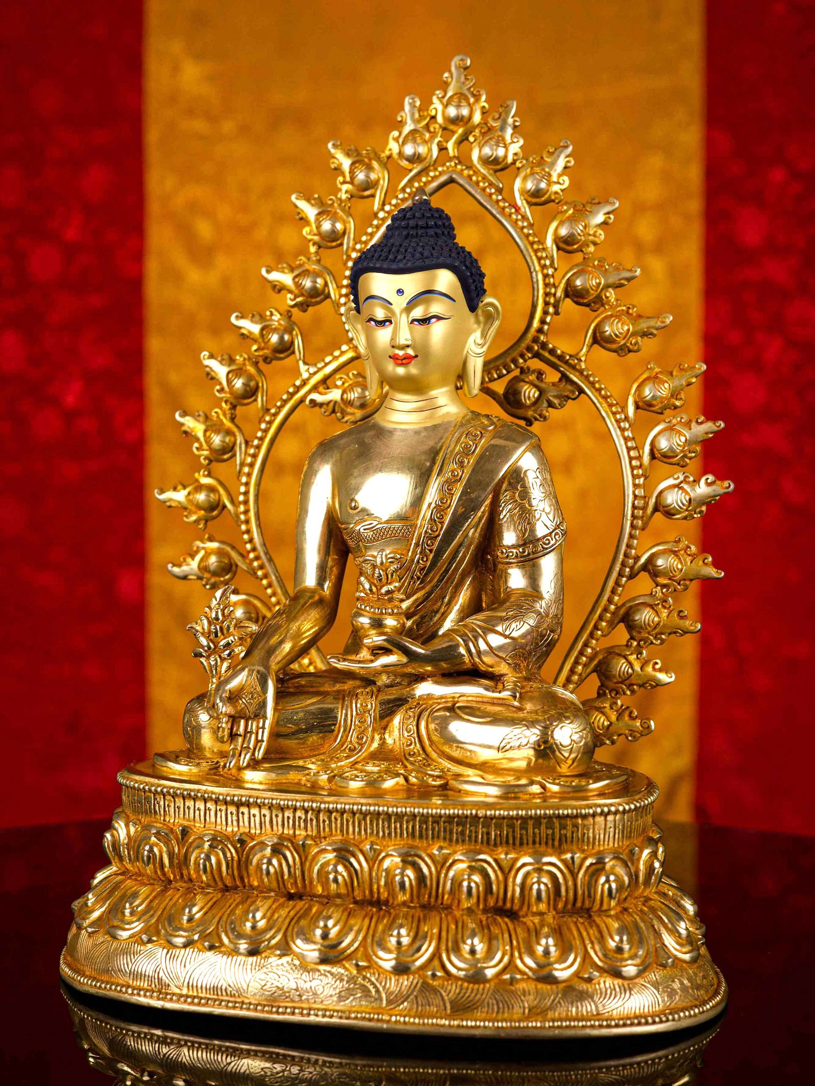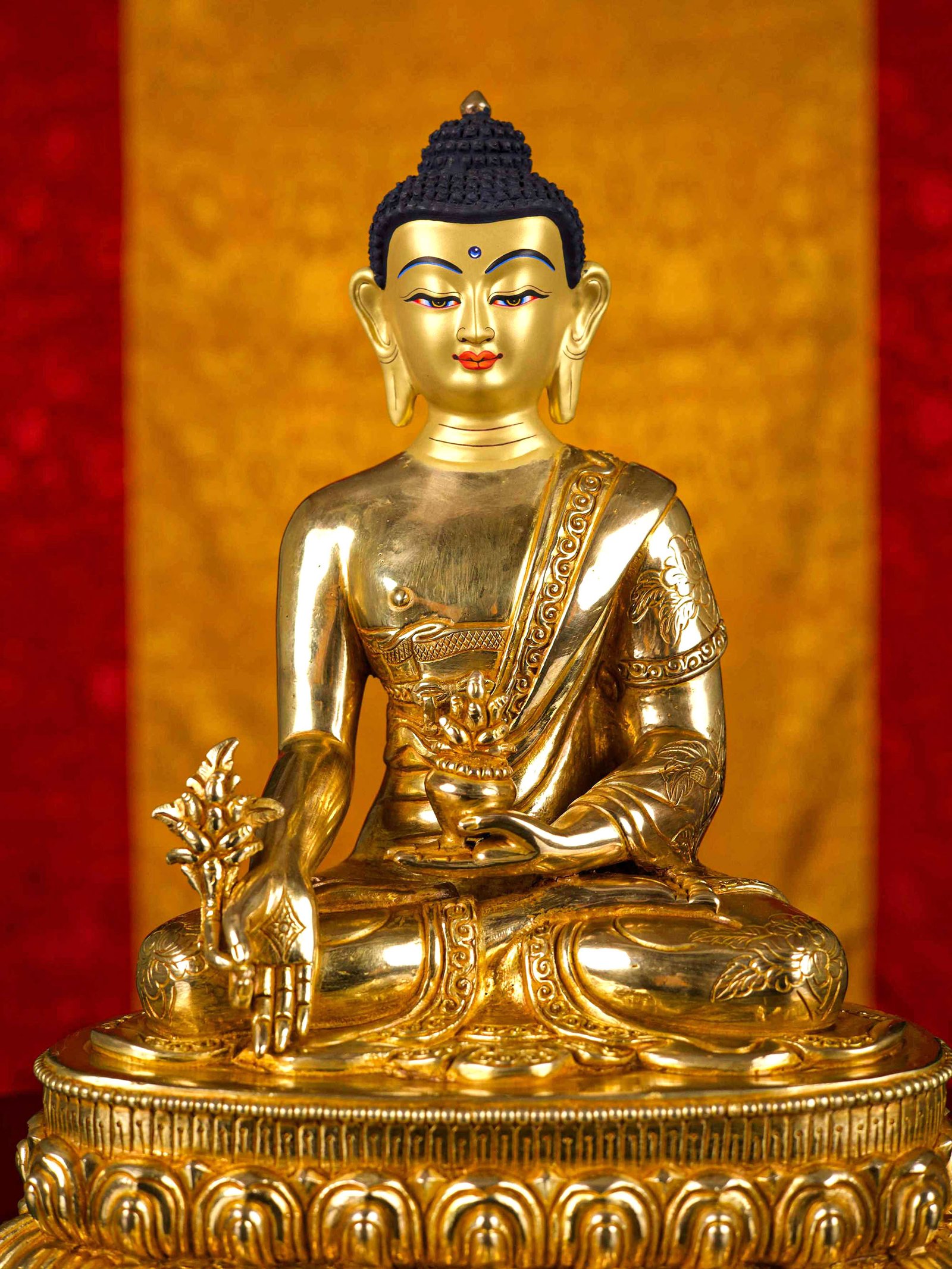 The face of Medicine Buddha is painted with gold to enhance its significant features, particularly the eyes, and lips. This detailed painting is essential as it brings forth the crucial attributes of the expression of eyes and lips that metal carving alone cannot capture.