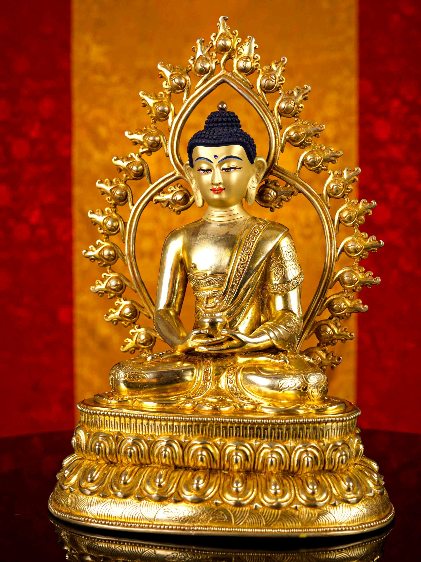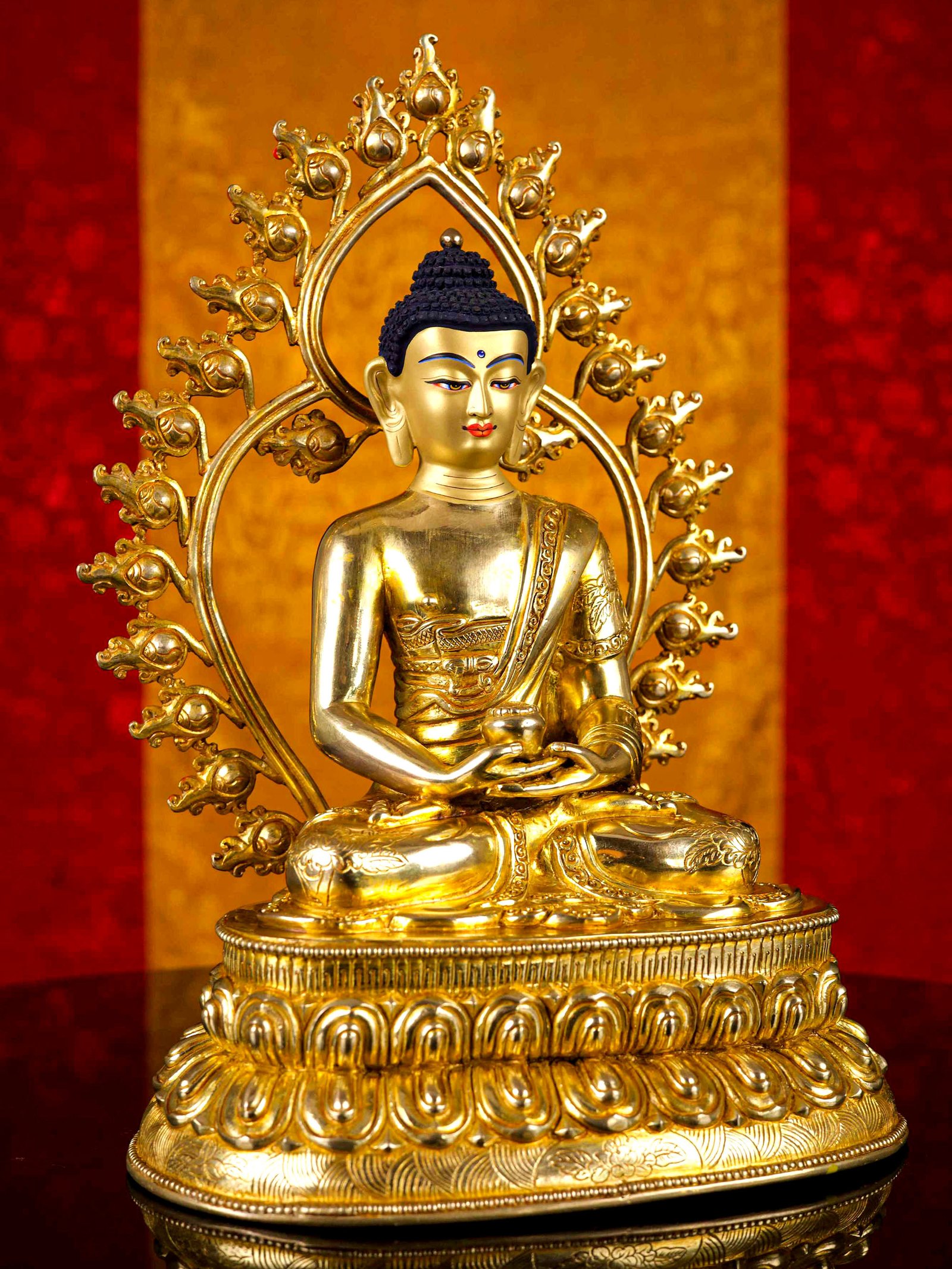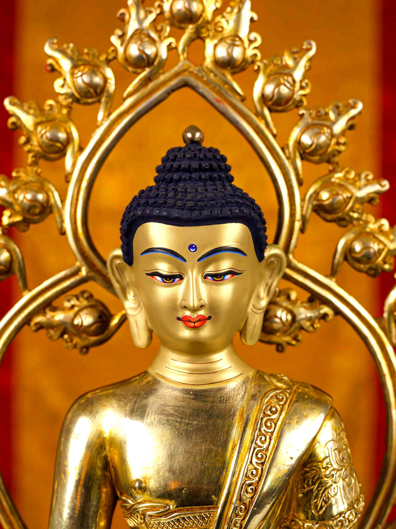 The face of Amitabha Buddha is painted with gold to enhance its significant features, particularly the eyes, and lips. This detailed painting is essential as it brings forth the crucial attributes of the expression of eyes and lips that metal carving alone cannot capture.