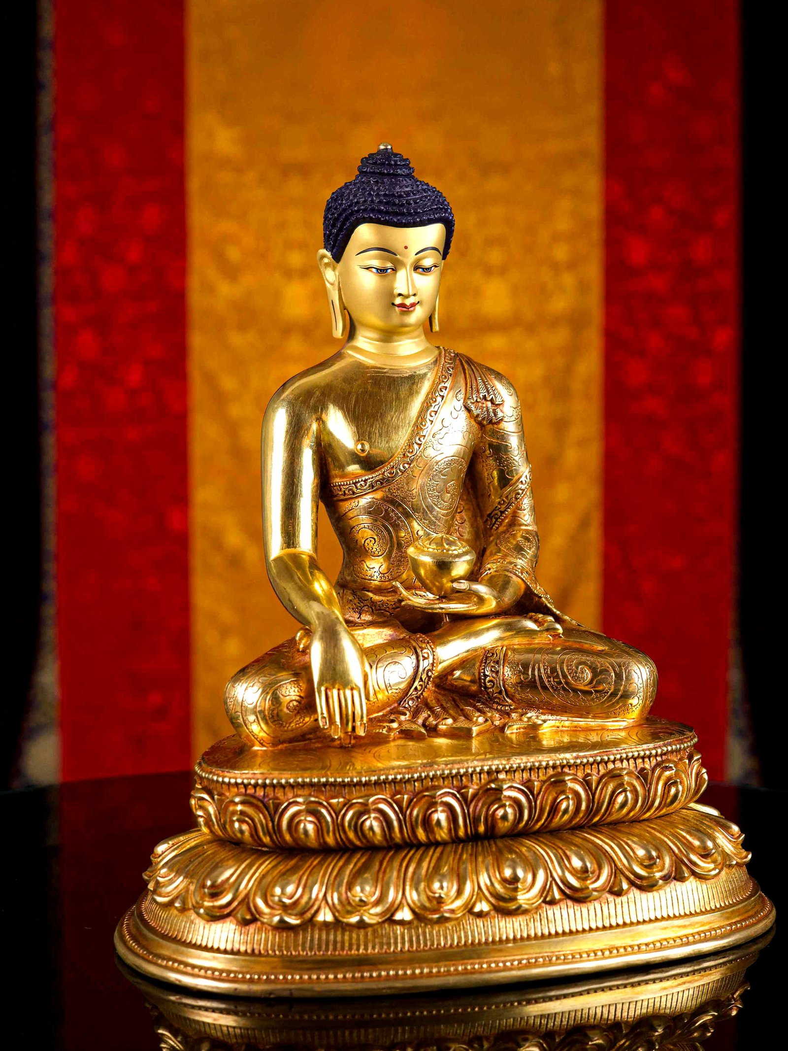 The face of Shakyamuni Buddha is painted with gold to enhance its significant features, particularly the eyes, and lips. This detailed painting is essential as it brings forth the crucial attributes of the expression of eyes and lips that metal carving alone cannot capture.