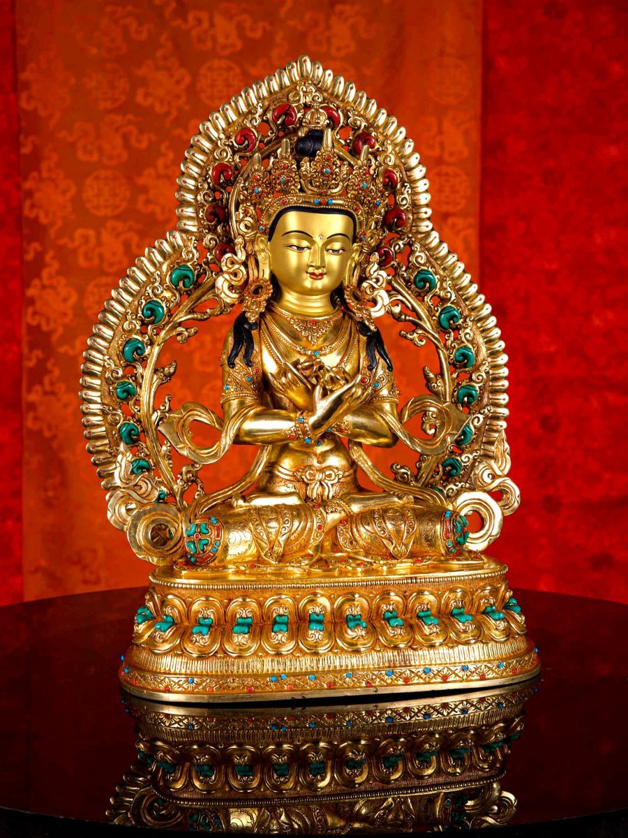 This Vajradhara is finished with full gold plating. also known as mercury gold plating or fire gold plating. This traditional technique involves the application of a genuine layer of gold onto the Vajradhara. Referred to as mercury gold plating, it is considered the correct and authentic form of gold plating in Nepal. Despite being more expensive than electroplating, this traditional mercury gold plating is gaining popularity again in Nepal. People are drawn to its authenticity, longevity, and the unmatched beauty it brings to the Vajradhara. The resurgence of interest in this traditional form of gold plating reflects a growing appreciation for the craftsmanship and cultural heritage of Nepal Read More