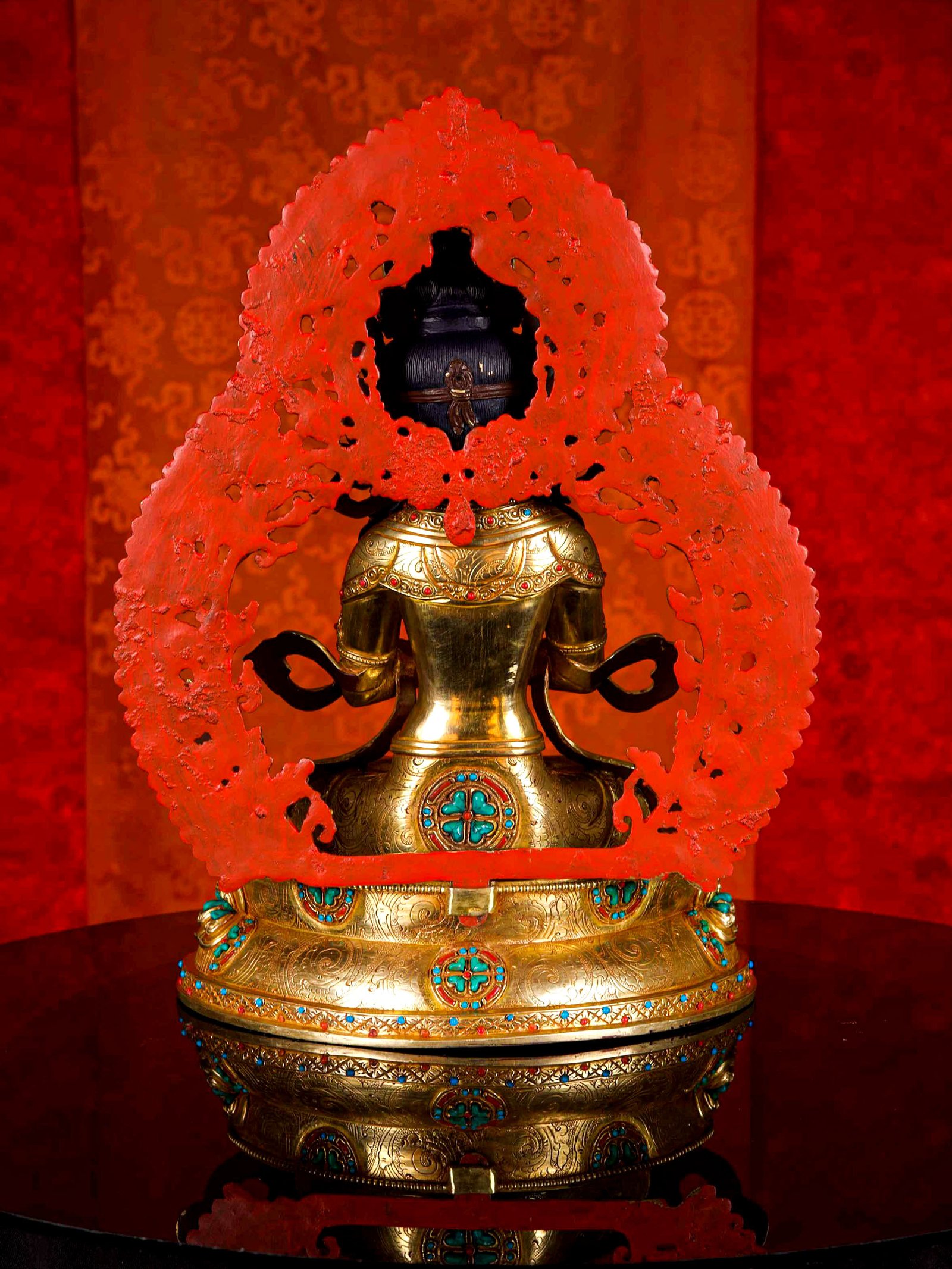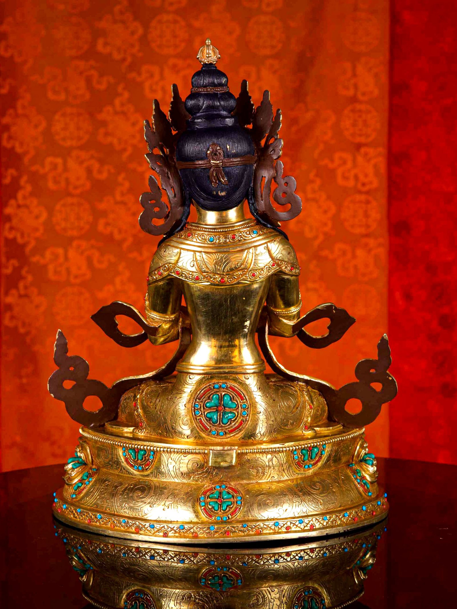 The Vajradhara is adorned with an exquisite array of semi-precious stones, including turquoise, coral, and lapis lazuli. These stones are carefully selected and meticulously placed on the Vajradhara's surface, adding a touch of opulence and enhancing its overall beauty. Each stone is thoughtfully positioned using a high-quality adhesive, ensuring secure and long-lasting attachment. The vibrant colors and unique patterns of the stones create a captivating contrast against the backdrop of the Vajradhara, elevating its visual appeal and making it truly eye-catching. Read More