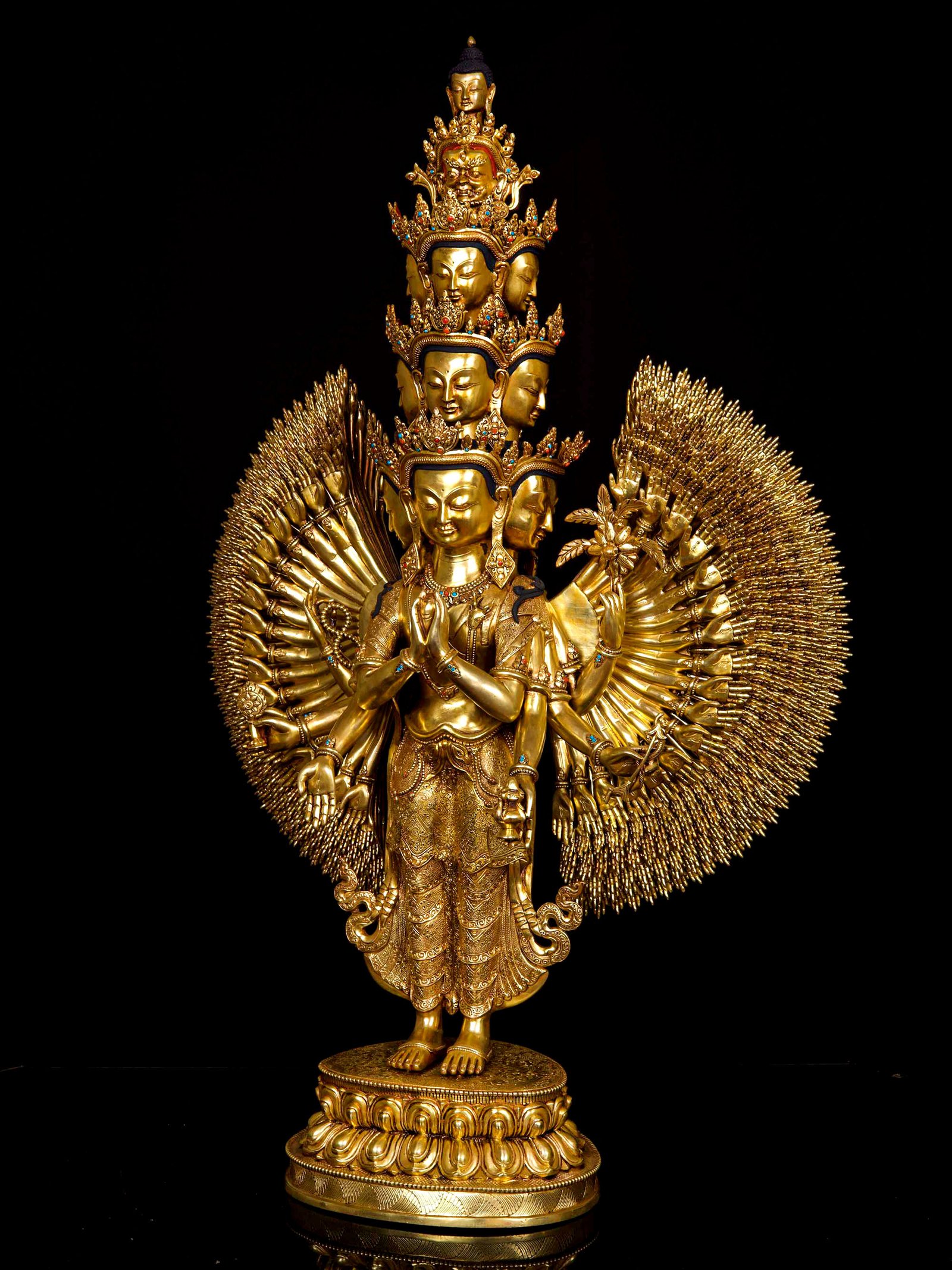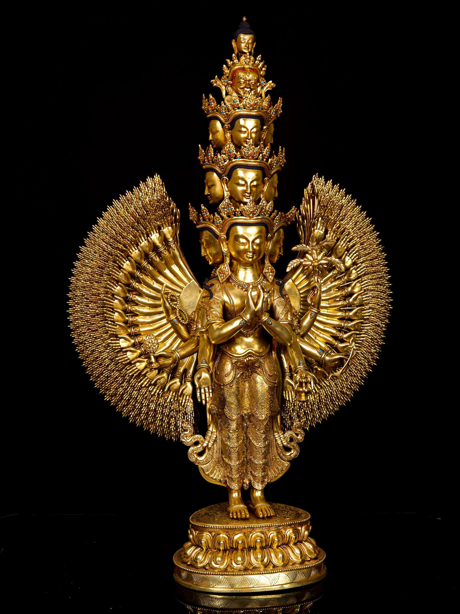 Sahasrabhuja Avalokitesvara Handmade Statue, Full Gold Plated, Stone Setting |