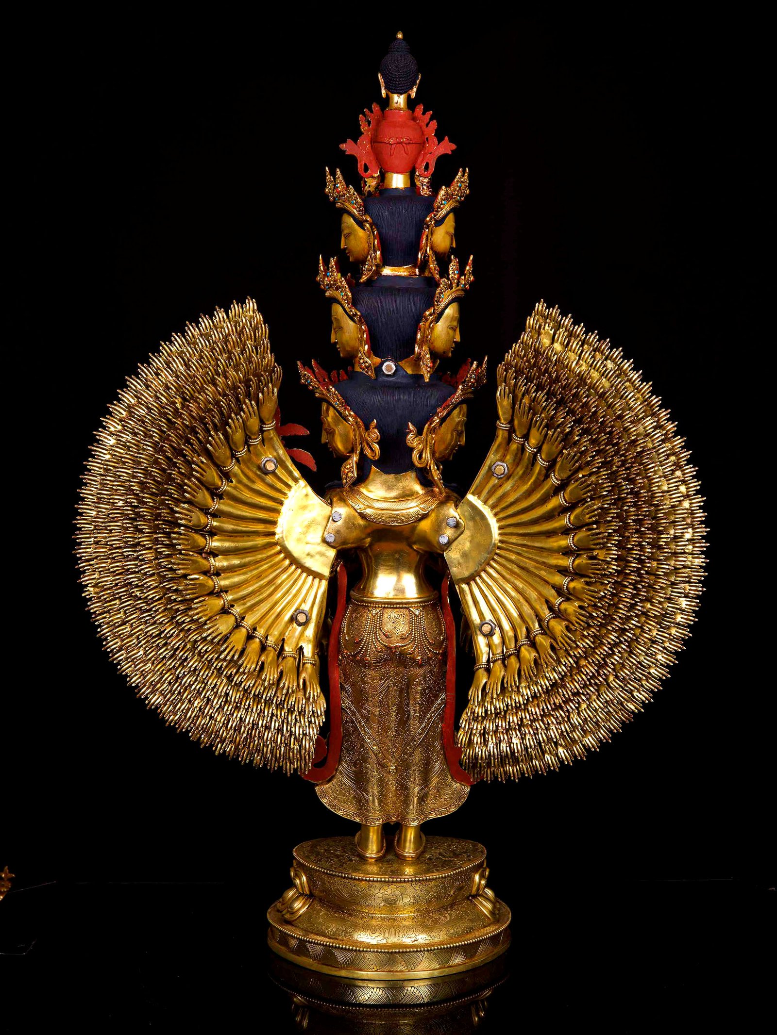 The face of Sahasrabhuja Avalokitesvara is painted with gold to enhance its significant features, particularly the eyes, and lips. This detailed painting is essential as it brings forth the crucial attributes of the expression of eyes and lips that metal carving alone cannot capture.