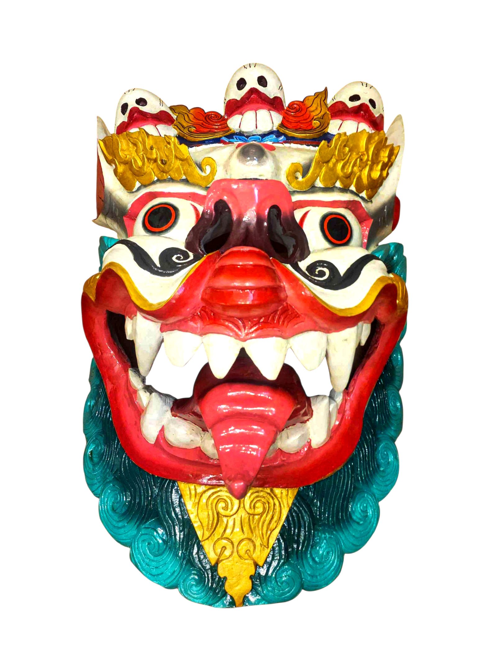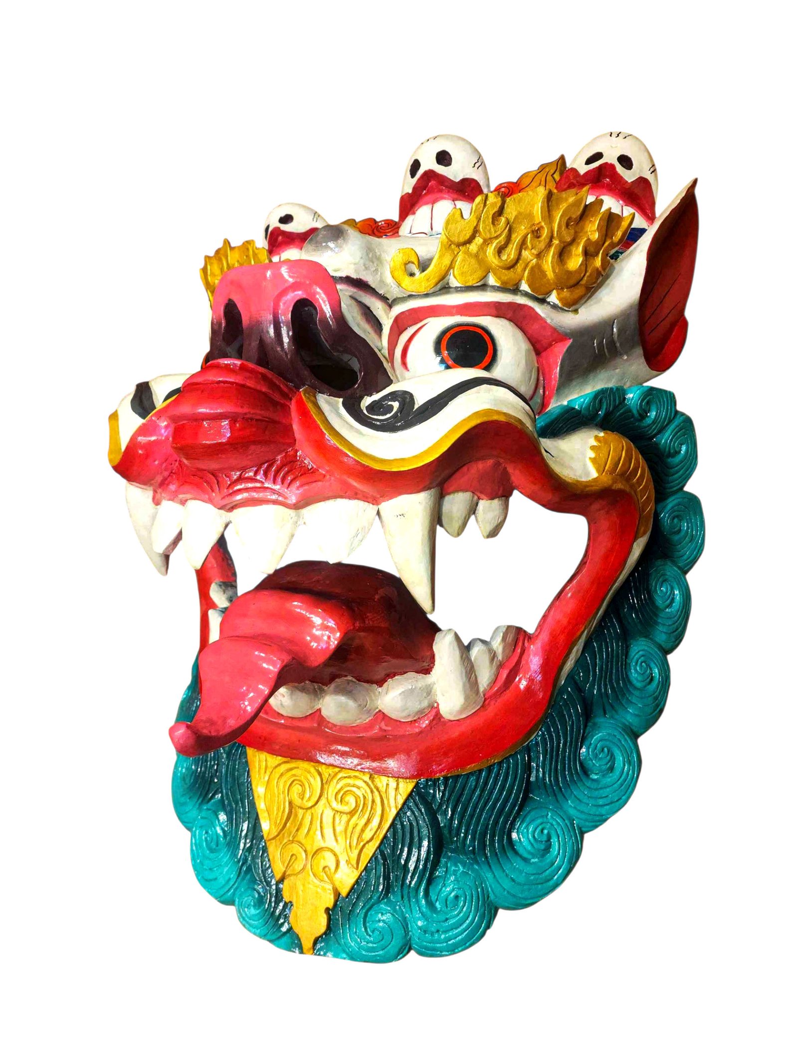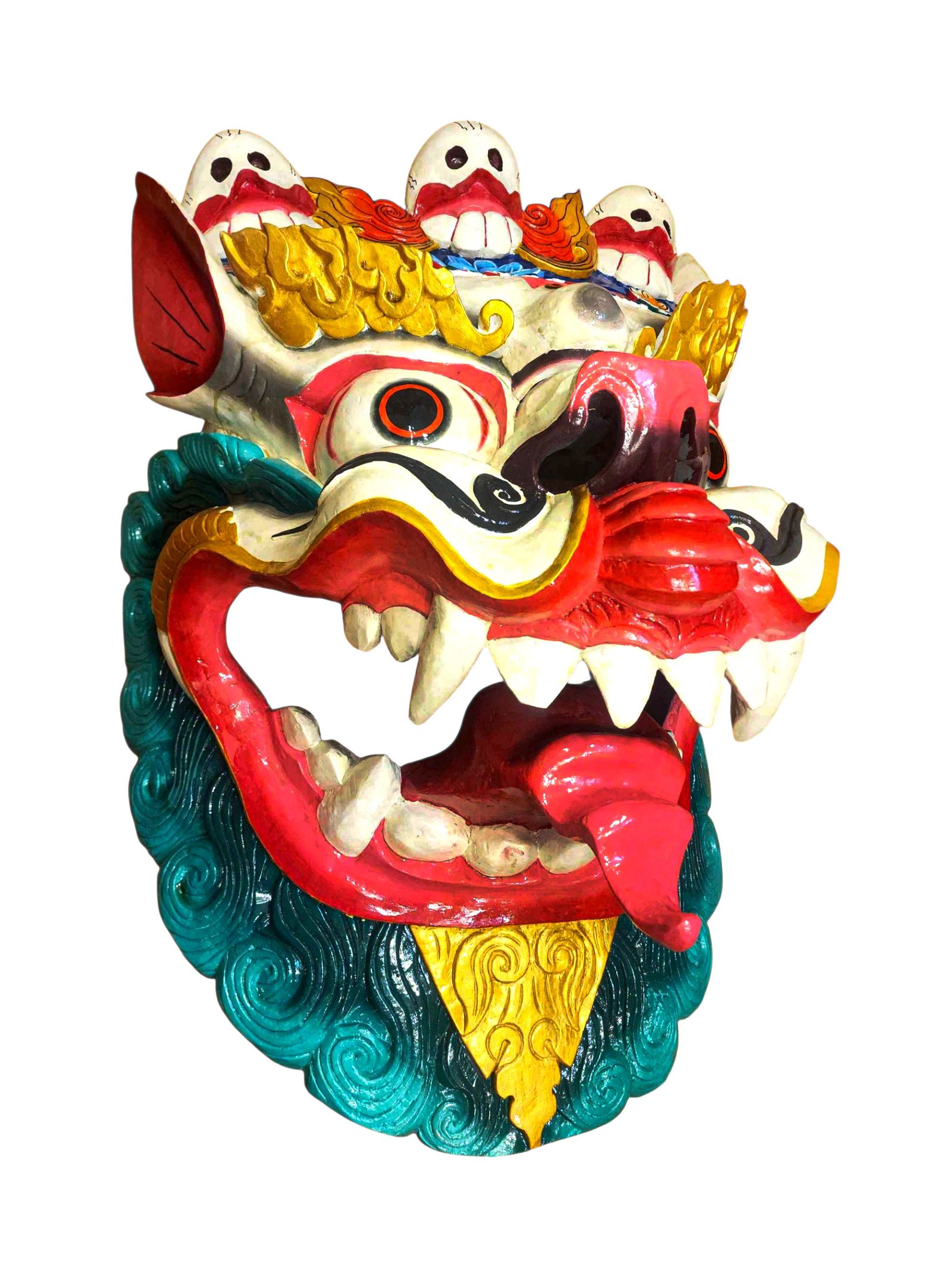 Buddhist Wooden Mask of Snow Lion, Tibetan Style Wtih Traditional Colors, Poplar Wood |
