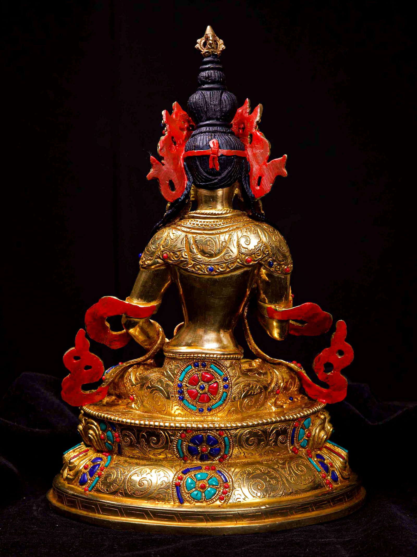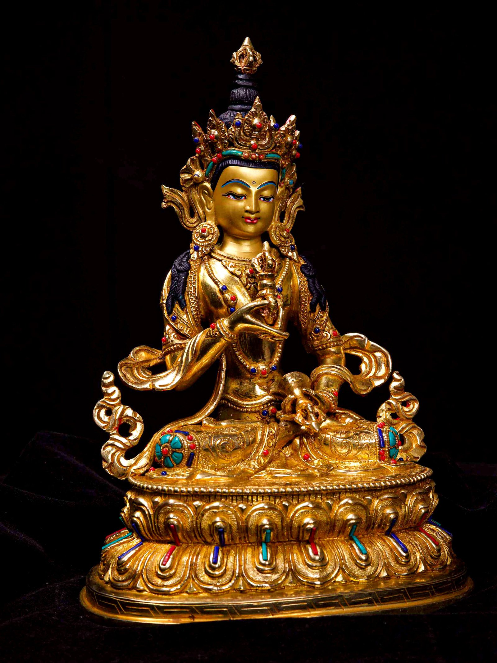 The Vajrasattva is adorned with an exquisite array of semi-precious stones, including turquoise, coral, and lapis lazuli. These stones are carefully selected and meticulously placed on the Vajrasattva's surface, adding a touch of opulence and enhancing its overall beauty. Each stone is thoughtfully positioned using a high-quality adhesive, ensuring secure and long-lasting attachment. The vibrant colors and unique patterns of the stones create a captivating contrast against the backdrop of the Vajrasattva, elevating its visual appeal and making it truly eye-catching. Read More