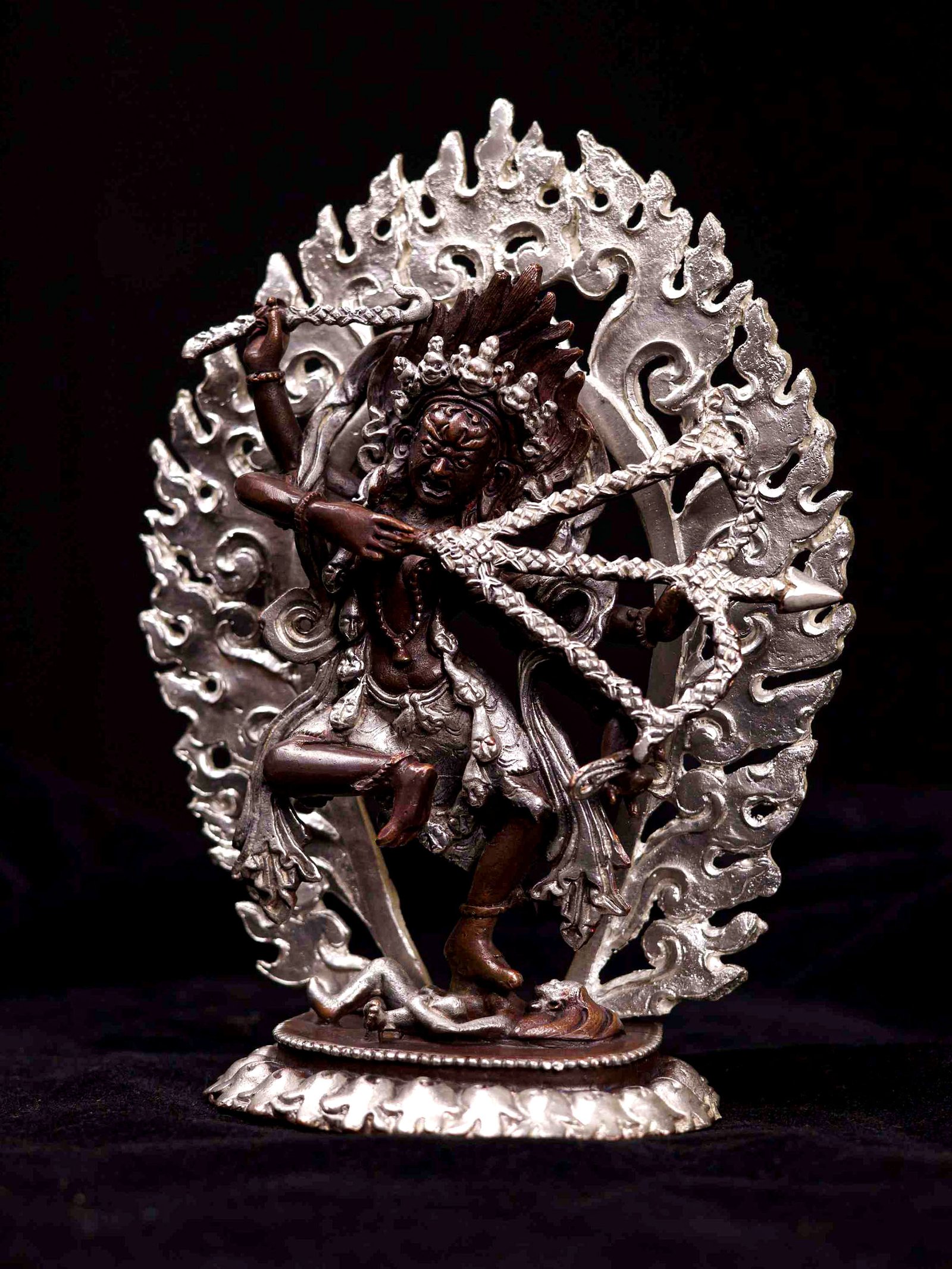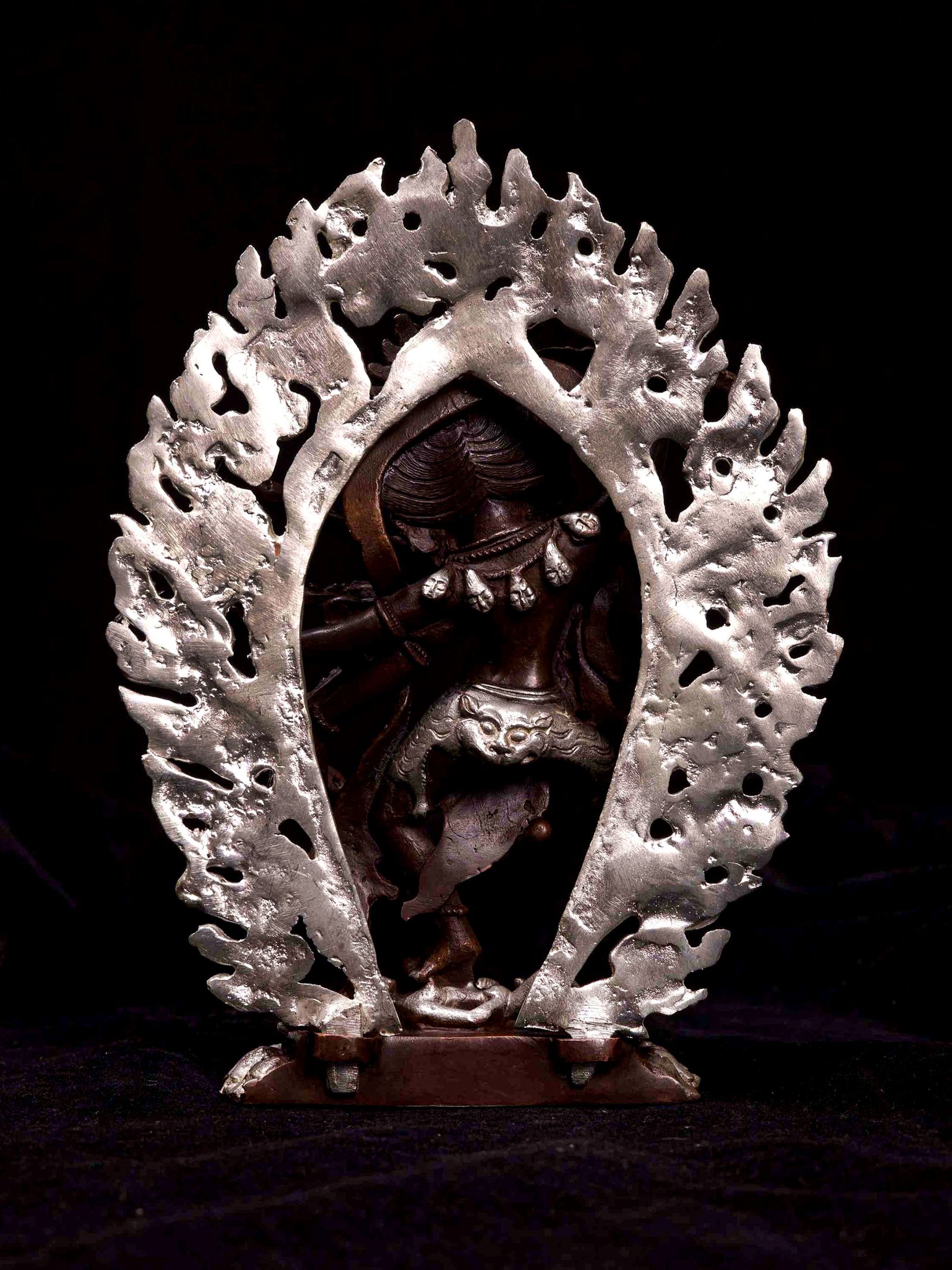 The Kurukulla features a captivating combination of partly silver plating and dark oxidation. This unique finishing technique combines the lustrous shine of silver with the rich, deep tones achieved through oxidation. In the process of creating this finish, selected areas of the Kurukulla are expertly silver-plated, creating a radiant and reflective surface that catches the light. The remaining areas are intentionally oxidized, resulting in a darkened patina that adds depth and character to the piece. Read More