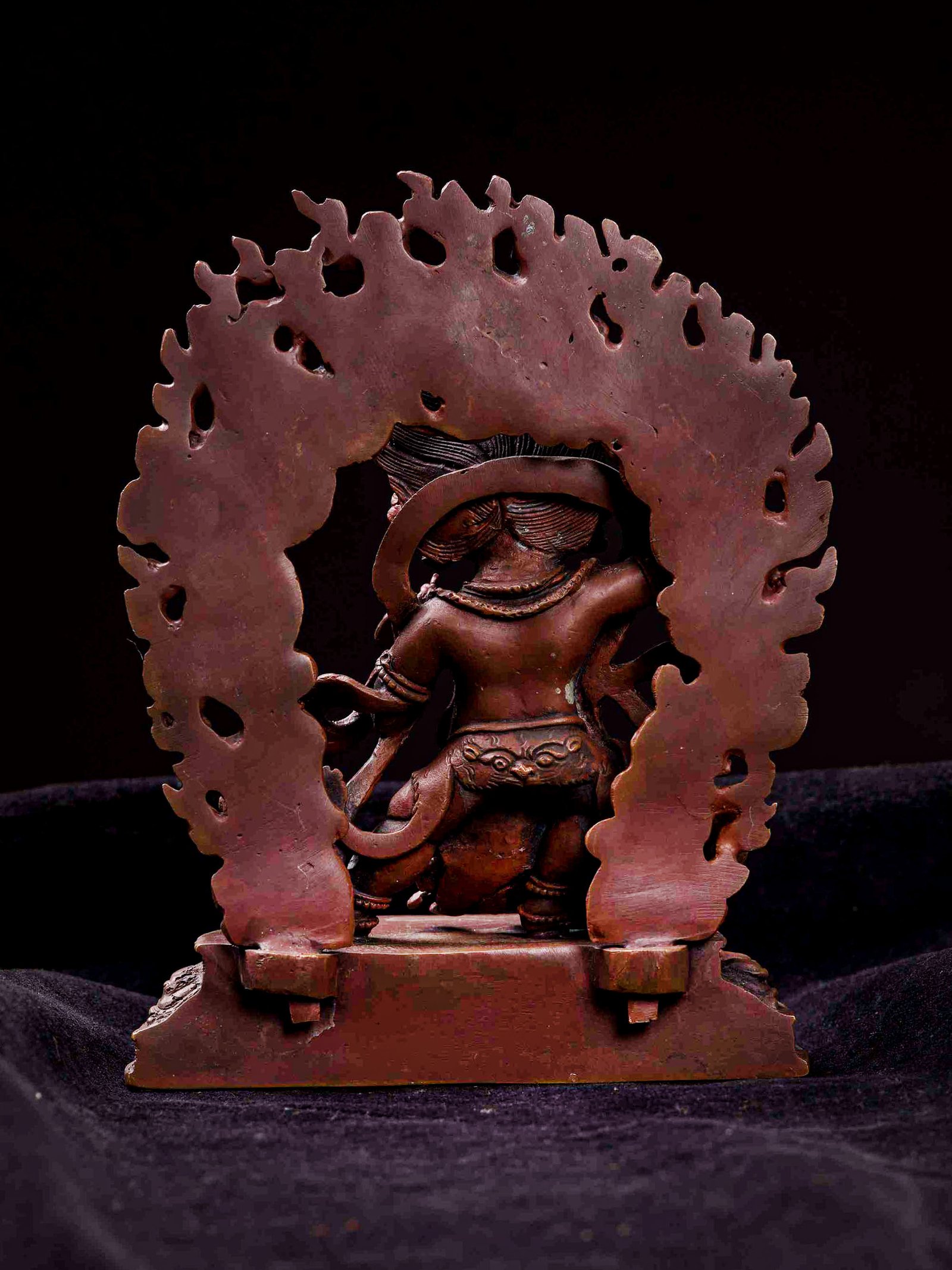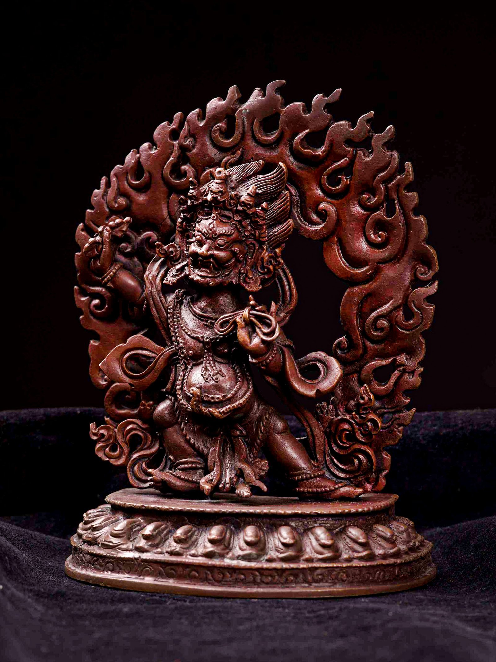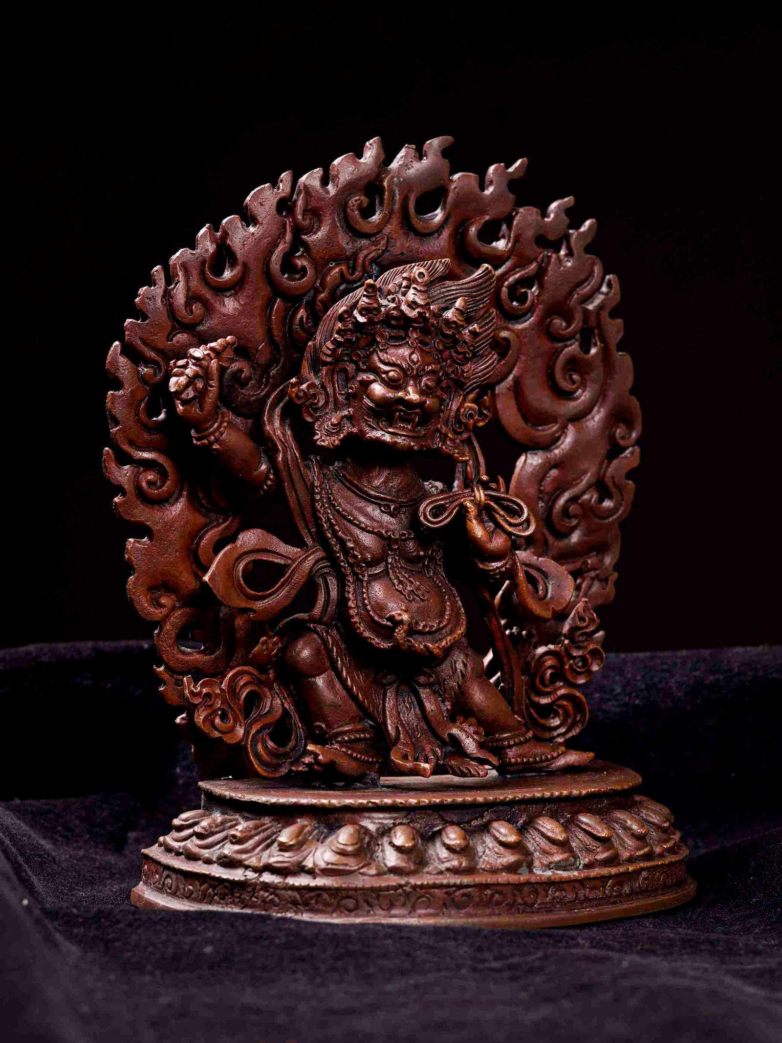 This Vajrapani has been meticulously treated with a chocolate color antique patina. The intention behind this patina is to replicate the appearance of a copper statue that has gracefully aged over a century. Unlike a simple coat of paint, this patina is not applied superficially and is designed to endure. It undergoes an artificial oxidation process that adds depth and character, while also serving as a protective layer against natural oxidation.