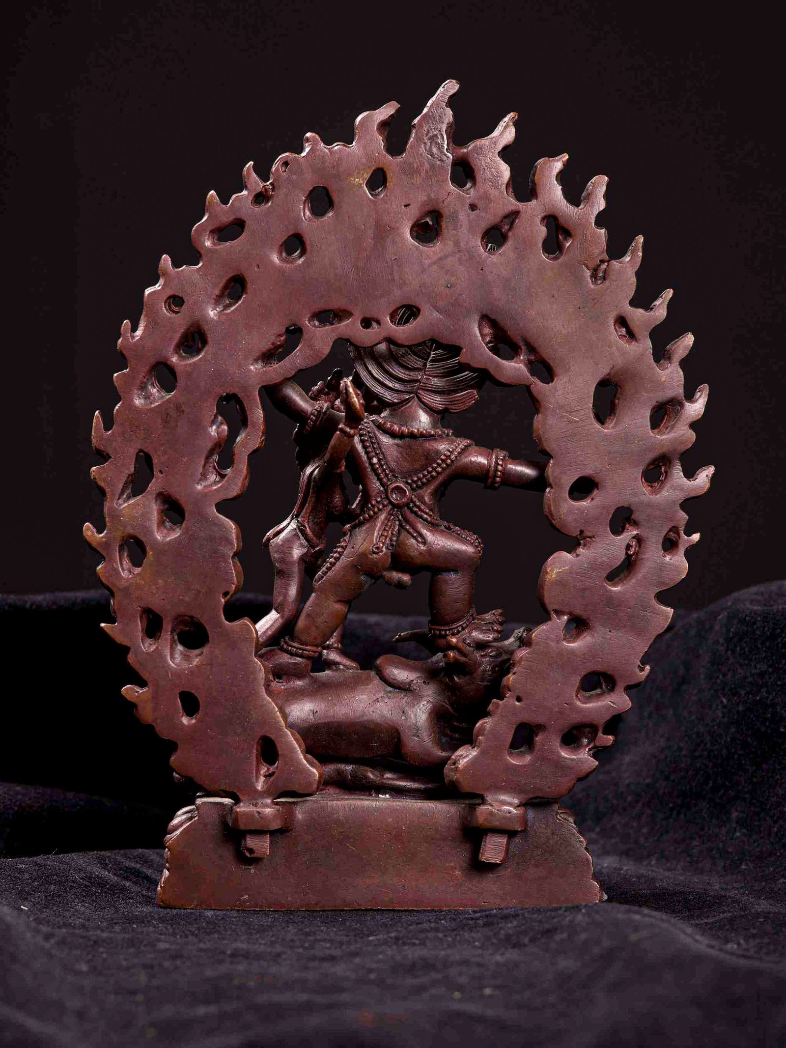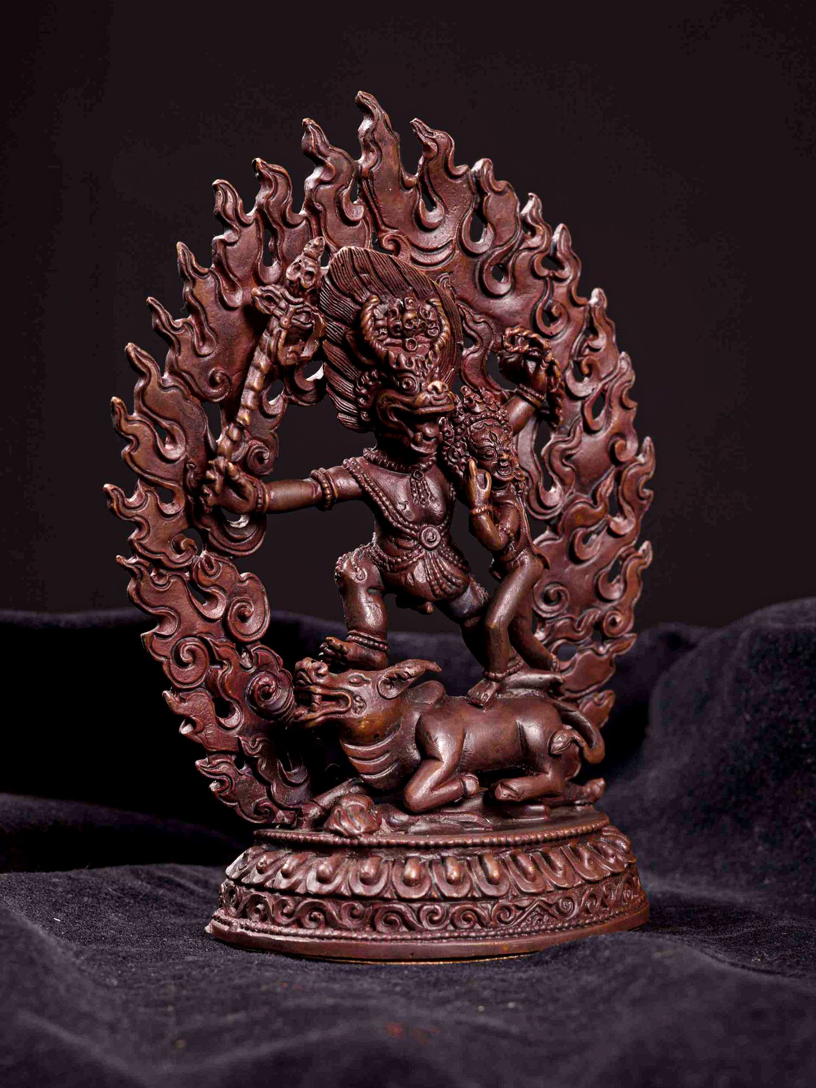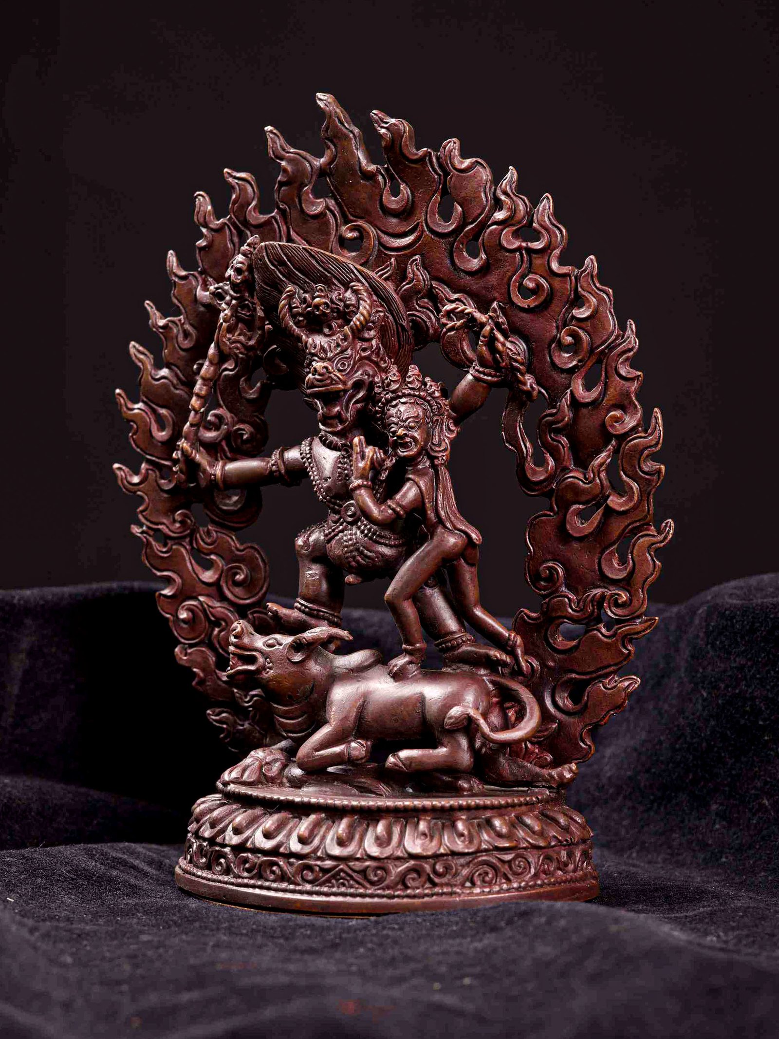 This Yamantaka has been meticulously treated with a chocolate color antique patina. The intention behind this patina is to replicate the appearance of a copper statue that has gracefully aged over a century. Unlike a simple coat of paint, this patina is not applied superficially and is designed to endure. It undergoes an artificial oxidation process that adds depth and character, while also serving as a protective layer against natural oxidation.