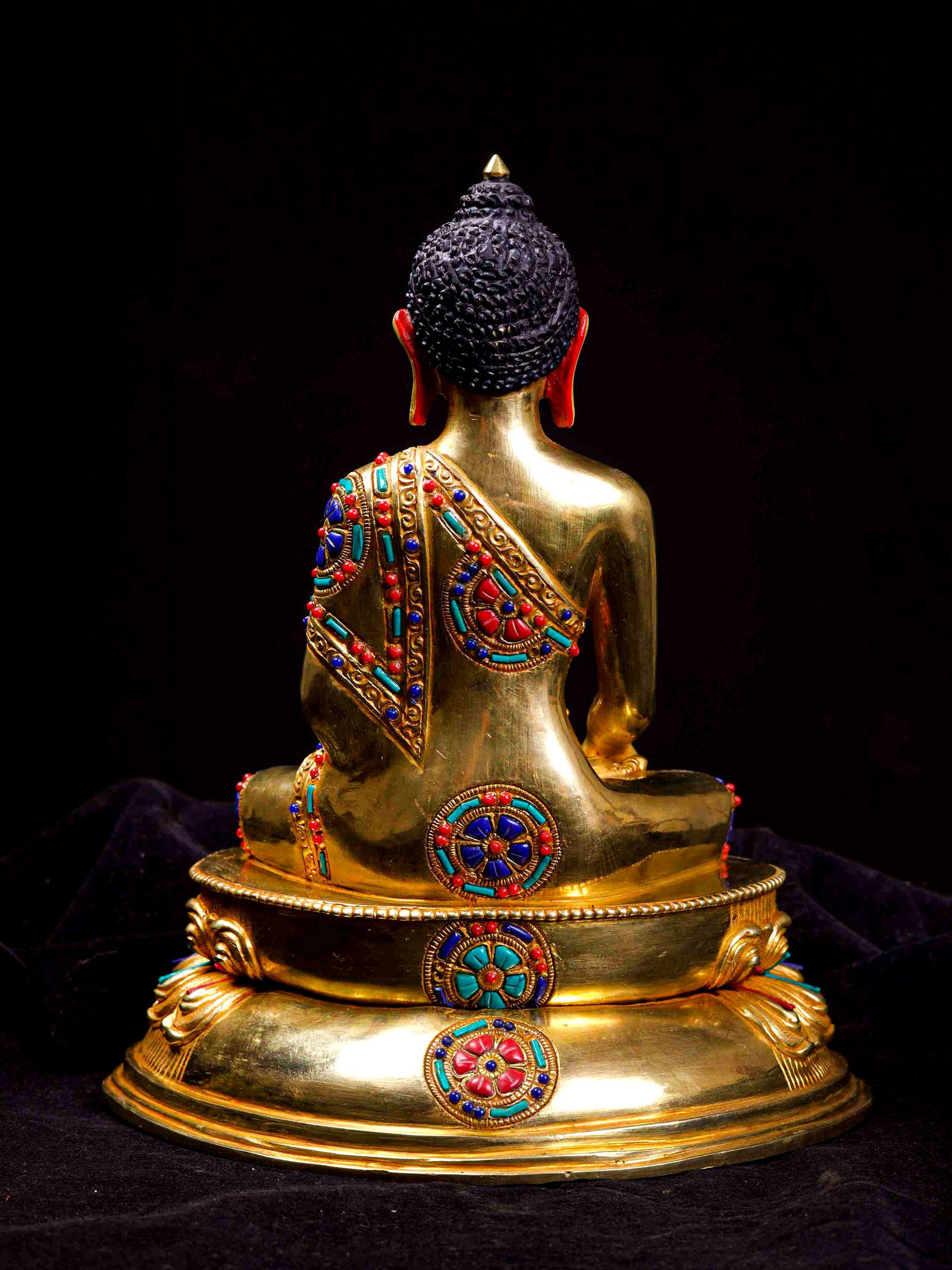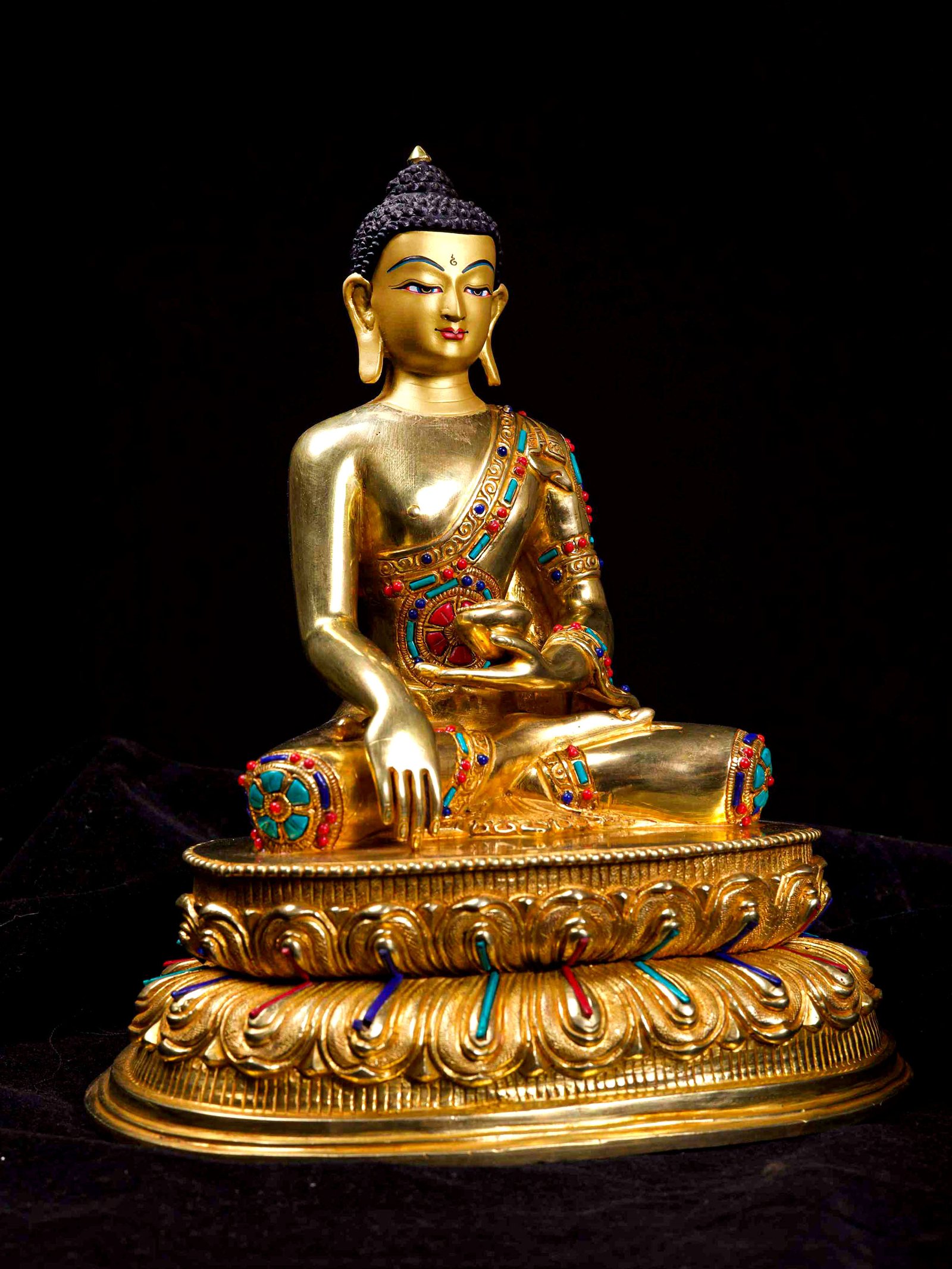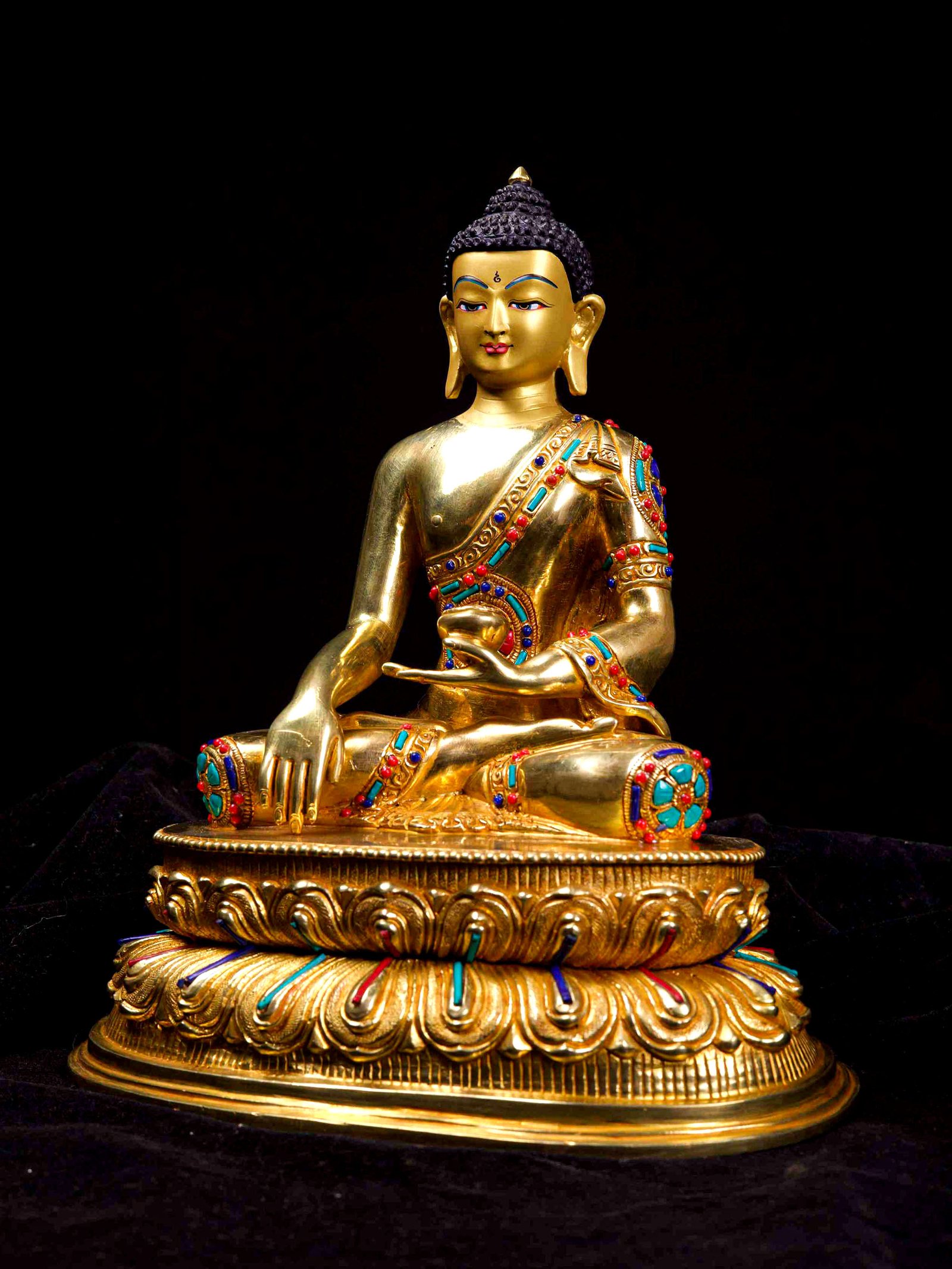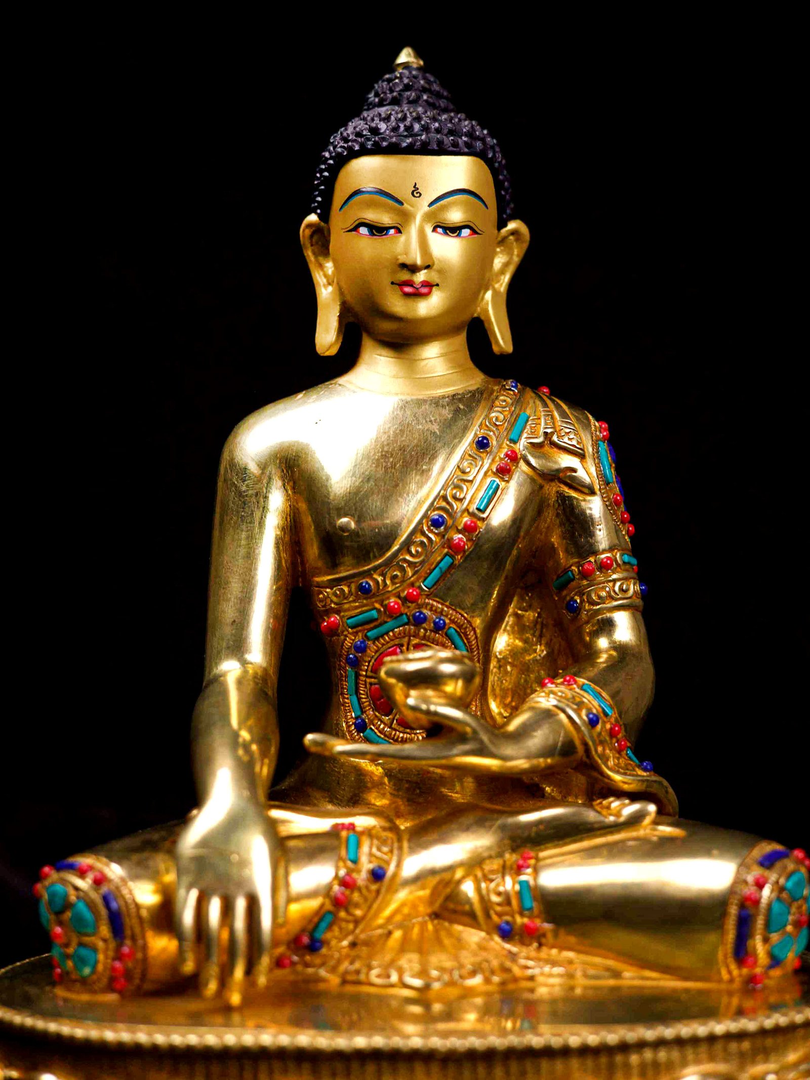 The Shakyamuni Buddha is adorned with an exquisite array of semi-precious stones, including turquoise, coral, and lapis lazuli. These stones are carefully selected and meticulously placed on the Shakyamuni Buddha's surface, adding a touch of opulence and enhancing its overall beauty. Each stone is thoughtfully positioned using a high-quality adhesive, ensuring secure and long-lasting attachment. The vibrant colors and unique patterns of the stones create a captivating contrast against the backdrop of the Shakyamuni Buddha, elevating its visual appeal and making it truly eye-catching. Read More