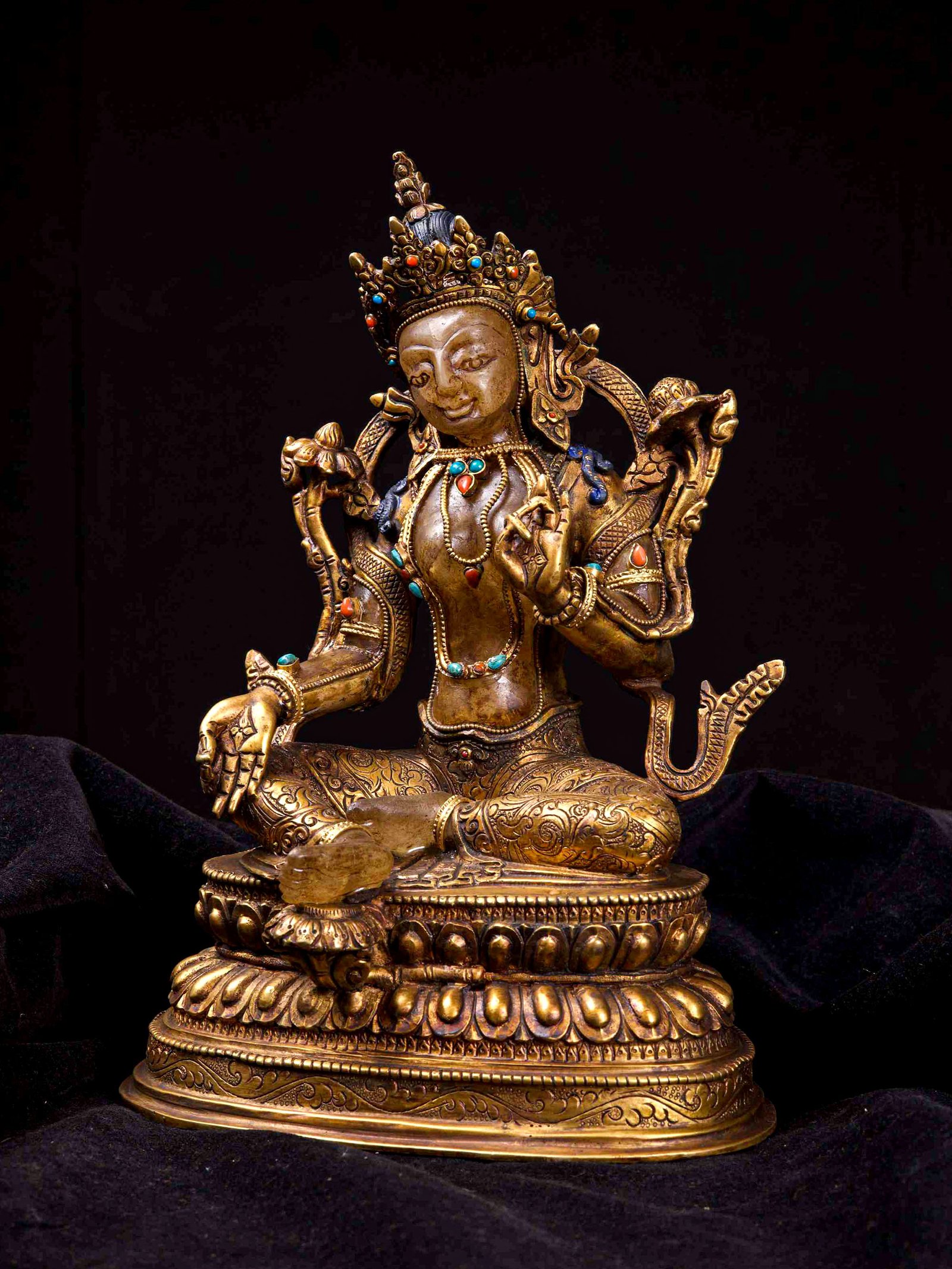 The Green Tara is adorned with an exquisite array of semi-precious stones, including turquoise, coral, and lapis lazuli. These stones are carefully selected and meticulously placed on the Green Tara's surface, adding a touch of opulence and enhancing its overall beauty. Each stone is thoughtfully positioned using a high-quality adhesive, ensuring secure and long-lasting attachment. The vibrant colors and unique patterns of the stones create a captivating contrast against the backdrop of the Green Tara, elevating its visual appeal and making it truly eye-catching. Read More