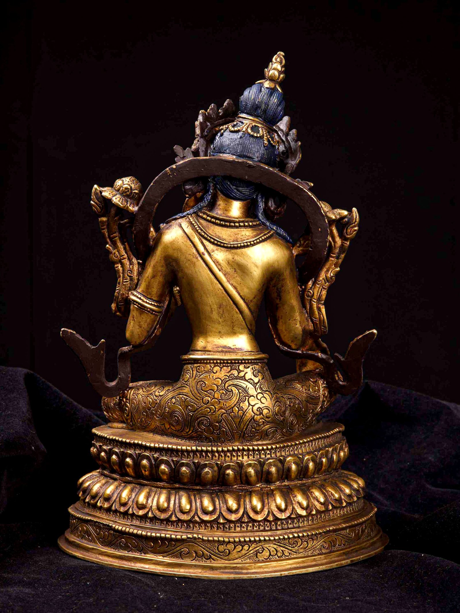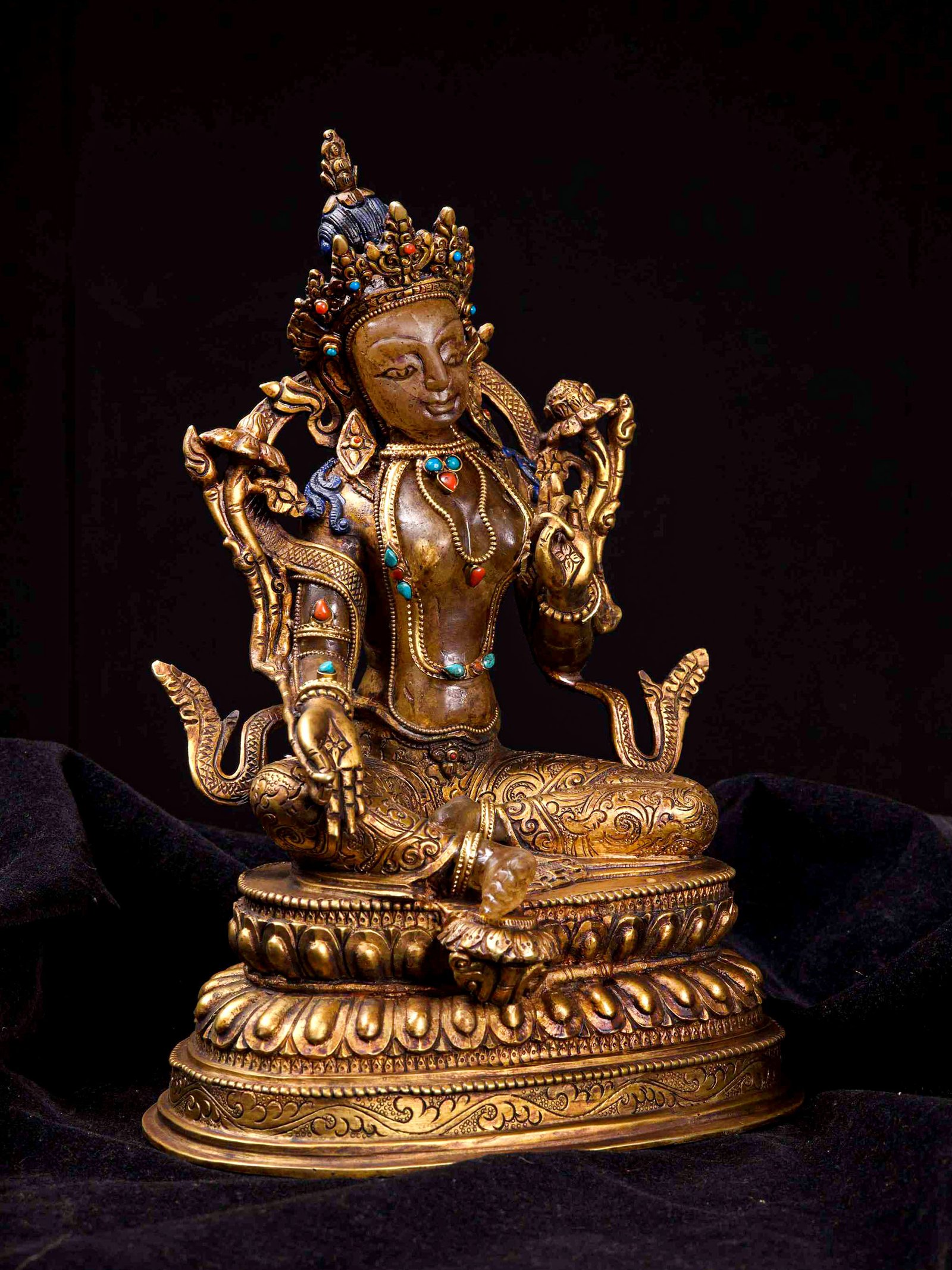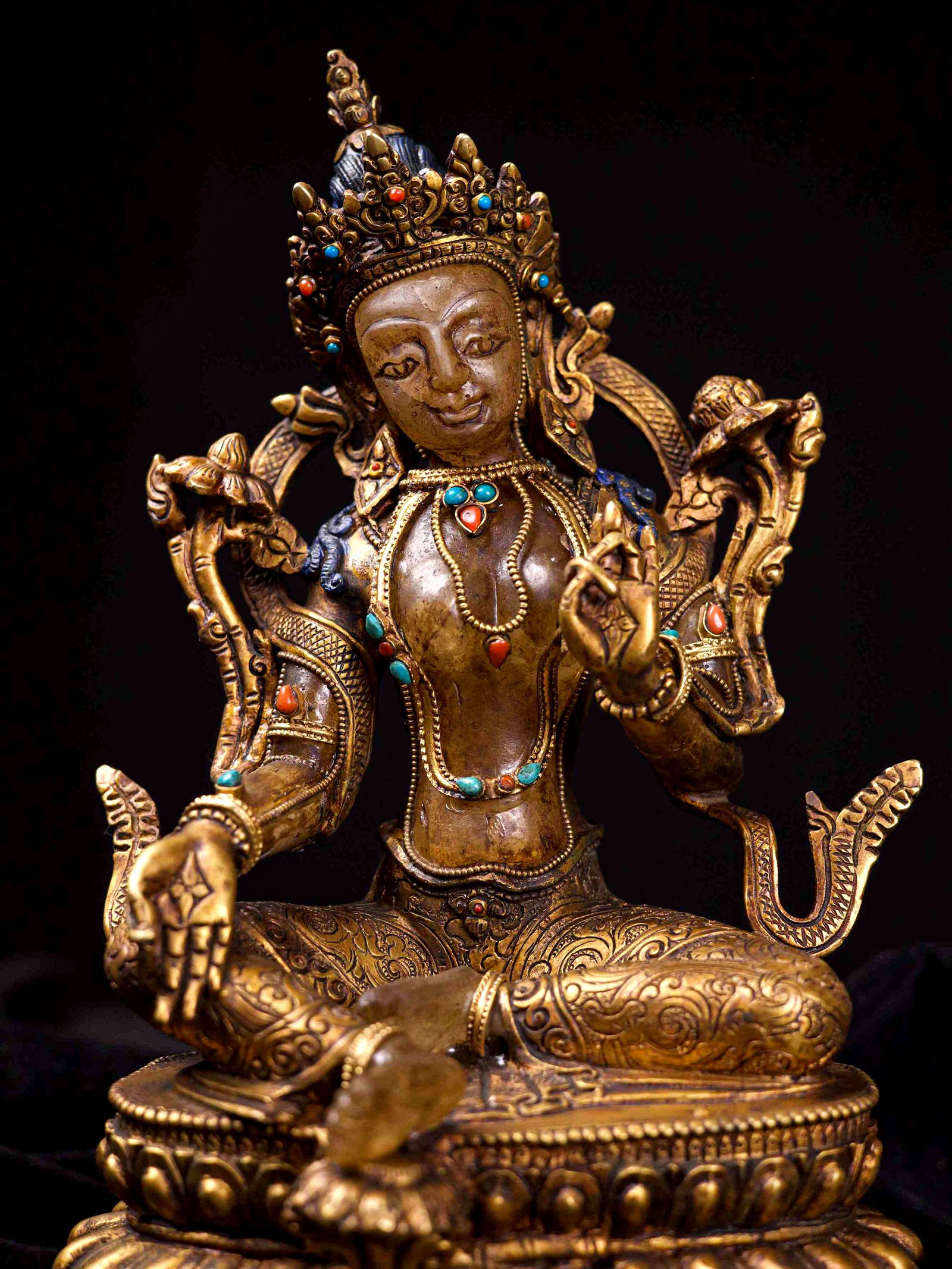 The Green Tara has full gold plated antique finishing. This finishing is a combination of fire mercury gold plating and antique finishing. This traditional technique involves the application of a genuine layer of gold onto the Green Tara using the time-honored process of mercury gold plating. Skilled artisans meticulously handle the amalgamation of gold with mercury, ensuring precise application and a truly authentic result. To enhance its charm further, the Green Tara undergoes an antique finishing process. This meticulous treatment adds a touch of age and character to the gold plating, creating a sense of antiquity. Through careful craftsmanship and the application of specialized techniques, the Green Tara acquires a beautifully aged appearance that adds depth and uniqueness to its overall aesthetic. Read More
