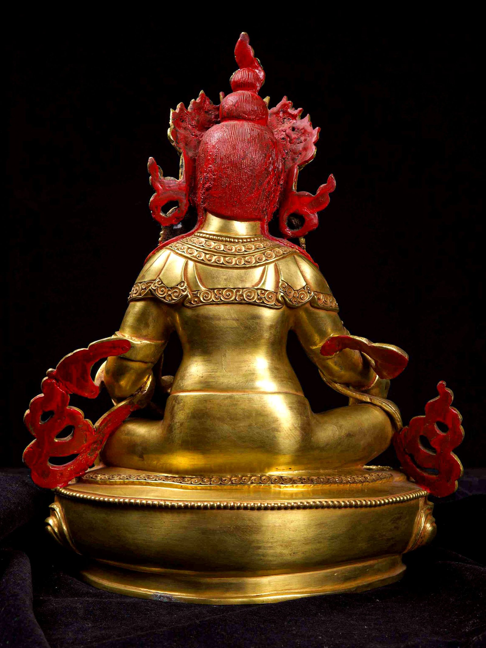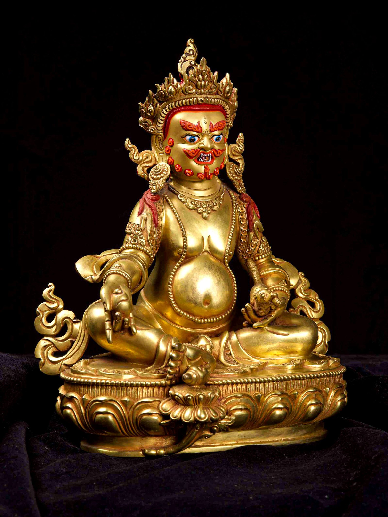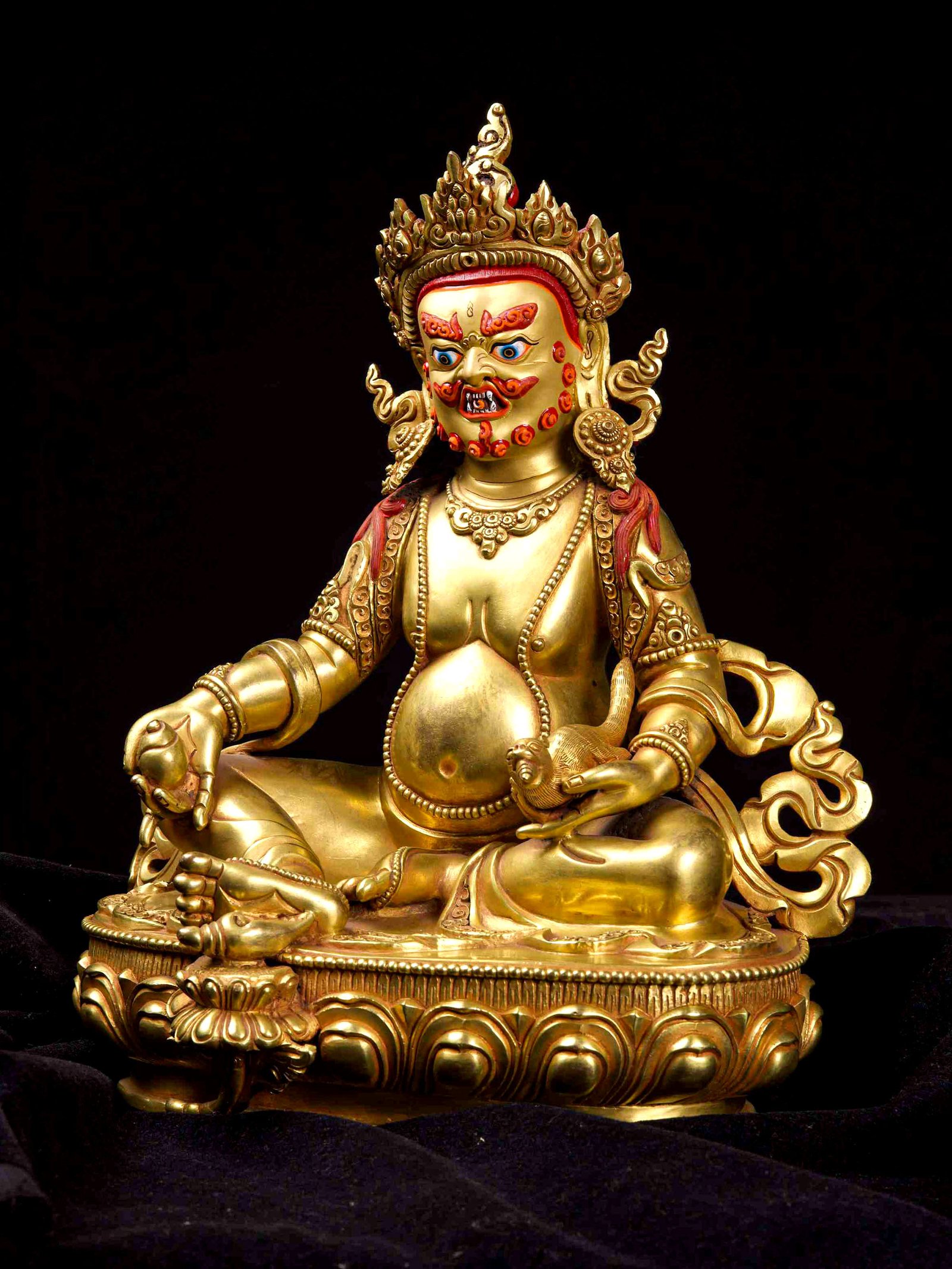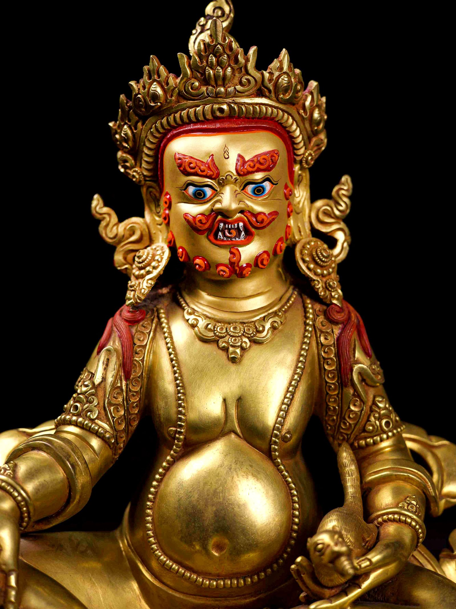 The face of Yellow Jambhala is painted with gold to enhance its significant features, particularly the eyes, and lips. This detailed painting is essential as it brings forth the crucial attributes of the expression of eyes and lips that metal carving alone cannot capture.