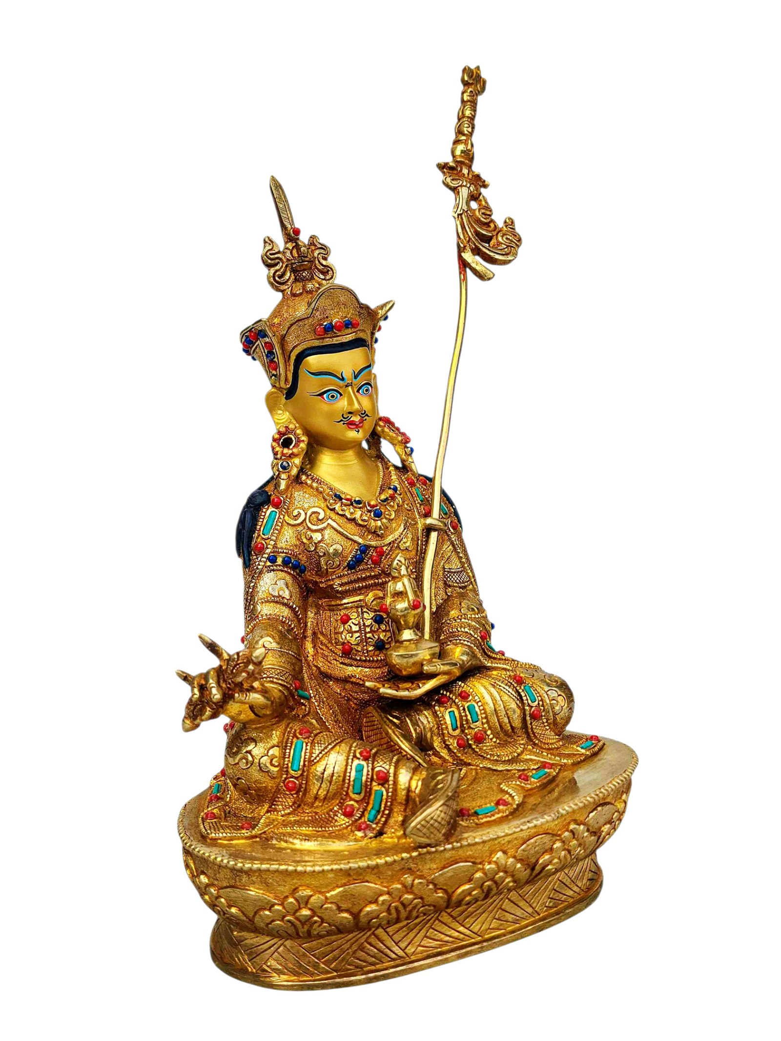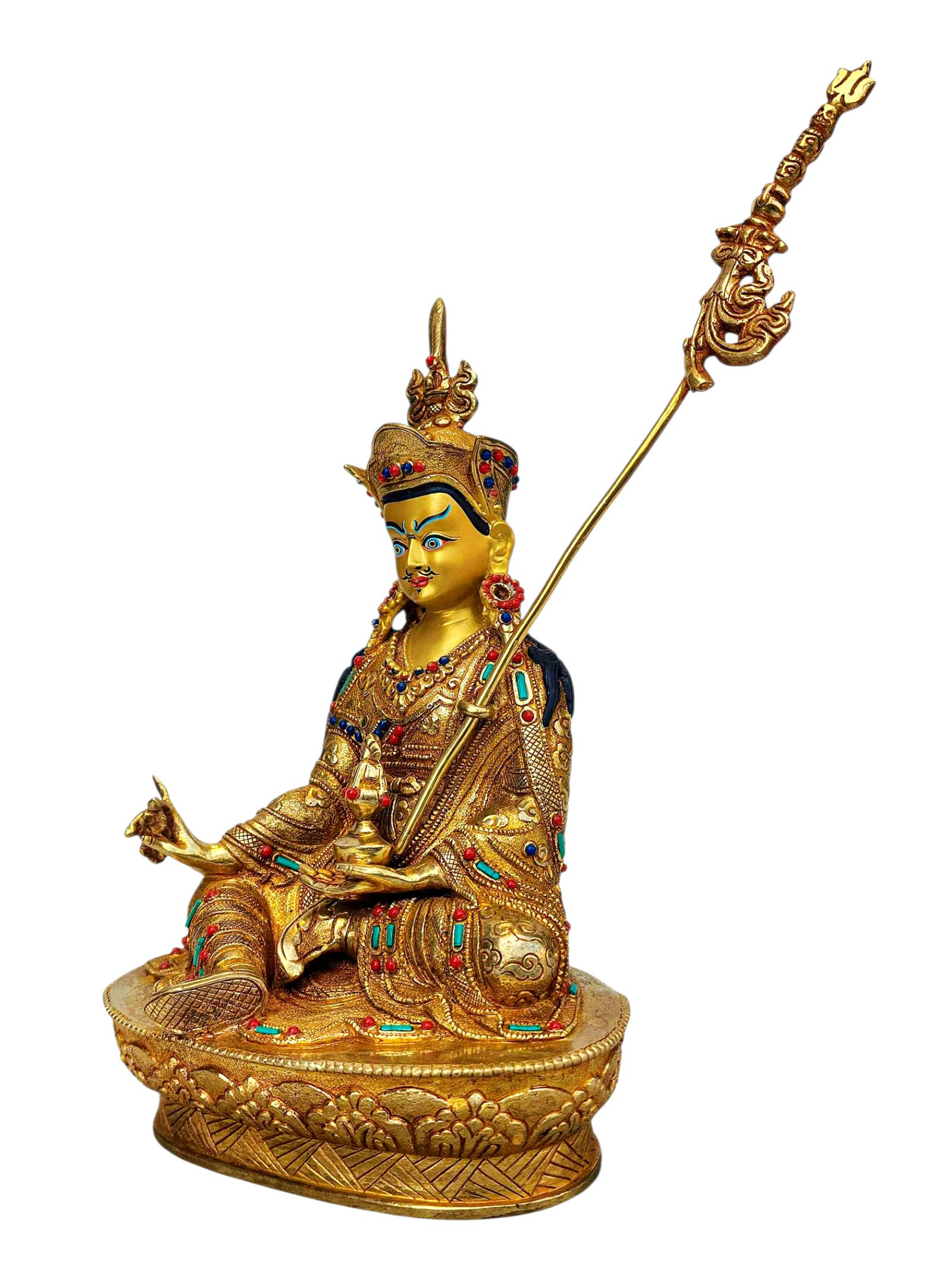 Padmasambhava, Buddhist Handmade Statue, Full Gold Plated, Stone Setting, Face Painted , The lotus-born master, wisdom beyond time