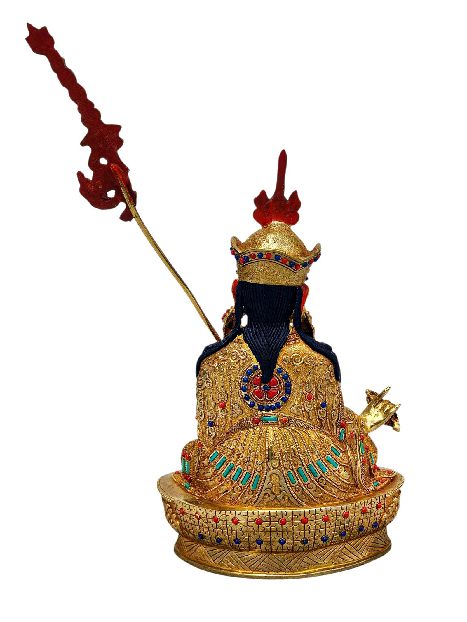 The Padmasambhava is adorned with an exquisite array of semi-precious stones, including turquoise, coral, and lapis lazuli. These stones are carefully selected and meticulously placed on the Padmasambhava's surface, adding a touch of opulence and enhancing its overall beauty. Each stone is thoughtfully positioned using a high-quality adhesive, ensuring secure and long-lasting attachment. The vibrant colors and unique patterns of the stones create a captivating contrast against the backdrop of the Padmasambhava, elevating its visual appeal and making it truly eye-catching. Read More