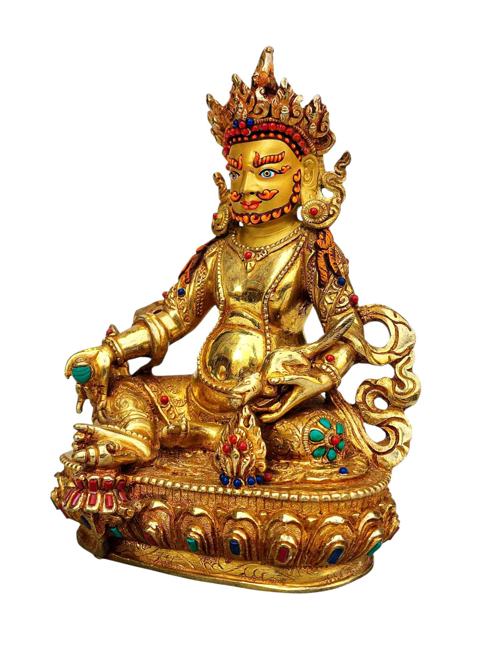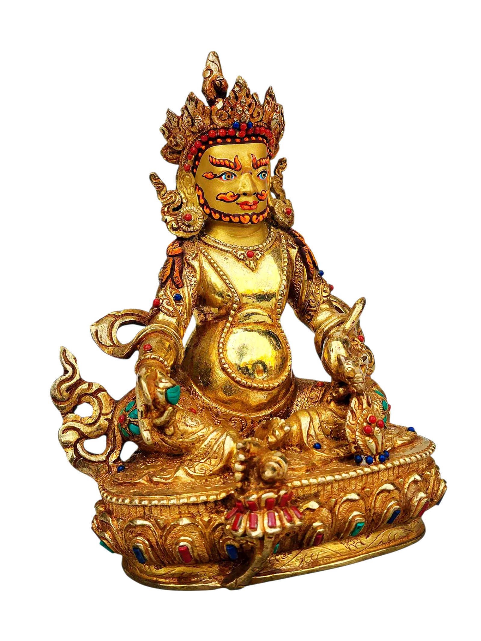 Yellow Jambhala, Buddhist Handmade Statue, Full Gold Plated, Stone Setting, Face Painted , fostering generosity and abundance