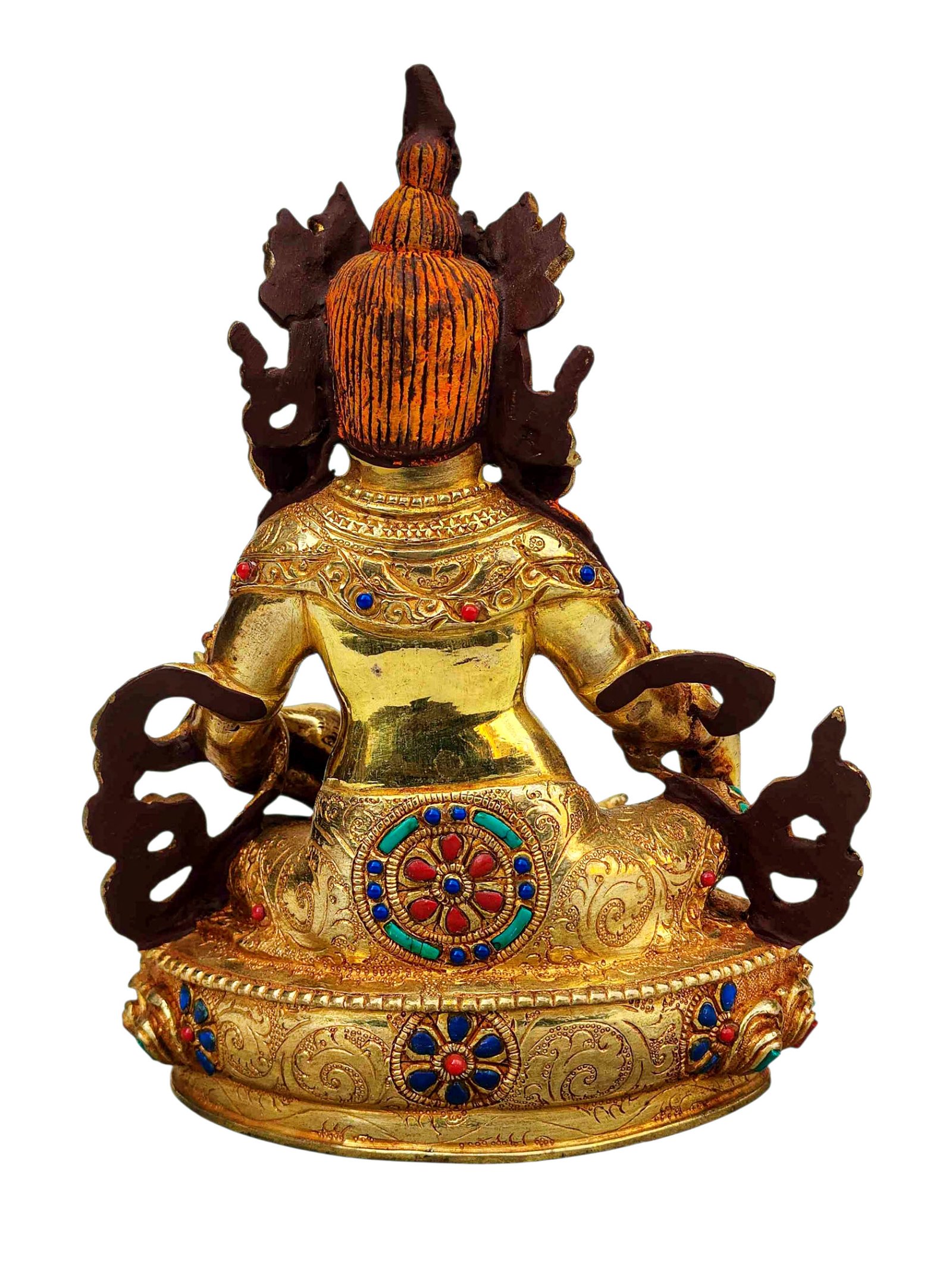 The face of Yellow Jambhala is painted with gold to enhance its significant features, particularly the eyes, and lips. This detailed painting is essential as it brings forth the crucial attributes of the expression of eyes and lips that metal carving alone cannot capture.