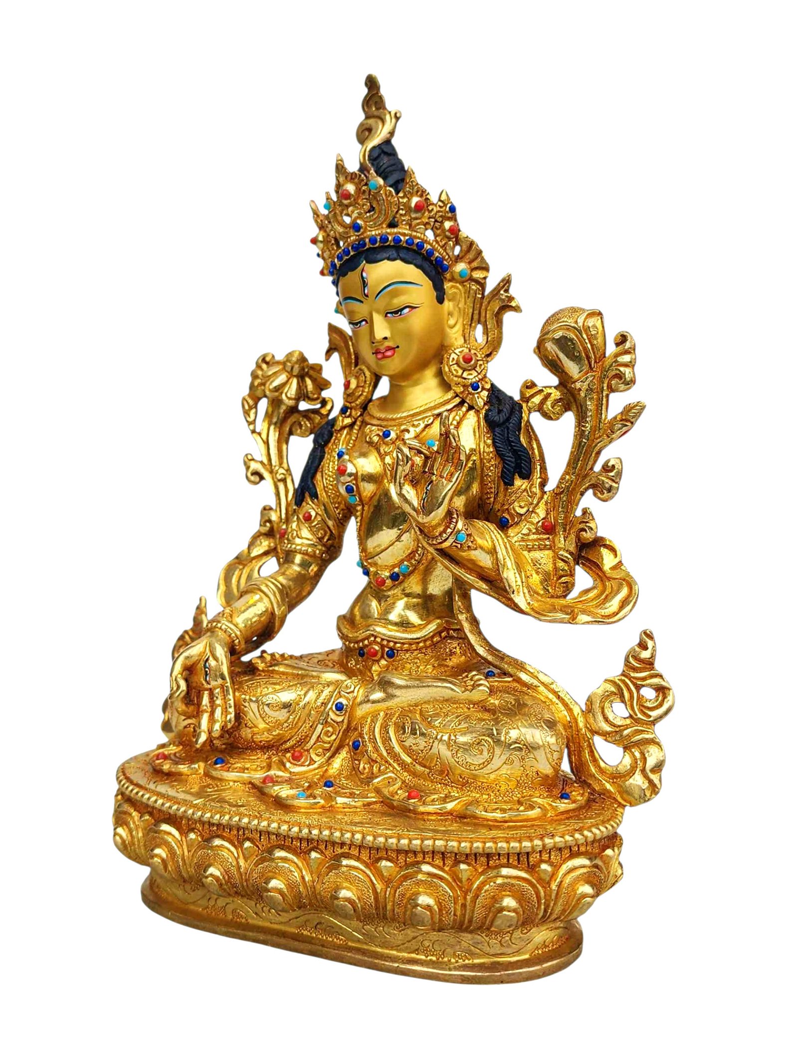 White Tara, Buddhist Handmade Statue, Full Gold Plated, Stone Setting, Face Painted , Goddess of longevity, healing, and serene compassion