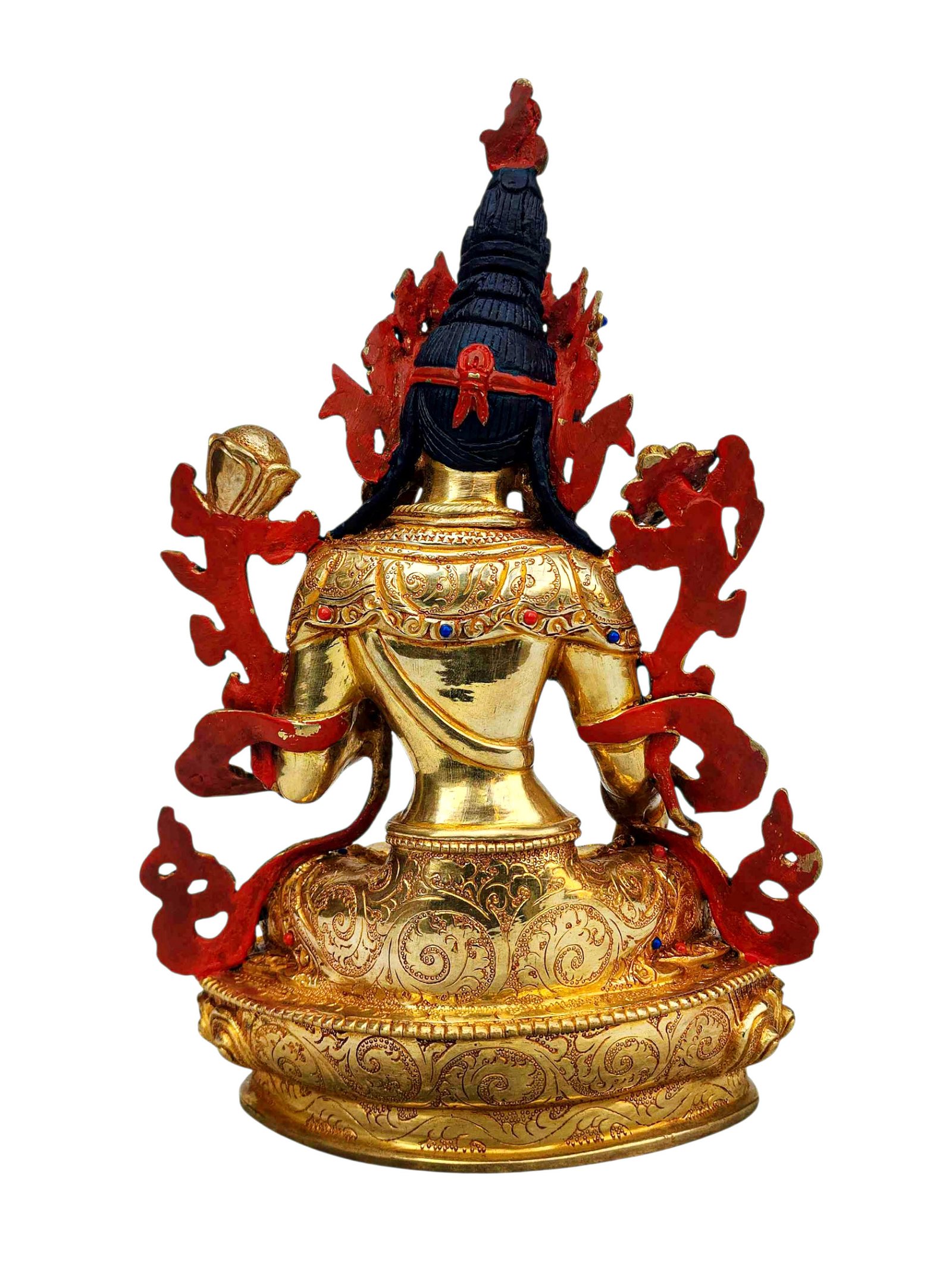 This White Tara is finished with full gold plating. also known as mercury gold plating or fire gold plating. This traditional technique involves the application of a genuine layer of gold onto the White Tara. Referred to as mercury gold plating, it is considered the correct and authentic form of gold plating in Nepal. Despite being more expensive than electroplating, this traditional mercury gold plating is gaining popularity again in Nepal. People are drawn to its authenticity, longevity, and the unmatched beauty it brings to the White Tara. The resurgence of interest in this traditional form of gold plating reflects a growing appreciation for the craftsmanship and cultural heritage of Nepal Read More
