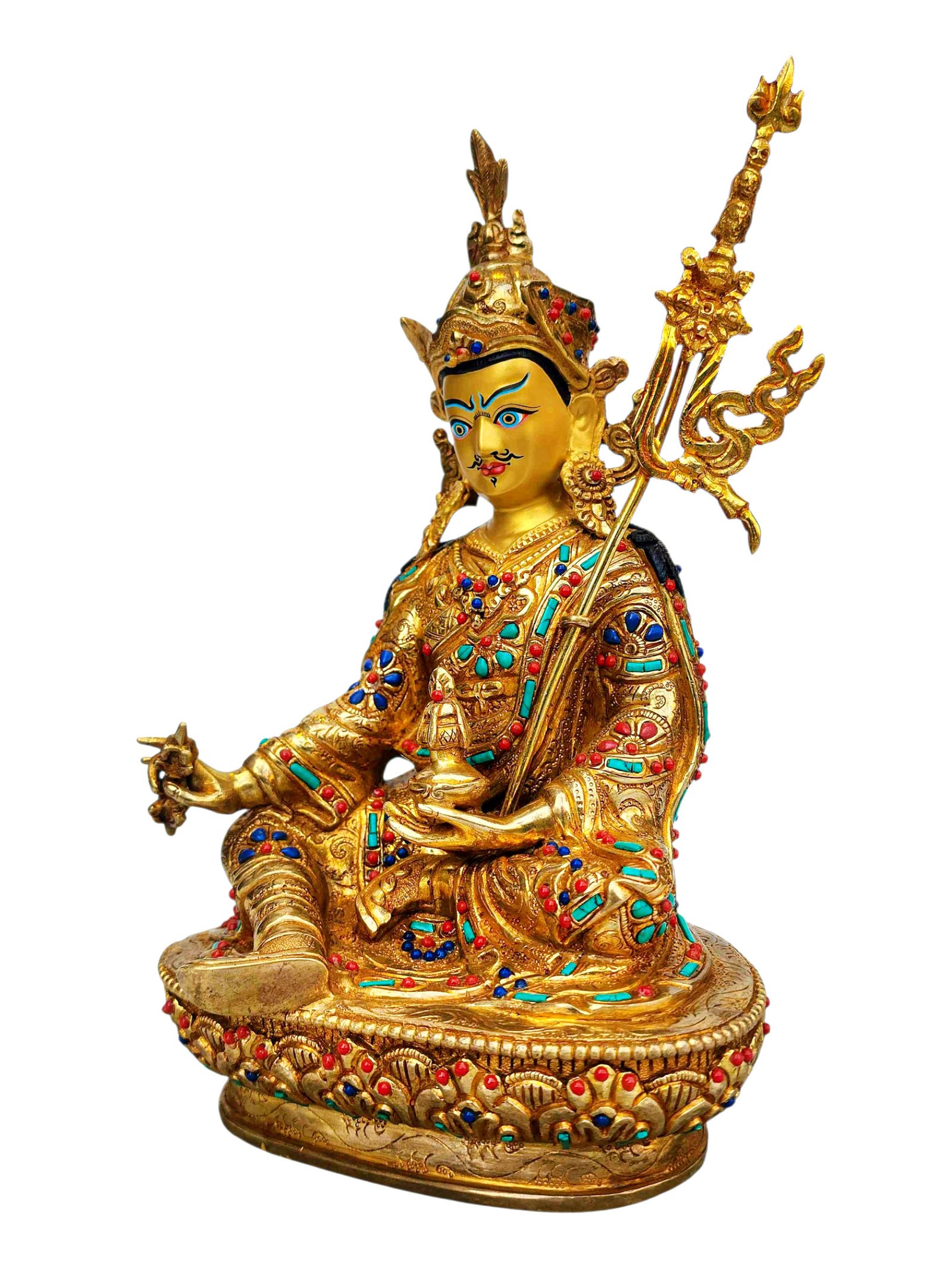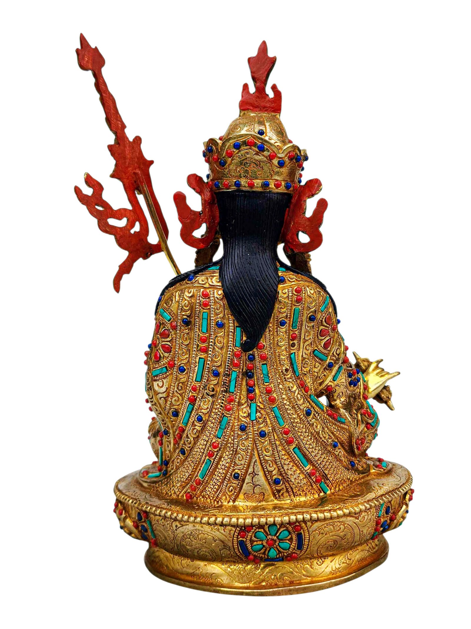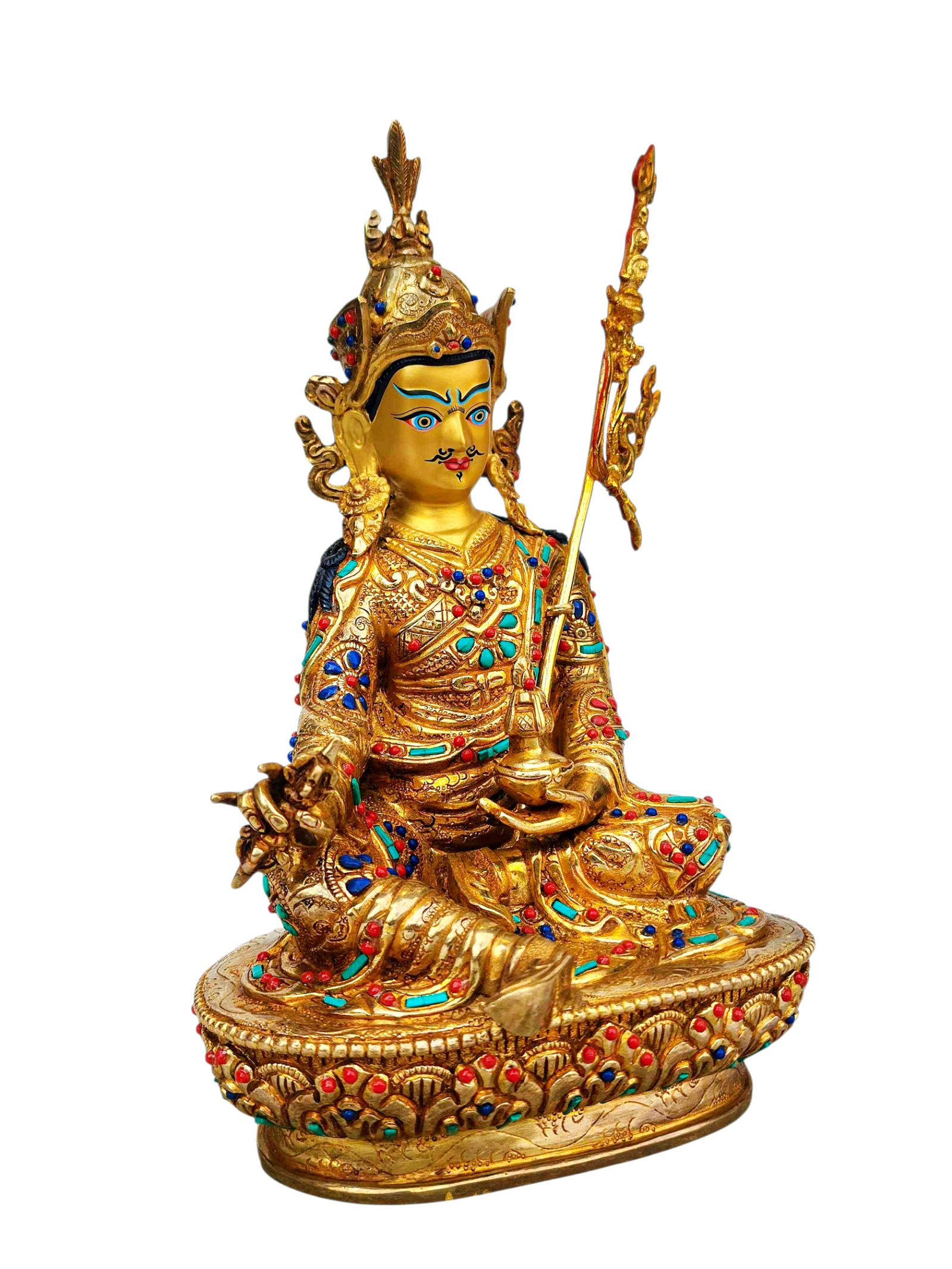 Padmasambhava, Buddhist Handmade Statue, Full Gold Plated, Stone Setting, Face Painted , The lotus-born master, wisdom beyond time