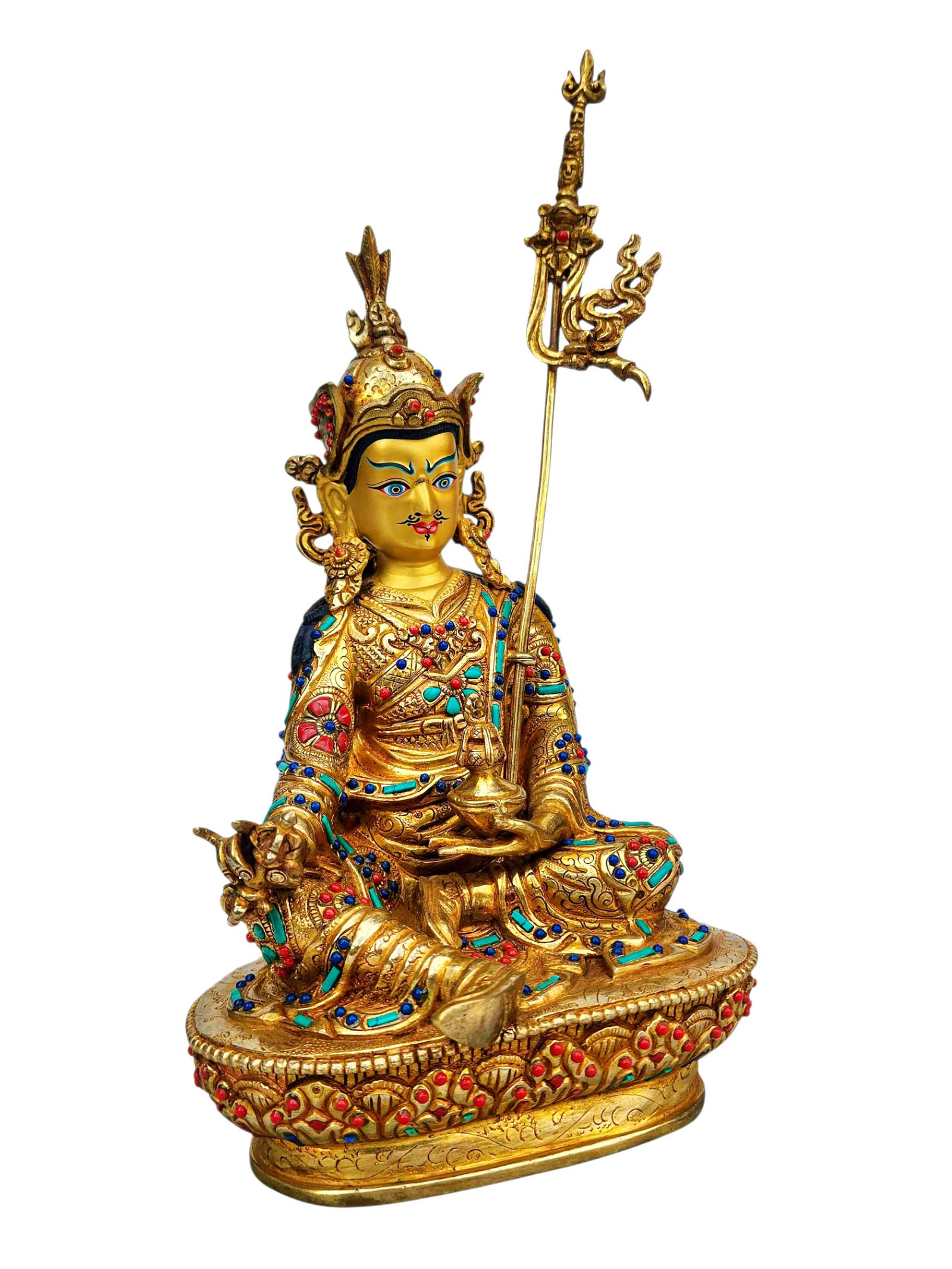Padmasambhava, Buddhist Handmade Statue, Full Gold Plated, Stone Setting, Face Painted , The lotus-born master, wisdom beyond time